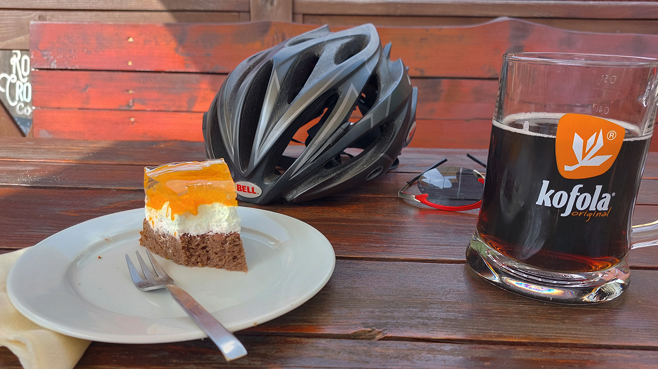 V Kráľovej Lehote sa ešte ubezpečím, že o nejakú hodinku mi skutočne ide osobák, čiže mám akurát čas na odmenu. Takže na križovatke poniže dediny uzatváram okruh a v známej kolibe Červený kút dobíjam baterky poriadnou dávkou kalórií. Taká cyklistická prícestná klasika, skoro ako z reklamy.