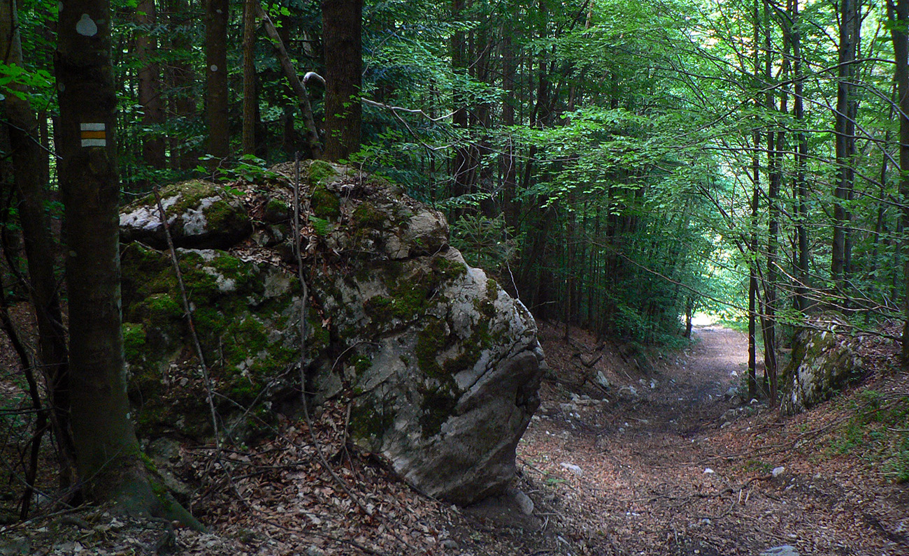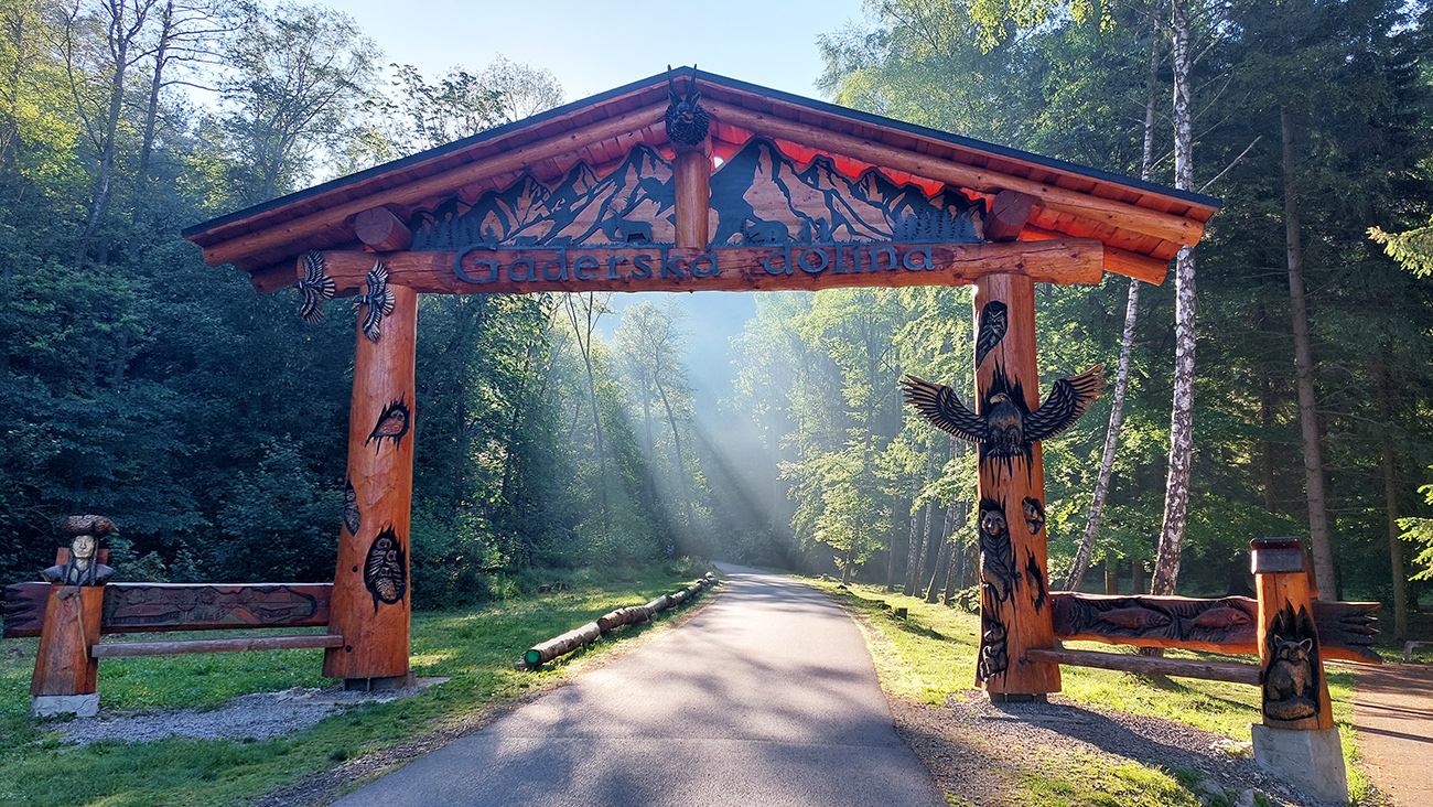 Takže príjemné, chladivé ráno o siedmej, symbolický štart od drevenej brány do Gadera a pohodové cupkanie po hladkej ceste, väčšinou proti slnku. Ale tu nie je problém sa za dobrými výhľadmi na bralá aj za poklusu otočiť, zakopnutie nehrozí. Jedine o slimáka - mali asi preteky či čo, lebo ich všade bolo... Malá terénna vsuvka cez odbočku ku hradu, inak asfalt až k Čertovej bráne.