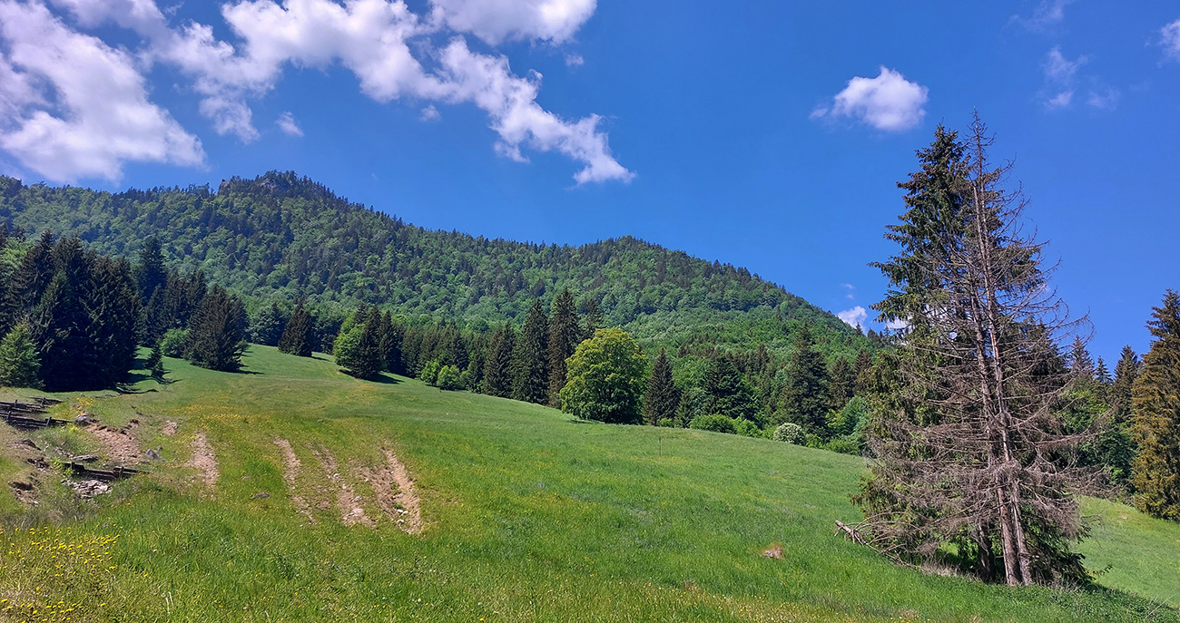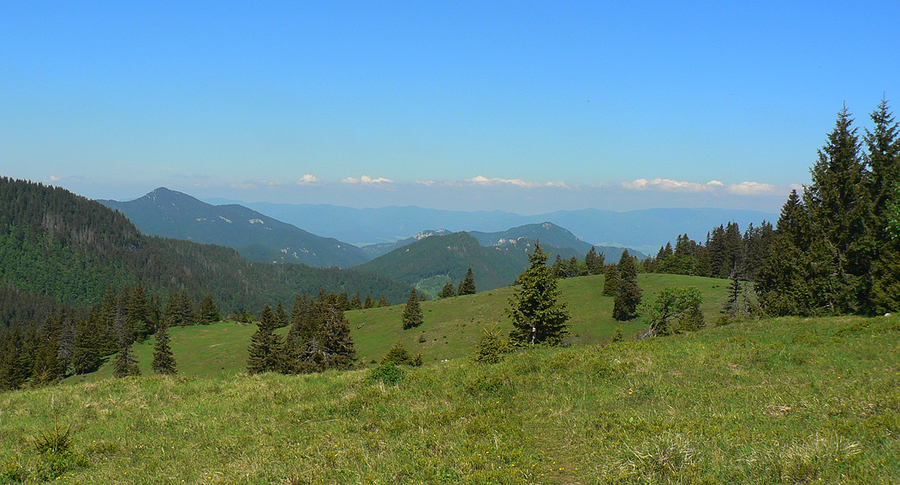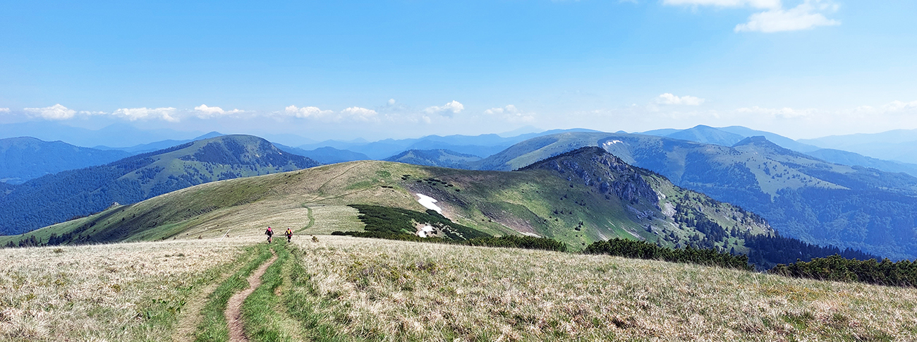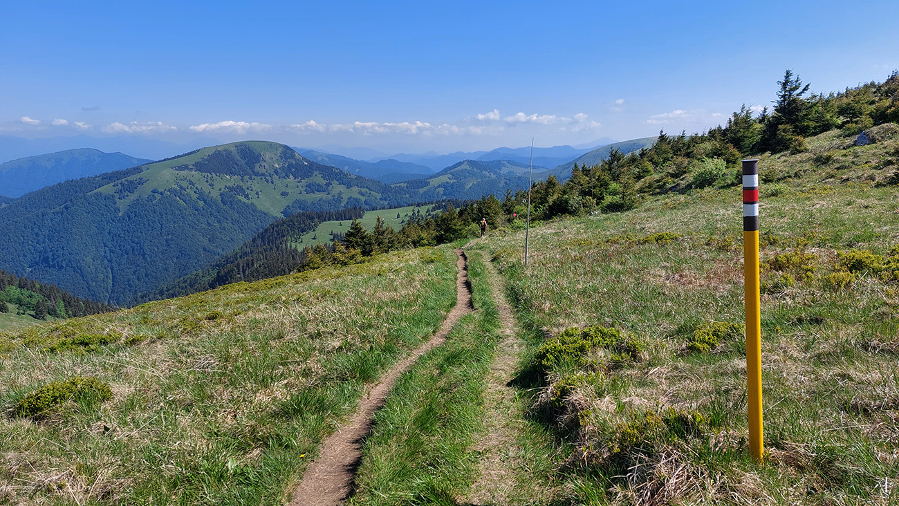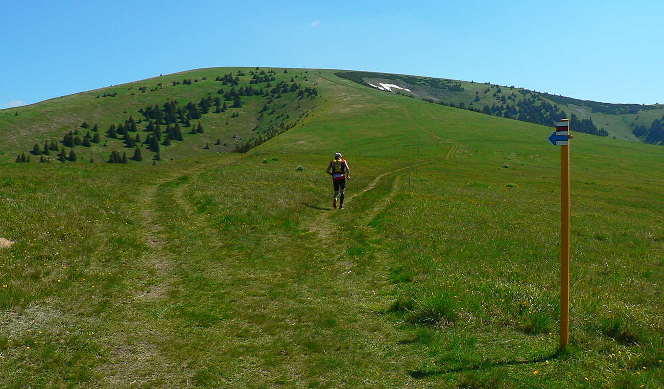 Potom už odbočka popri chate Drobkov a poriadna strmina hore na hrebeň. Príjemný tieň v lese a príjemný vánok na holiach. Hrebeň pozná každý, tak čo už o ňom? Hlavne ale nad lesom ma dobehol ultralegendárny Igor Buček, tak som chvíľu pootravoval a zviezol som sa popri ňom až pod Ploskú. Až tak som otravoval, že som zabudol na Koniarkach odbočiť dole do Necpalskej :-) Takže davaj kúsok nazad a pre zmenu poriadna strmina smerom dole. Tá sa z pekného chodníka pod „Jančiho prameňom“ zmenila na hnusnú, miestami rozrytú zvážnicu – spádnicu a dole v Balcierove to o moc lepšie nevyzeralo, tak som s napätím čakal, čo bude ďalej.