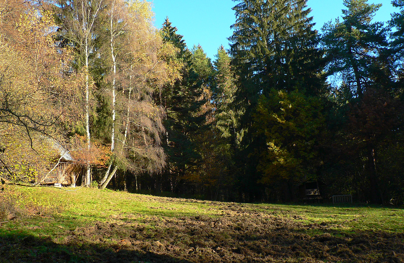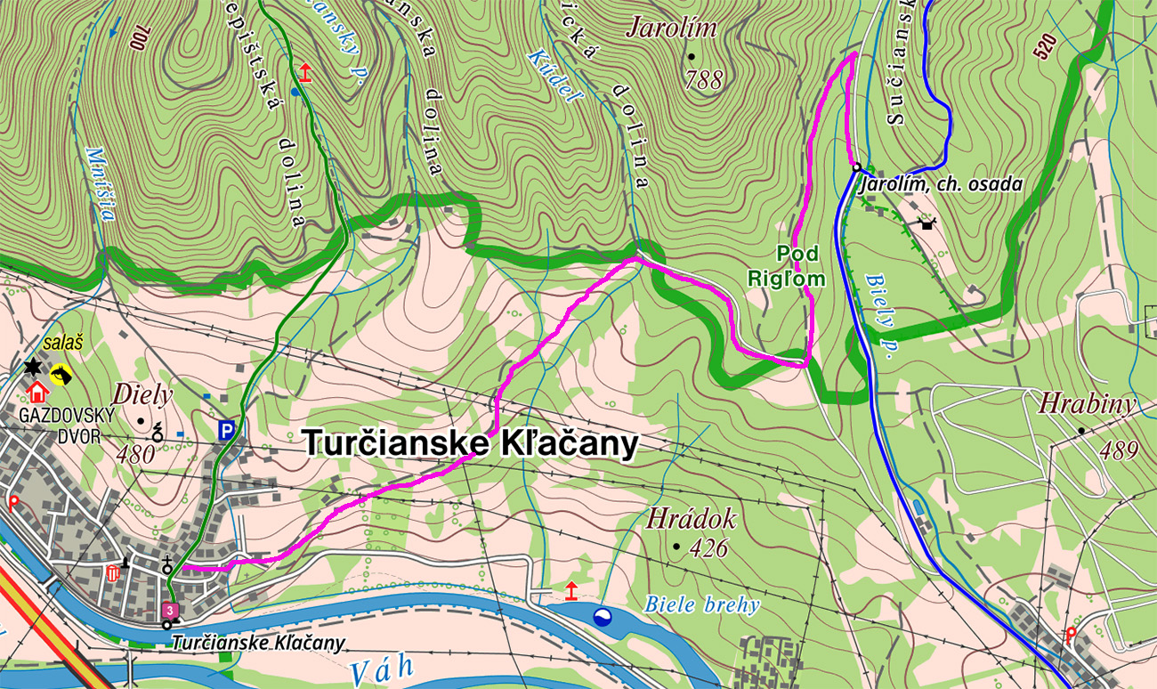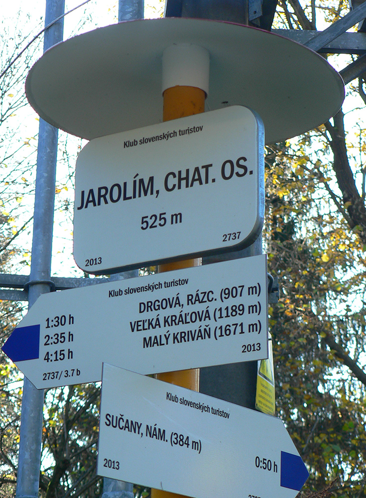 Návod na začiatok je fakt jednoduchý: kým z autobusu všetci valia po zelenej na Maguru, ja pri kostole bočím doprava a ponad cintorín ma pekná cesta vedie krovinovými tunelmi a krížom cez veľkú lúku na okraj lesa. Tam sa napájam na koniec lesnej asfaltky, po pár sto metroch sa z nej vrhám doľava a nemenej príjemnou lesnou cestou krátko stúpam ku krmelcom a dlhšie klesám v traverze na dno Sučianskej doliny. Potom ešte chvíľu dole dolinou a už som pri chatovej osade Jarolím, pri smerovníku modrej značky. Trafí každý, mapka je aj v galérii: