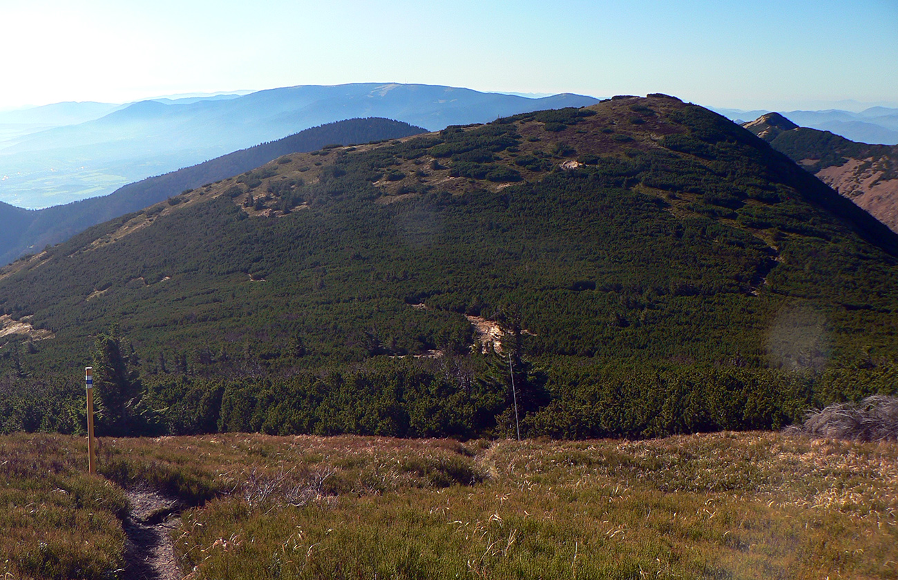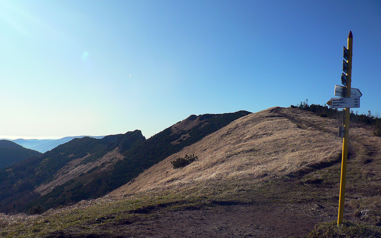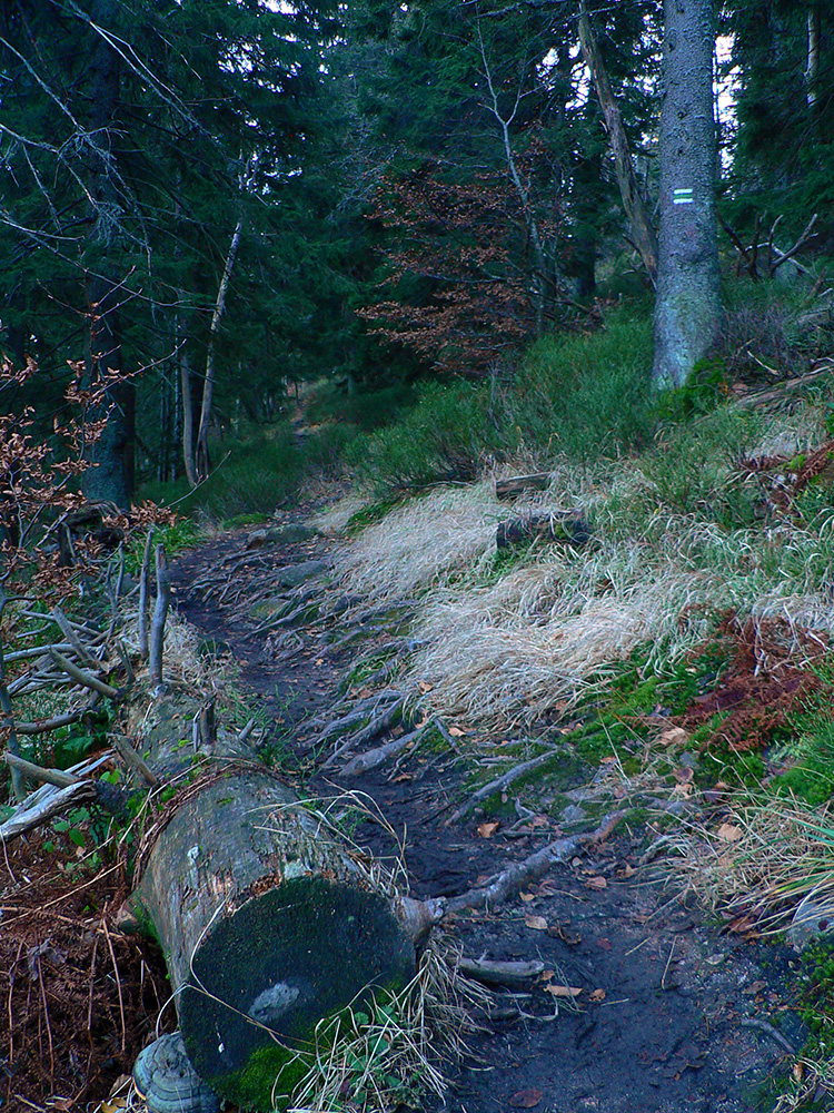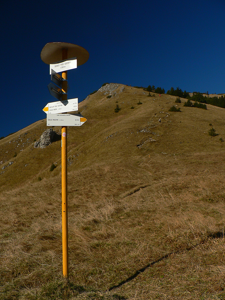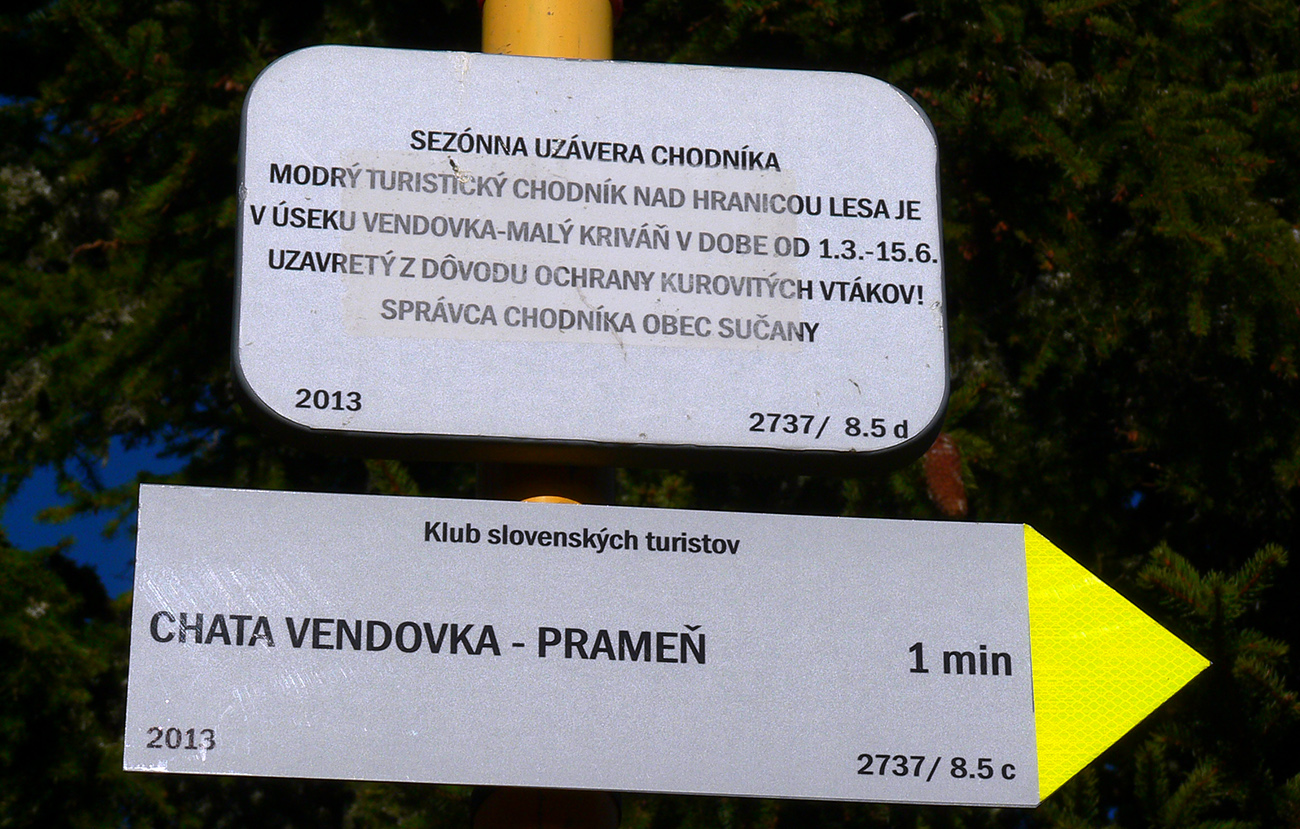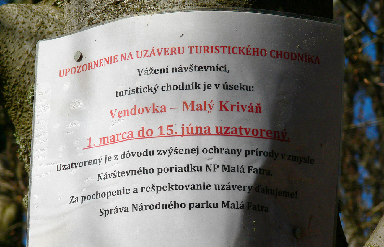 Ďalej už je to jednoduché, po modrej direkt hore. Začiatok síce hnusne lesohospodársky, aj s rúbaniskami a vymletou cestou, potom ale farebný les a nad lesom, nad Vendovkou, úúúplne iný svet. A nikde nikoho, tadeto moc ľudí nechodí, aj keď dole pár áut stálo. Inak sranda, že ani jedno z okresu :-) Čo je tu nanič, že chodník nad lesom je na jar zavretý kvôli ochrane prírody, ale biedna ceduľa s upozornením visí až na Veľkej Kráľovej. Chcem vidieť, ako sa tam niekto dotrepe spotený po vyše dvoch hodinách stúpania, prečíta, zvesí hlavu a otočí to nazad dole... Možno bolo dačo kedysi aj dole, ale taká zalaminovaná A3 dlho nevydrží, že?