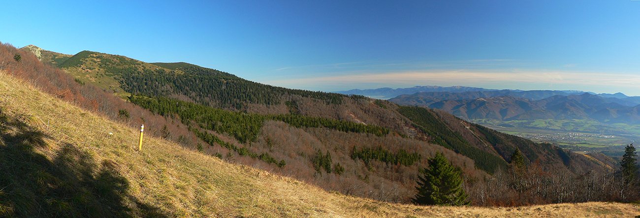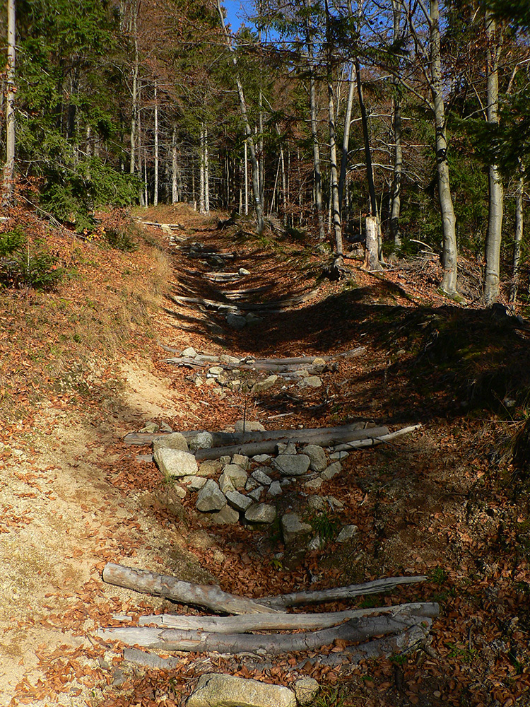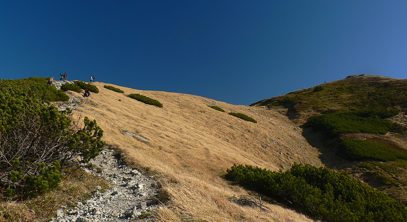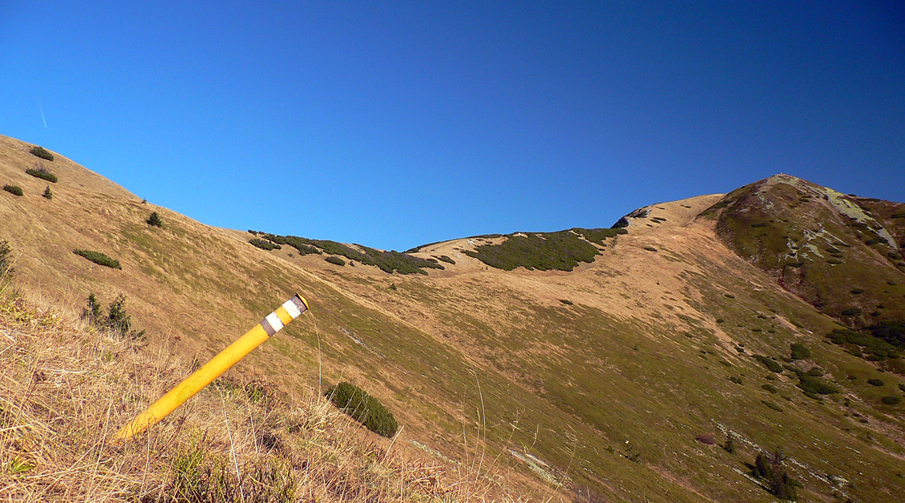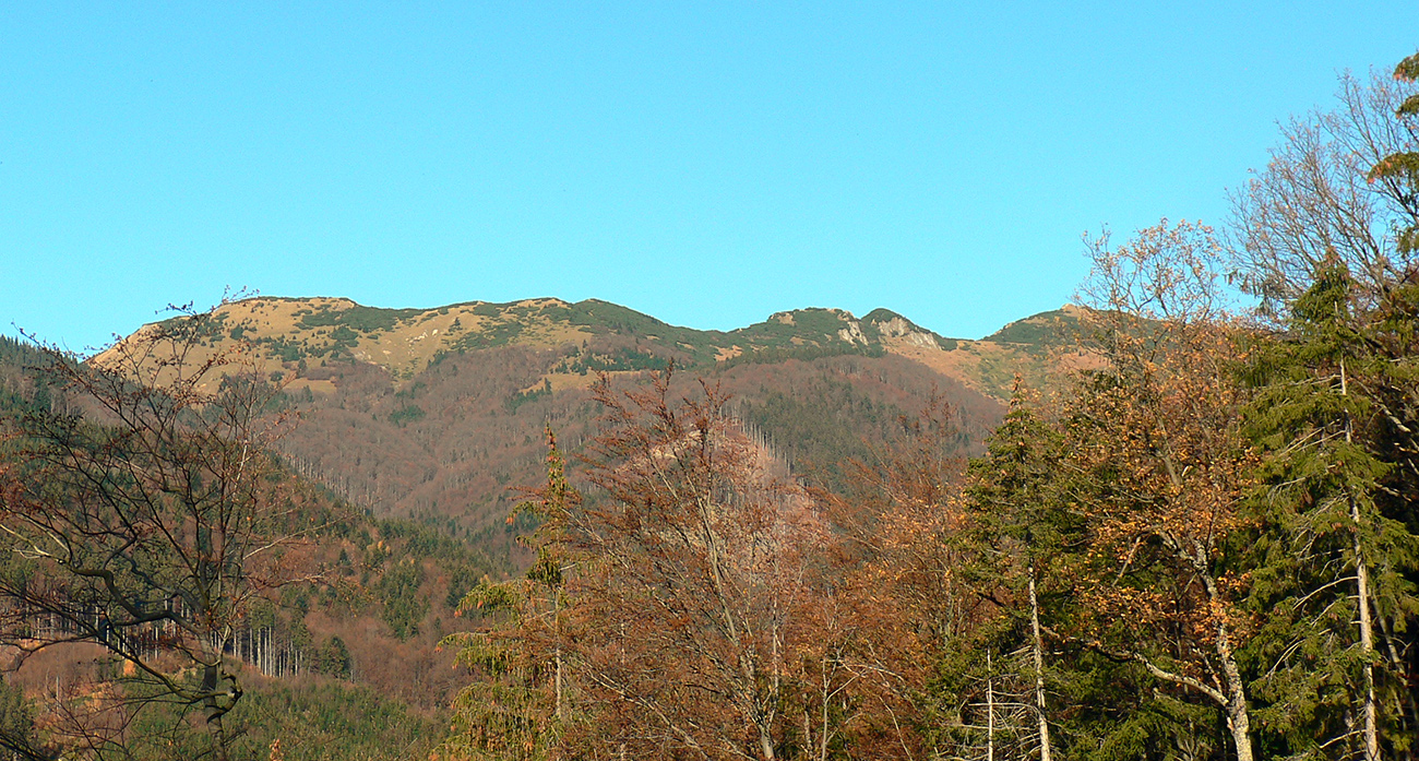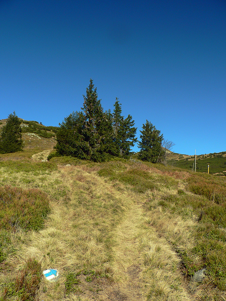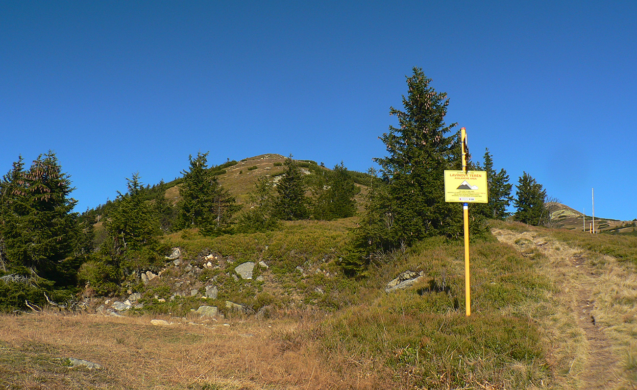 Ďalej už je to jednoduché, po modrej direkt hore. Začiatok síce hnusne lesohospodársky, aj s rúbaniskami a vymletou cestou, potom ale farebný les a nad lesom, nad Vendovkou, úúúplne iný svet. A nikde nikoho, tadeto moc ľudí nechodí, aj keď dole pár áut stálo. Inak sranda, že ani jedno z okresu :-) Čo je tu nanič, že chodník nad lesom je na jar zavretý kvôli ochrane prírody, ale biedna ceduľa s upozornením visí až na Veľkej Kráľovej. Chcem vidieť, ako sa tam niekto dotrepe spotený po vyše dvoch hodinách stúpania, prečíta, zvesí hlavu a otočí to nazad dole... Možno bolo dačo kedysi aj dole, ale taká zalaminovaná A3 dlho nevydrží, že?