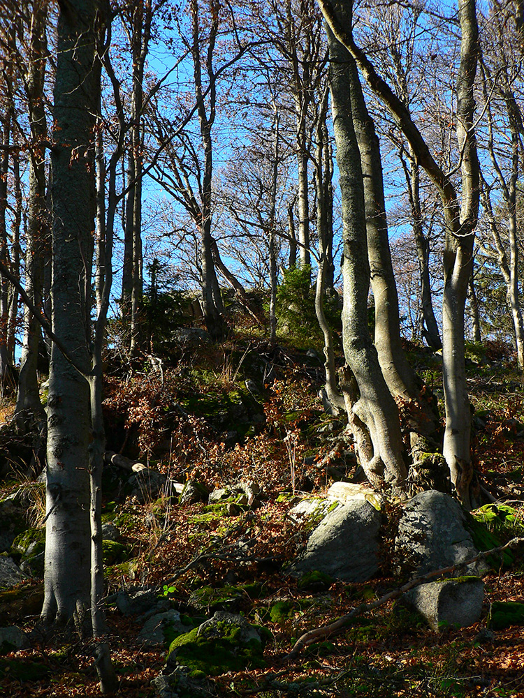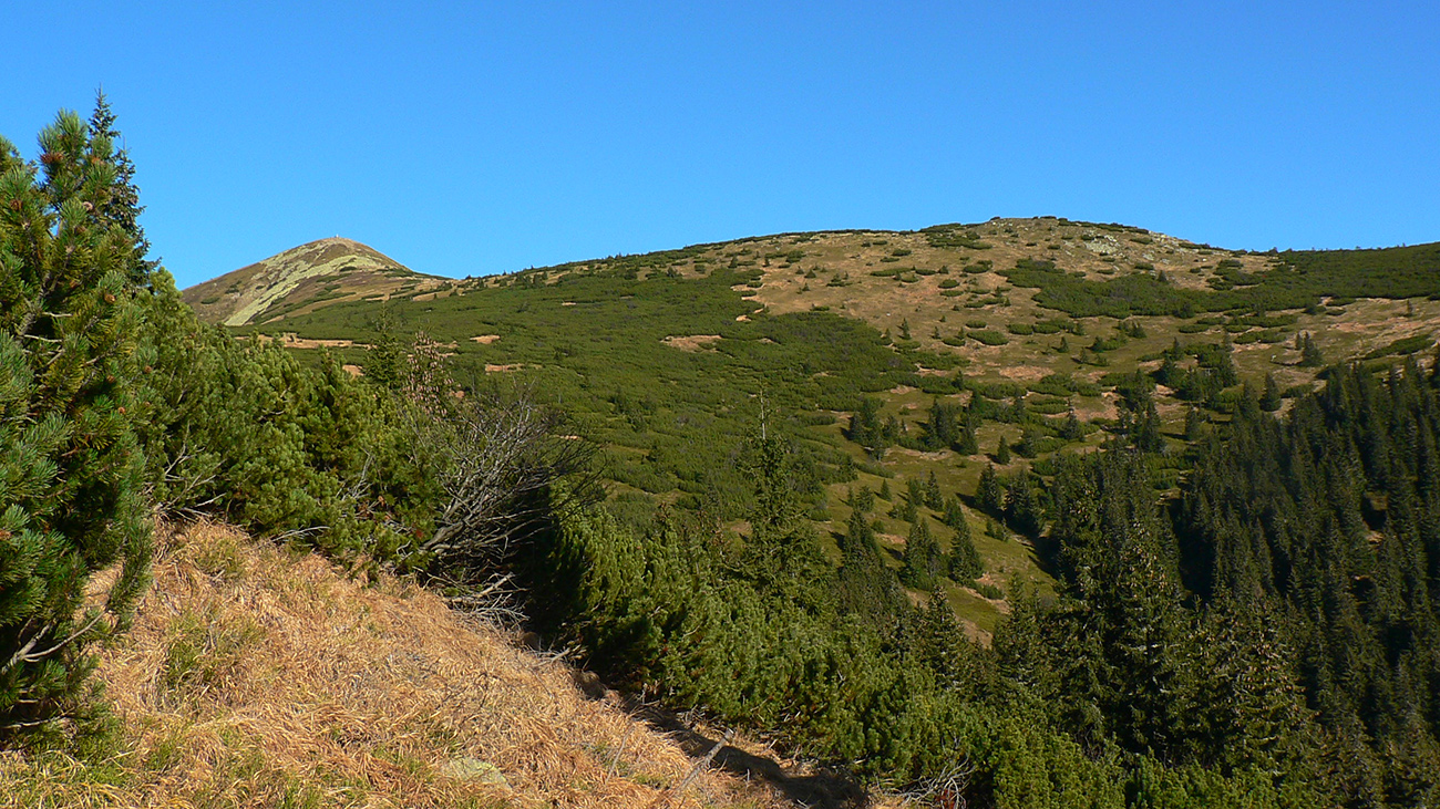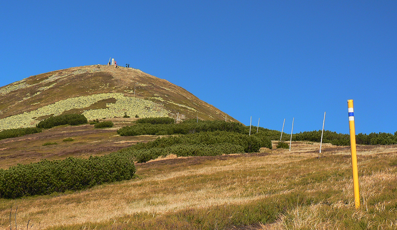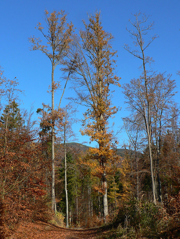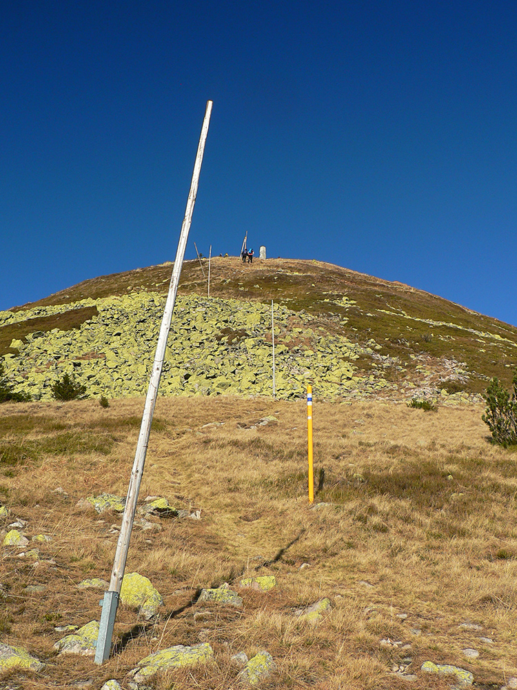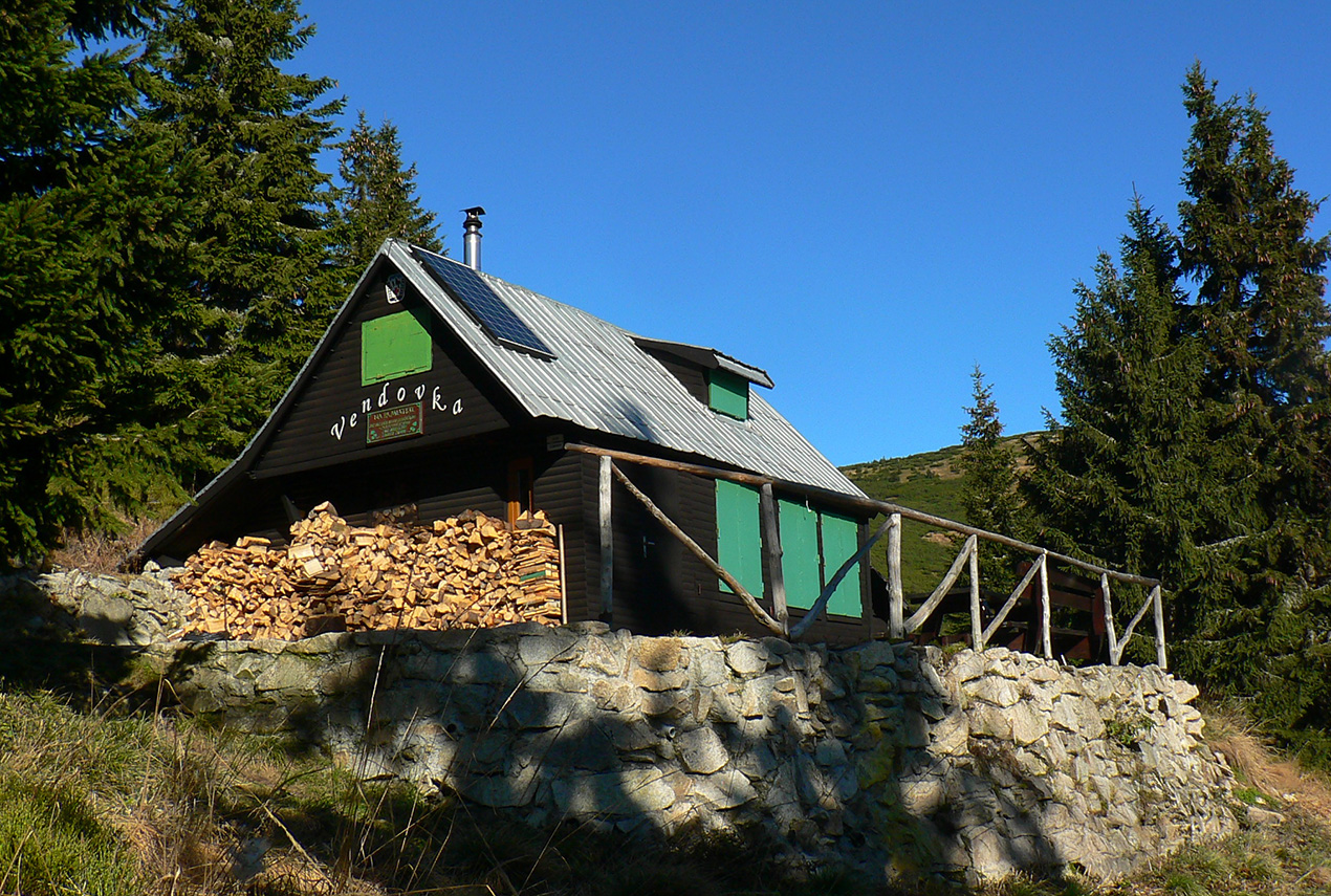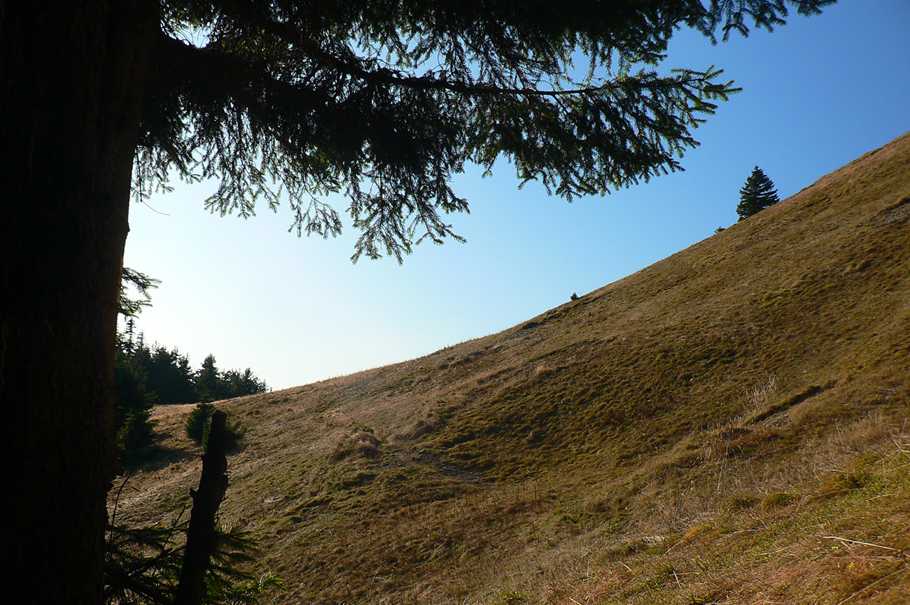 Ďalej už je to jednoduché, po modrej direkt hore. Začiatok síce hnusne lesohospodársky, aj s rúbaniskami a vymletou cestou, potom ale farebný les a nad lesom, nad Vendovkou, úúúplne iný svet. A nikde nikoho, tadeto moc ľudí nechodí, aj keď dole pár áut stálo. Inak sranda, že ani jedno z okresu :-) Čo je tu nanič, že chodník nad lesom je na jar zavretý kvôli ochrane prírody, ale biedna ceduľa s upozornením visí až na Veľkej Kráľovej. Chcem vidieť, ako sa tam niekto dotrepe spotený po vyše dvoch hodinách stúpania, prečíta, zvesí hlavu a otočí to nazad dole... Možno bolo dačo kedysi aj dole, ale taká zalaminovaná A3 dlho nevydrží, že?