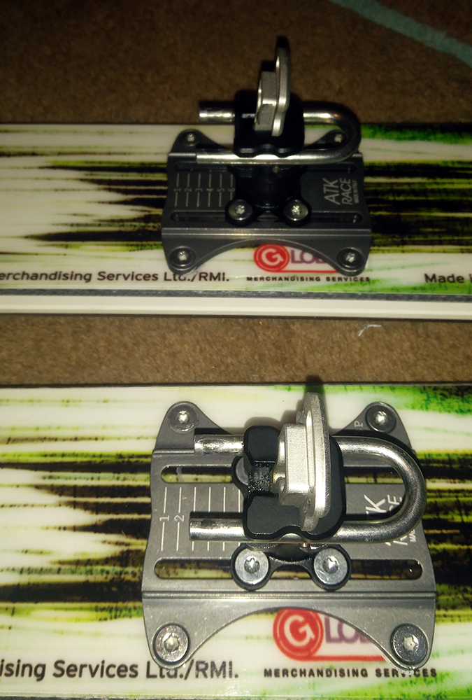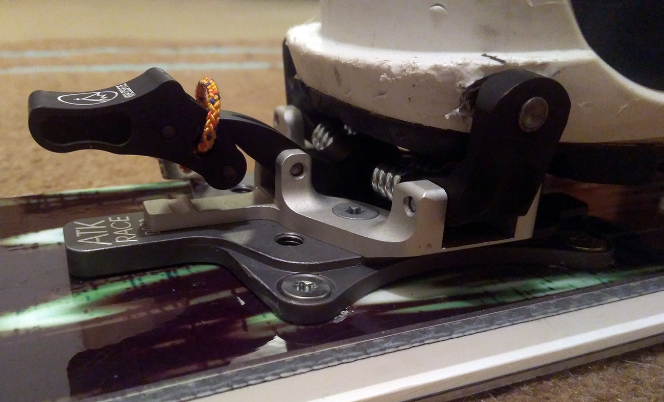 Viazanie som použil na trošku špeciálnu kombináciu. U ATK som zbadal, že ich ambasádor Cala Cimenti použil ATK Trofeo (de facto rovnaká trieda) na širokých XXL podložkách na širokej lyži a celý komplet použil na zlyžovanie Gasherbrumu VII (link TU ). Tak reku keď to funguje overené v takýchto extrémoch, tak snáď to pôjde aj na našich kopcoch. Fotky teda zobrazujú Kreuzspitze SCTT montované na podložkách ATK XXL R03 AP a podložky sú vŕtané (rozteč 6x6cm) do lyží Head špeciálnej edície Motörhead Rock n Roll (šírka 92 mm v strede). Pri doterajšom (síce krátkom) použití sa nevyskytol žiadny problém s viazaním v tomto kombe. Všetko hrá ako má: ľahko, rýchlo, jednoducho.