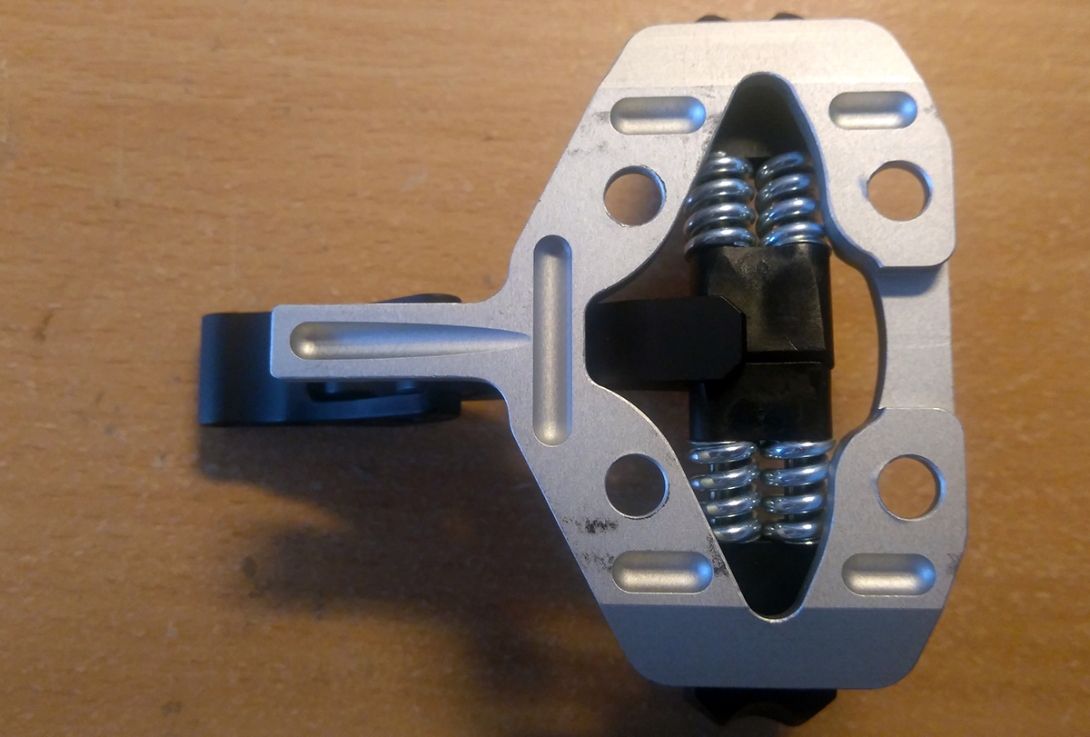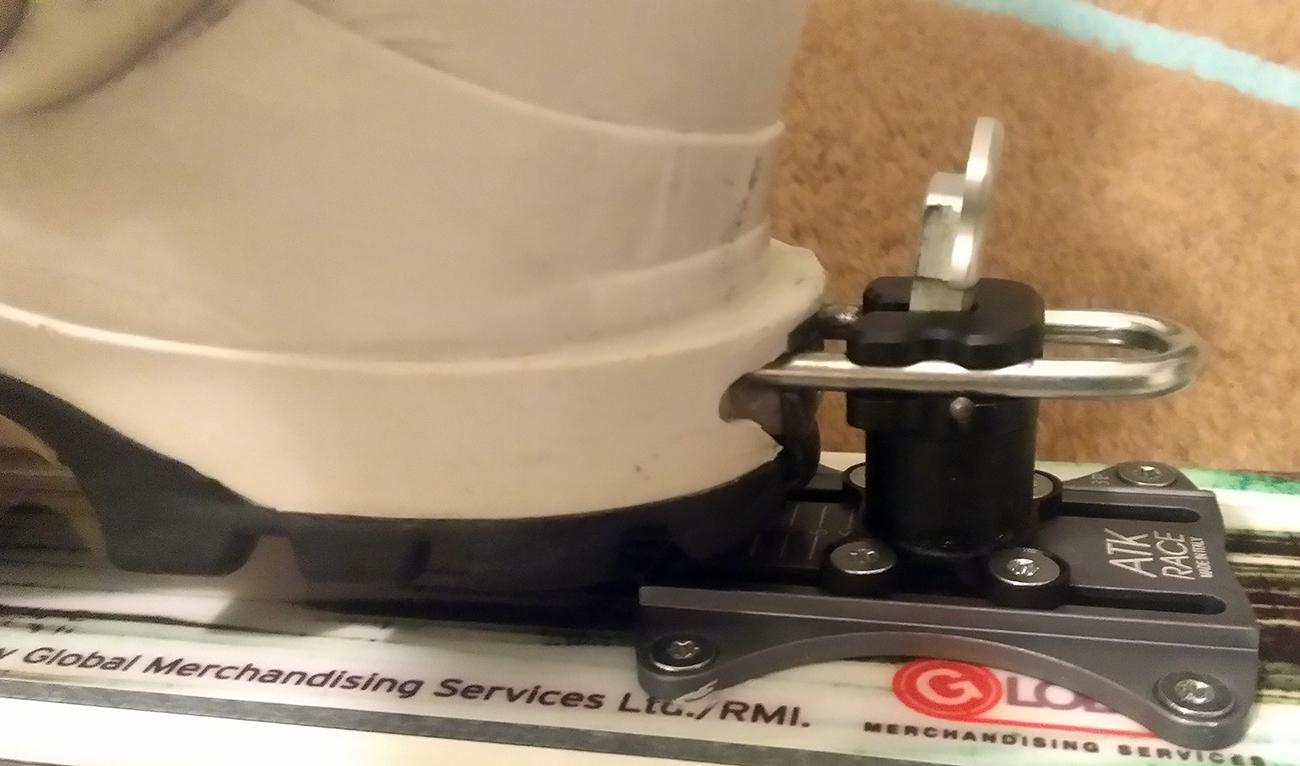 Plocha podstavy špičky má na šírku iba 5.2 cm, čo prekvapivo umožnilo použiť aj staršiu verziu rozširovacej položky pre XXL lyže, konkrétne podložku ATK R03 A a P, ktorá má šírku 5.1 cm (novšia ATK R08A už má šírku 6 cm). Ramená prednej časti (s čeľusťami) teda v podstate visia vo vzduchu a spoliehajú sa na pevnosť v ohybe 4-5 mm hrubej, no umne tvarovanej a hojne frézovanej hliníkovej zliatiny. Staré dobré TLT-čko to zvládalo s 2mm hrúbky ťahanej ocele, ale na plastovej podložke 6 cm širokej. Tu vidno, resp. je možné si domyslieť dizajn a pevnostné charakteristiky, ktoré musí viazanie ako celok spĺňať, aby všetko fungovalo ako má, ideálne aj viac rokov a ešte aj s bezpečnostnými rezervami.