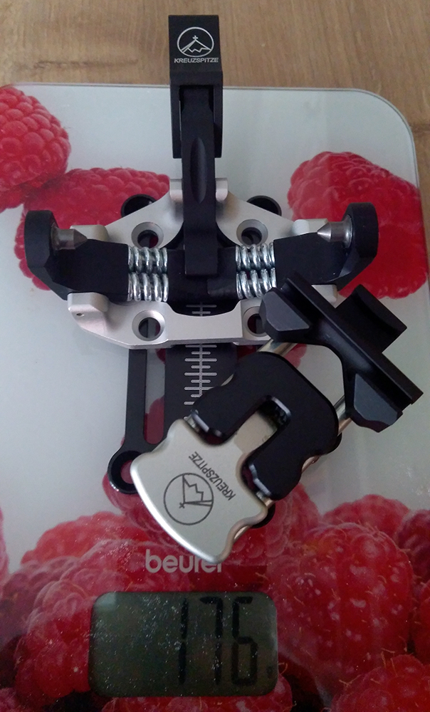 Kým ostatní výrobcovia to obvykle fixujú dvoma skrutkami, Kreuzspitze na to išlo polopate. Pri montáži založiť, dotlačiť, priskrutkovať viazanie a hotovo. Trime ako hluchý dvere. Žiadne skrutky navyše, žiadne strhnuté závity, strihnuté skrutky. Ak sa tento úchyt aj vylomí (stať sa môže kadečo), dá sa nahradiť pomerne ľahko, je síce potrebné odmontovať špičku viazania z lyže (alebo podložky) ale netreba sa babrať s problémovými skrutkami a pod.