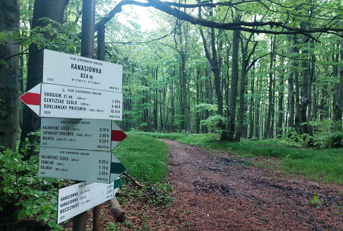 Doplna dopĺňam hneď na prvom možnom mieste – pár metrov od vrcholu Kanasiówky je na mape označený pramienok a v reáli je tam aj šípka na strome. Tak idem pozrieť, čo môže tiecť tak vysoko. A ozaj, je tam! Vrchnák z bidóna poslúžil a ďalej sa mi ide znovu veselšie. Lebo v noci som veľkú spotrebu nemal, ráno je chladno a na kopcoch okolo 800 m aj zvyšky hmiel ochladzujú, spolu s tým severákom, ktorý už od včera hučí. Jeden z mála výhľadov je na Medzilaborce, tak sa skôr zabávam pohľadmi pod nohy: cez deň som sa uhýbal čiernomodrým chrobákom, v noci žabám, salamandrám a modrým slimákom – bezdomovcom. So svitaním si používatelia cesty znova vymieňajú službu. Len ja už nadsluhujem, aj ma podľa toho vypína (niekde okolo Kalinovského sedla), duklianska čokoládová eufória skončila. Až o pol siedmej slnko konečne vylieza nad mraky či nad zvyšky hmly, či čo sa to tu povaľuje, a svet a les je v ostrom svetle hneď veselší.