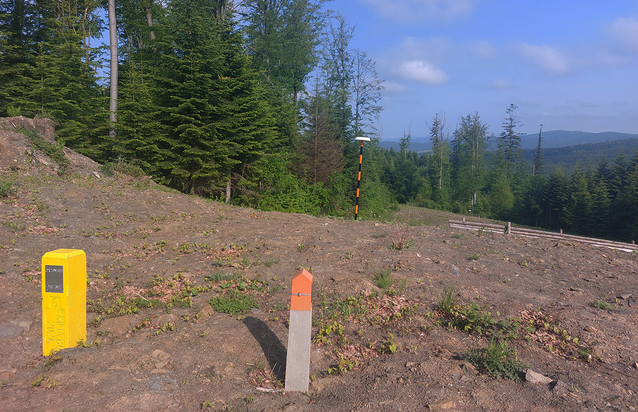 Nad Obručným cez cestu a hneď sú tu prvé hraničné stĺpiky - záruka, že idem dobre. Ďalšími zárukami (až po Kremenec) sú stopy po štvorkolkách a koňoch hraničiarov a červená značka. Trojité istenie. Stĺpiky sú výborné aj na posedenie - keď mi treba dať dole batoh a niečo vybrať, pohodlne si ho prevesím cez kolená.