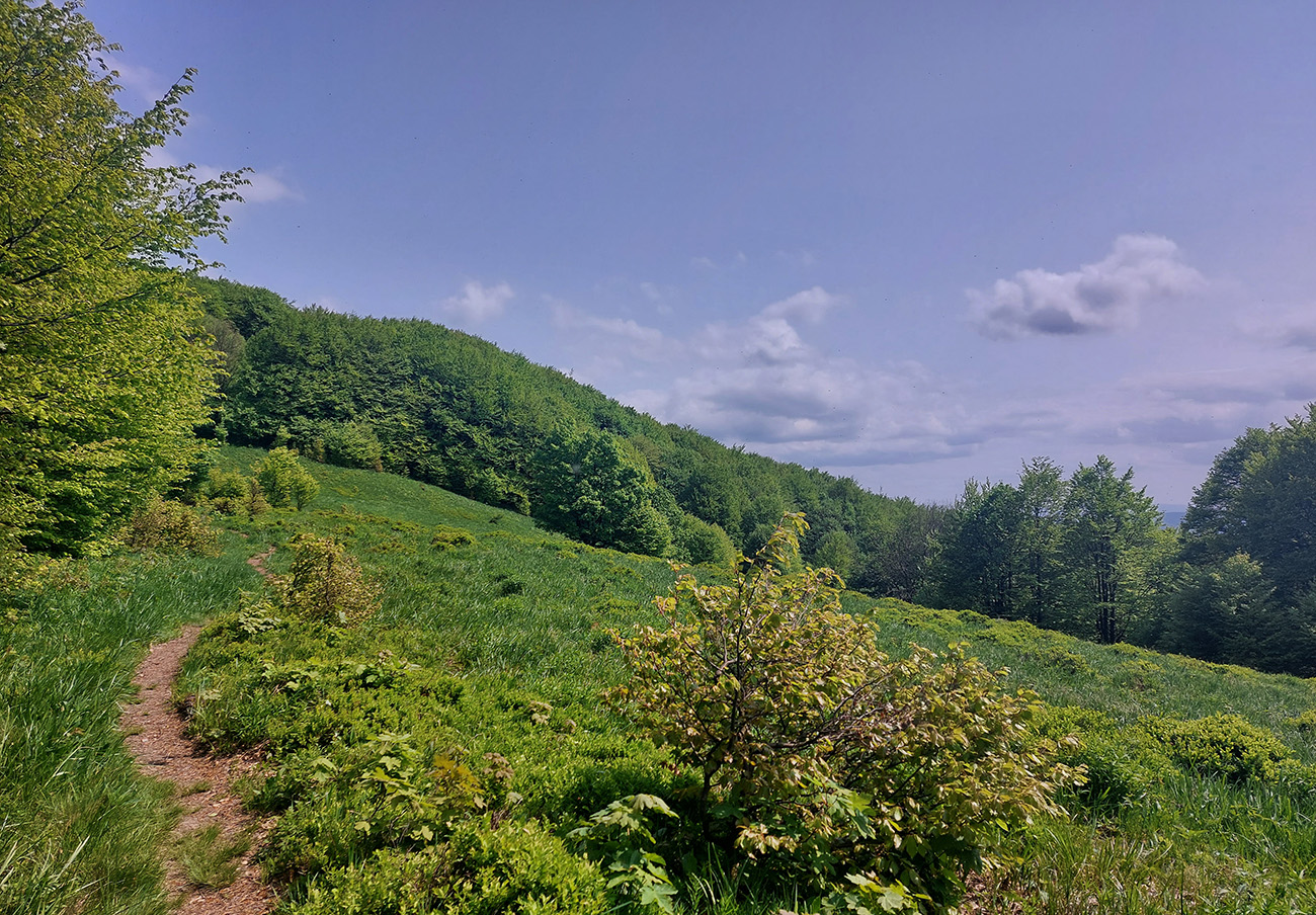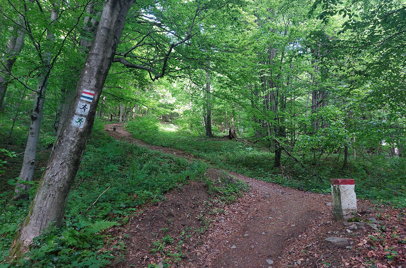 Medzi tým, pred tým aj potom pekné lesy, ale aj rúbane, vojenské cintoríny, stará vojenská pozorovateľňa na Pasekách aj zákonom chránené jedliny - a stále hore a dole. Zase začínajú strmšie sklony. Prvá séria „štipľavých kopčekov“ začína stúpaním na Szcołb (769 m) a končí v Balnici. Kríza už našťastie povolila, no stúpania idem stále pomalšie.