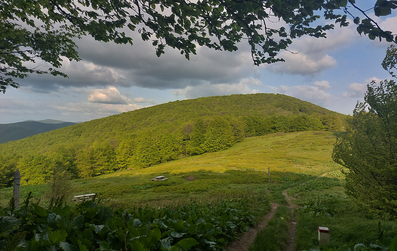 Za sedlom Dujava znovu nejako viacej lúk. Pekné rozhľady, ale cesty niet a tráva vysoká, pre istotu zapínam gps. Sklony sa zmierňujú, ale aj cesta sa zužuje do chodníka a tunel sa často uzatvára konármi a krovím. Okolo sedla Zajačí vrch to pod nohami niekde aj čvachtá, niekde treba aj kľučkovať, v početných koľajach stojí voda. Zrazu čo to, halucinácia? Nie, to len hraničiar na koni ide oproti. Nechápem, ako sa tade dokáže predierať a ako sa niekde zohýna. Za ním dokonca bikepacker tlačí svoj naložený stroj. Tak tomu závidím ešte menej. Pred Polianskym sedlom je lesný priesek na dlhšiu chvíľu naopak zase široký, navyše takmer rovný a bez prevýšenia, kluskanie až taká rozkošššš!