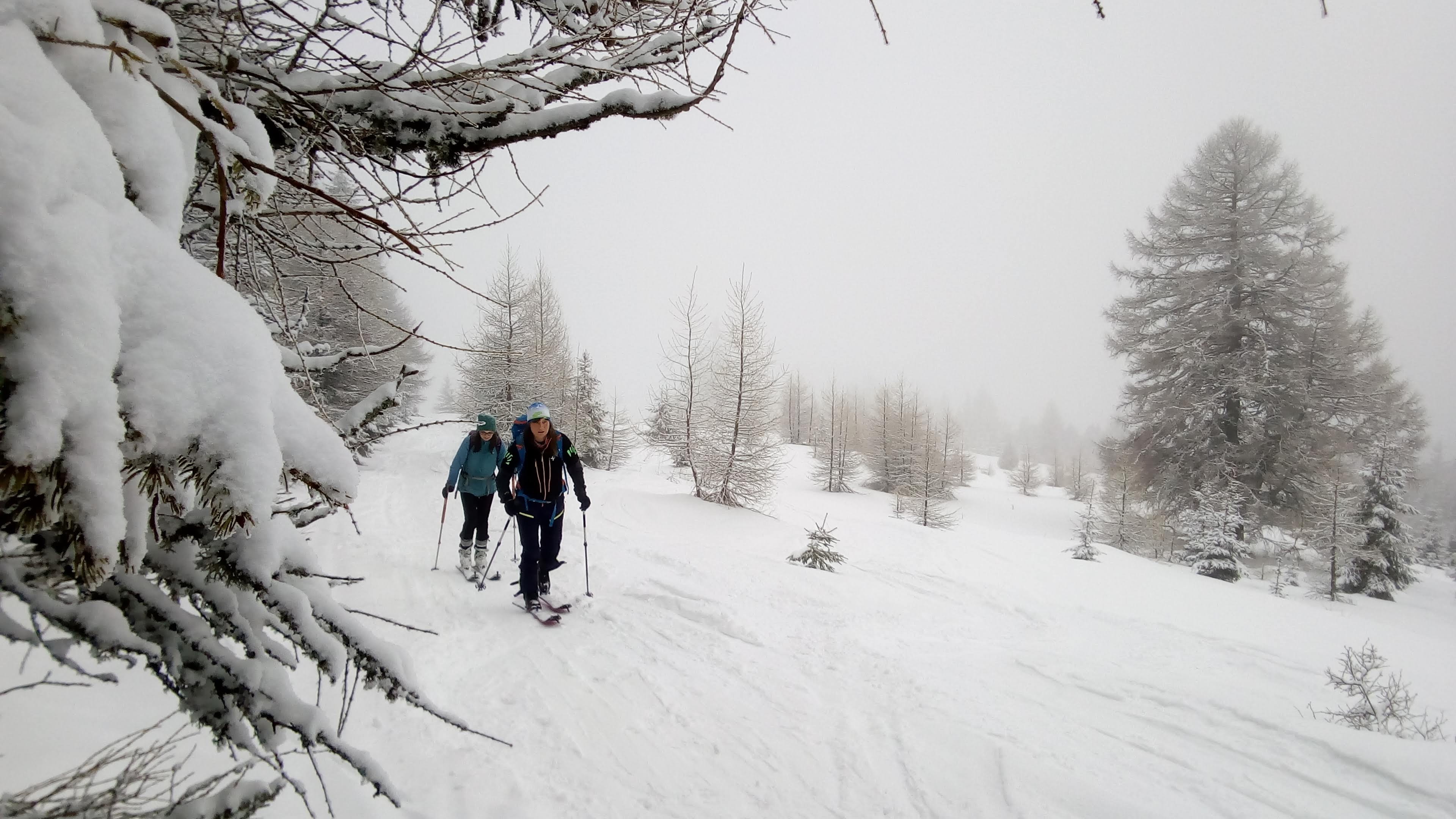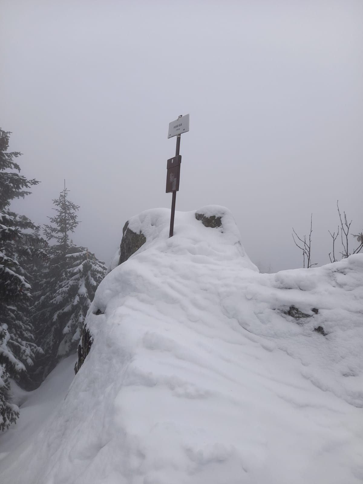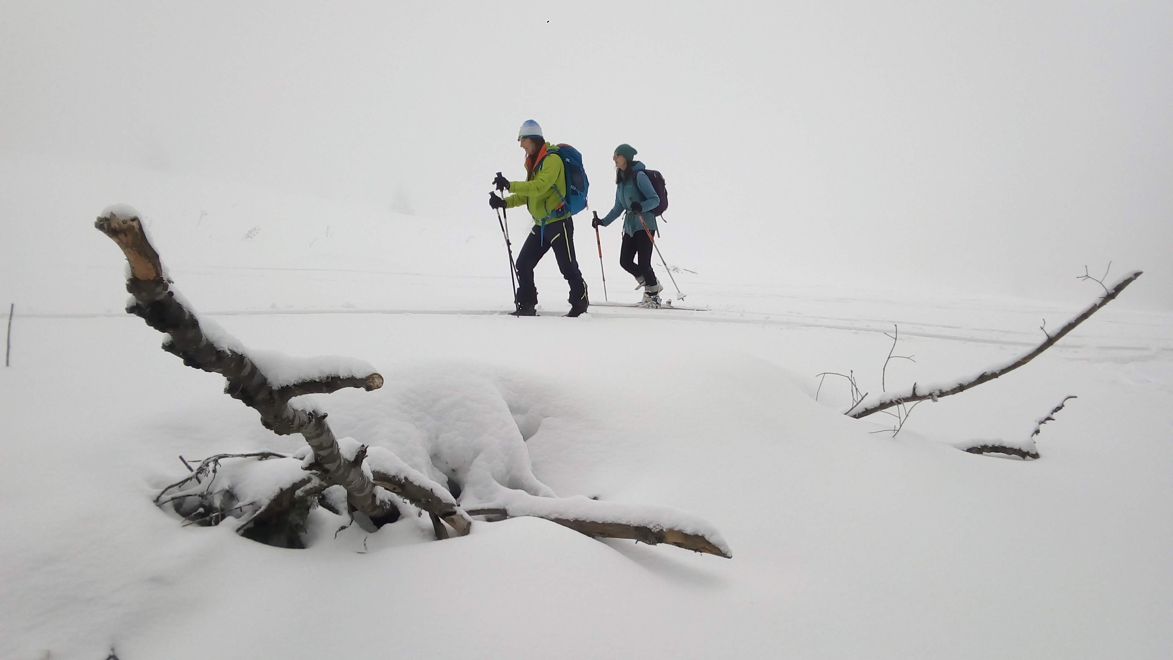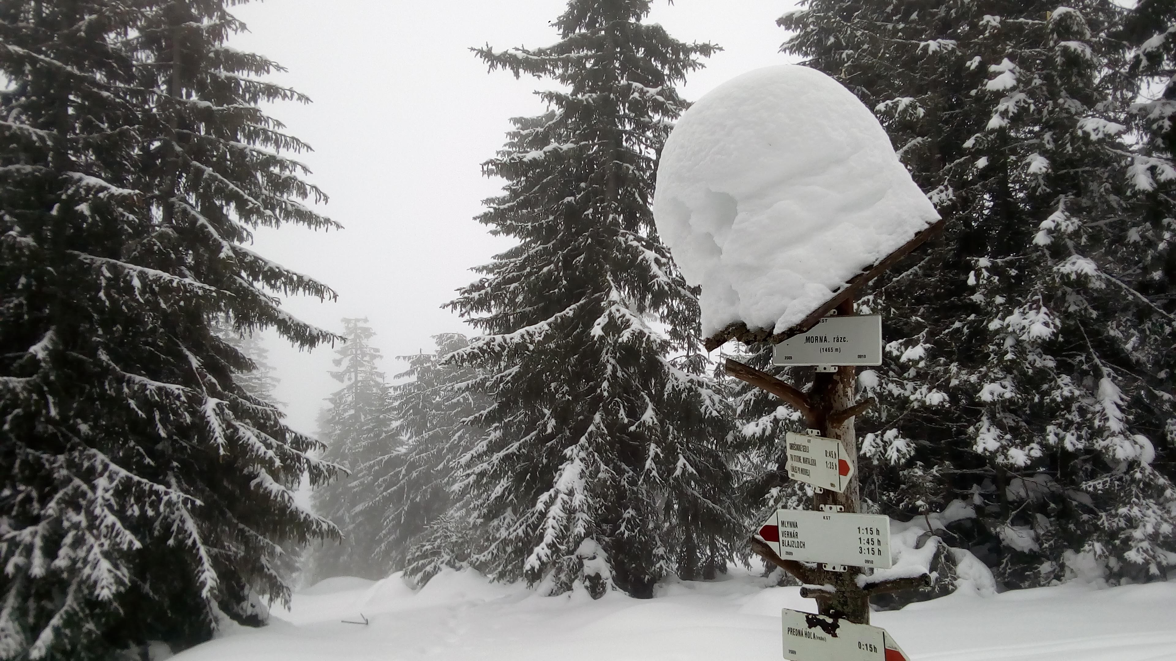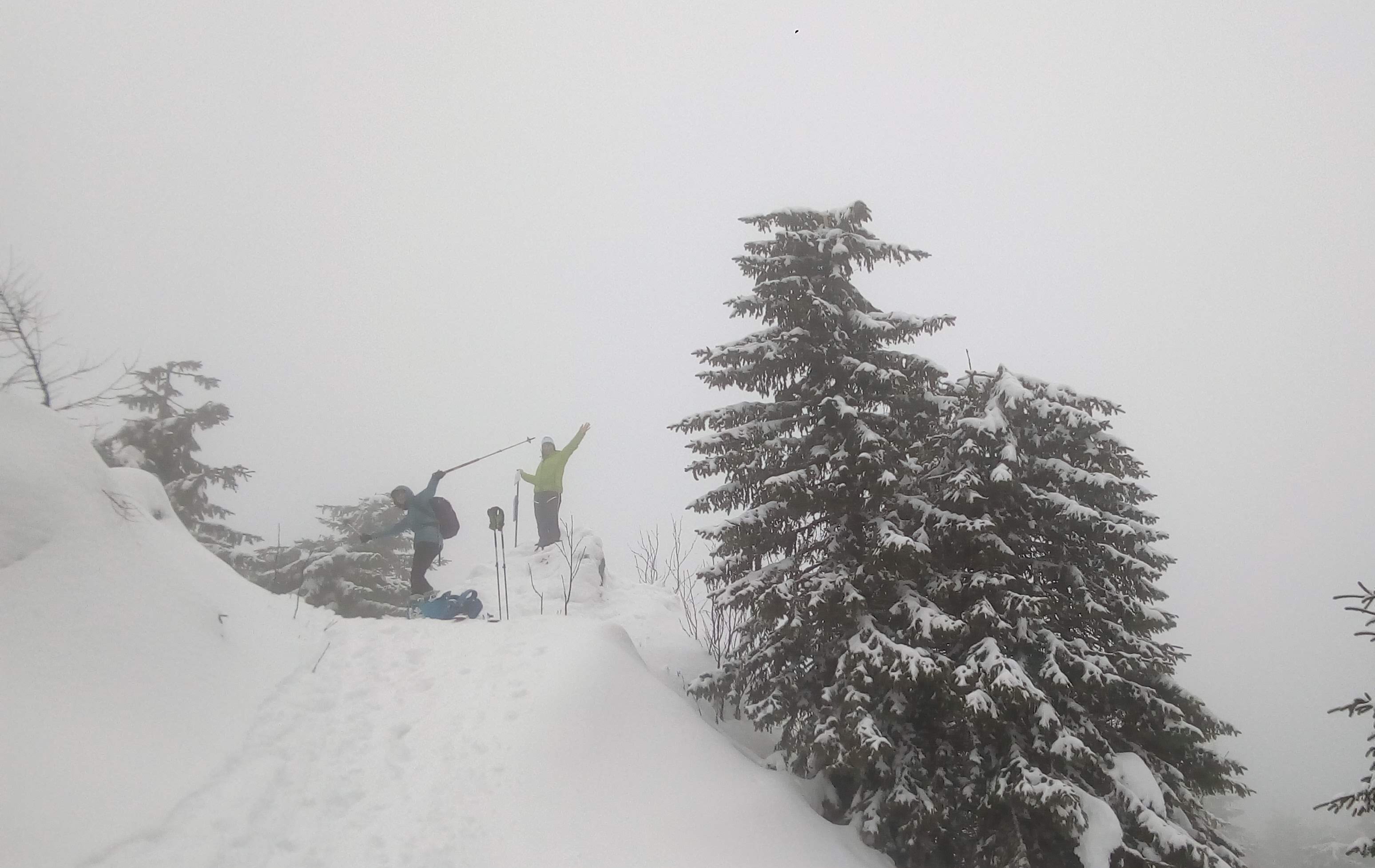 Na rázcestí Morna sa rozhodujeme pre dlhšiu variantu dookola cez Smrečiny, biela rozprávková krajina ako v hororovom filme láka stále neodolateľne ďalej a ďalej. Smrečianske sedlo, podľa smerovníka už len 2h40 na Kráľovu hoľu. Po čerstvej stope kľučkujeme neznačeným chodníkom na nižšiu Prednú hoľu 1545m, častý to cieľ miestnych freeriderov, aj náš. Vrchol aj celý výlet v hmle, výhľady na Kráľovku dnes nie. Konečne plošinka kde sa odopínajú pásy, iniciačné miesto každého skialpinistu. Unavené pásy a prázdne termosky do batohov, mierny odmäk aj vo februári, divná doba pokračuje, obliekať sa veľmi netreba. Hlavne zapnúť zipsy, putká, úchyty, prepnúť všetky sofistikované páčky do správnej polohy, všetci traja hlásime "pripravení" riadiacemu stredisku, môžu začať odpočítavanie.