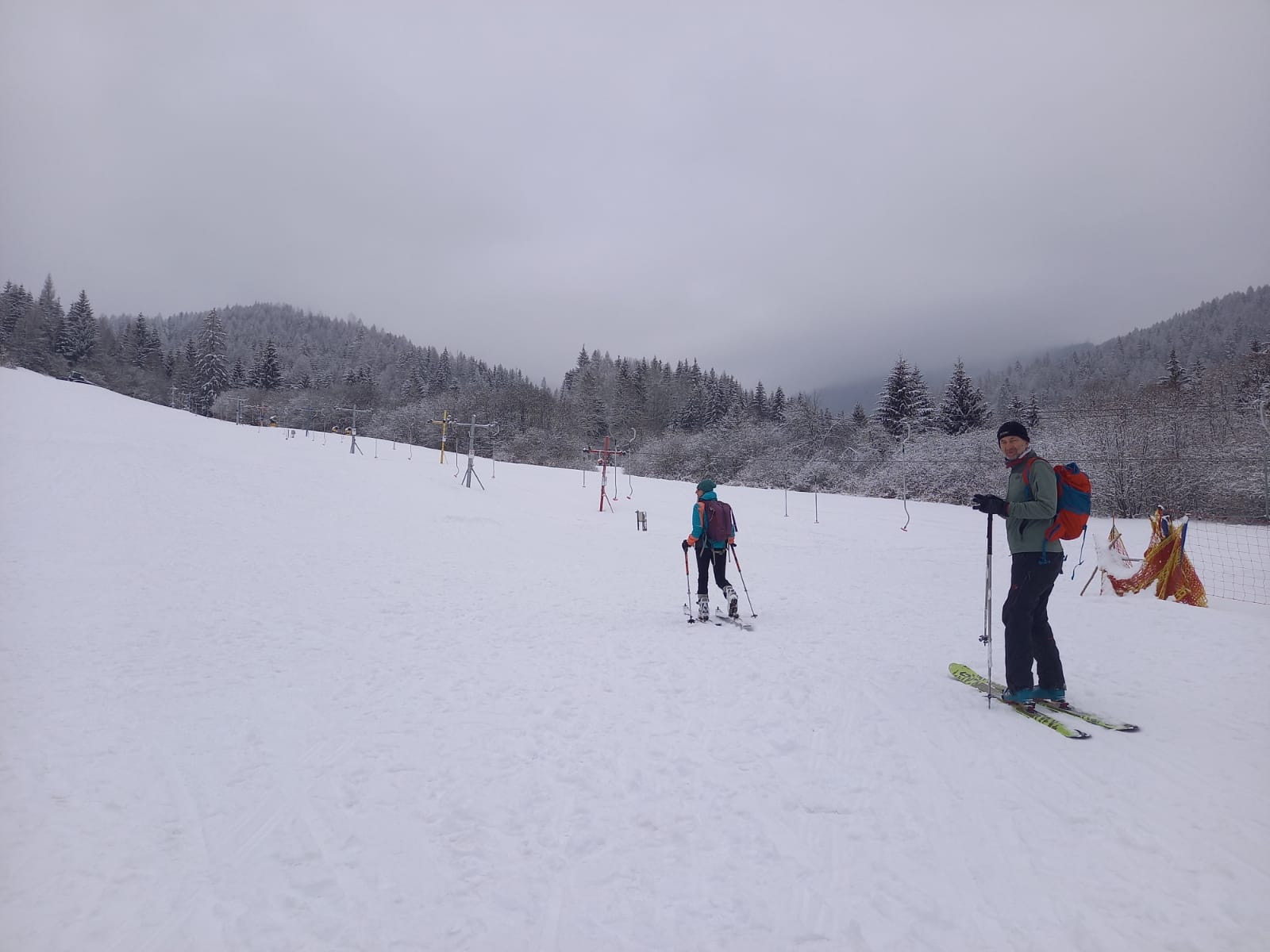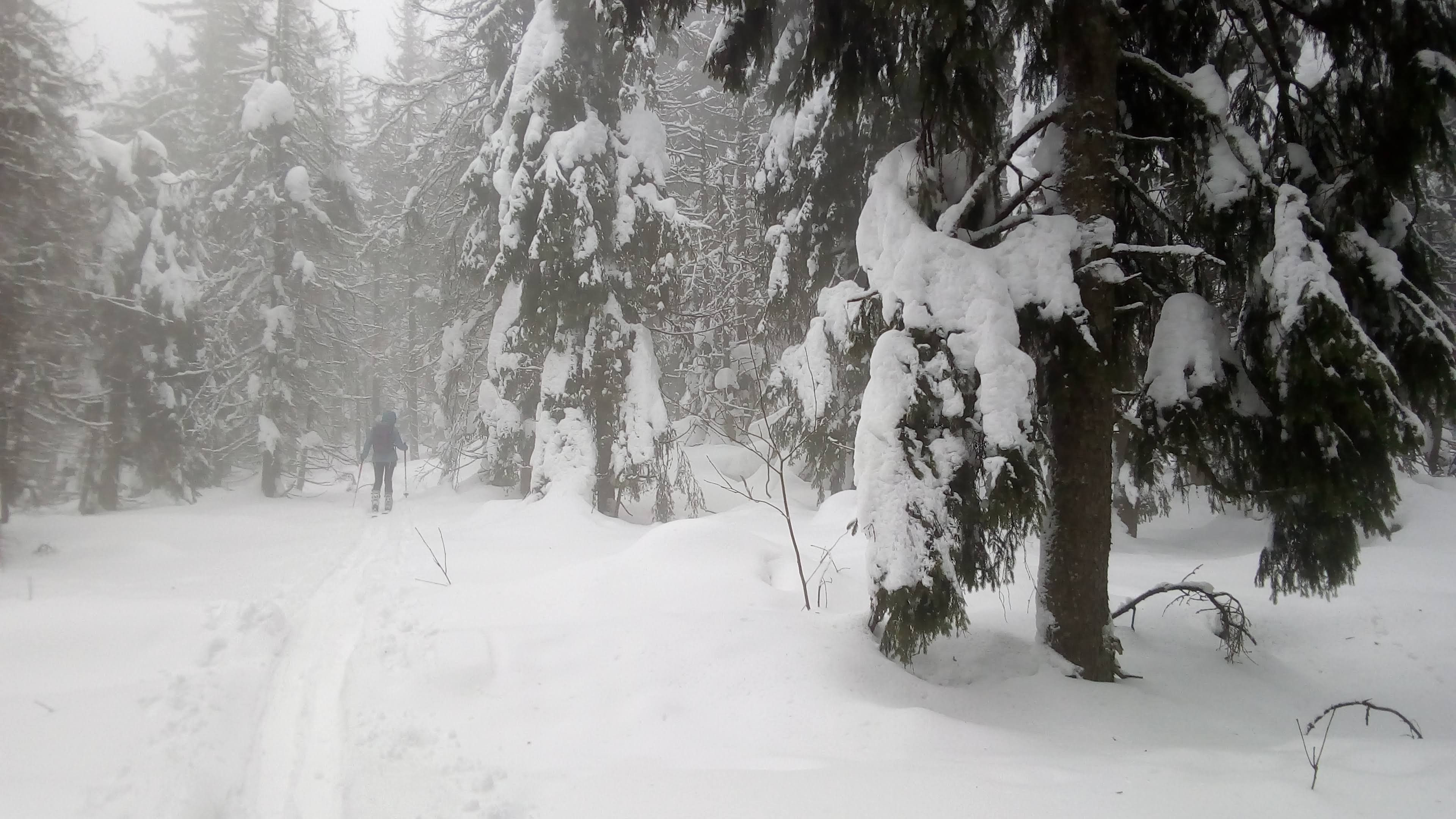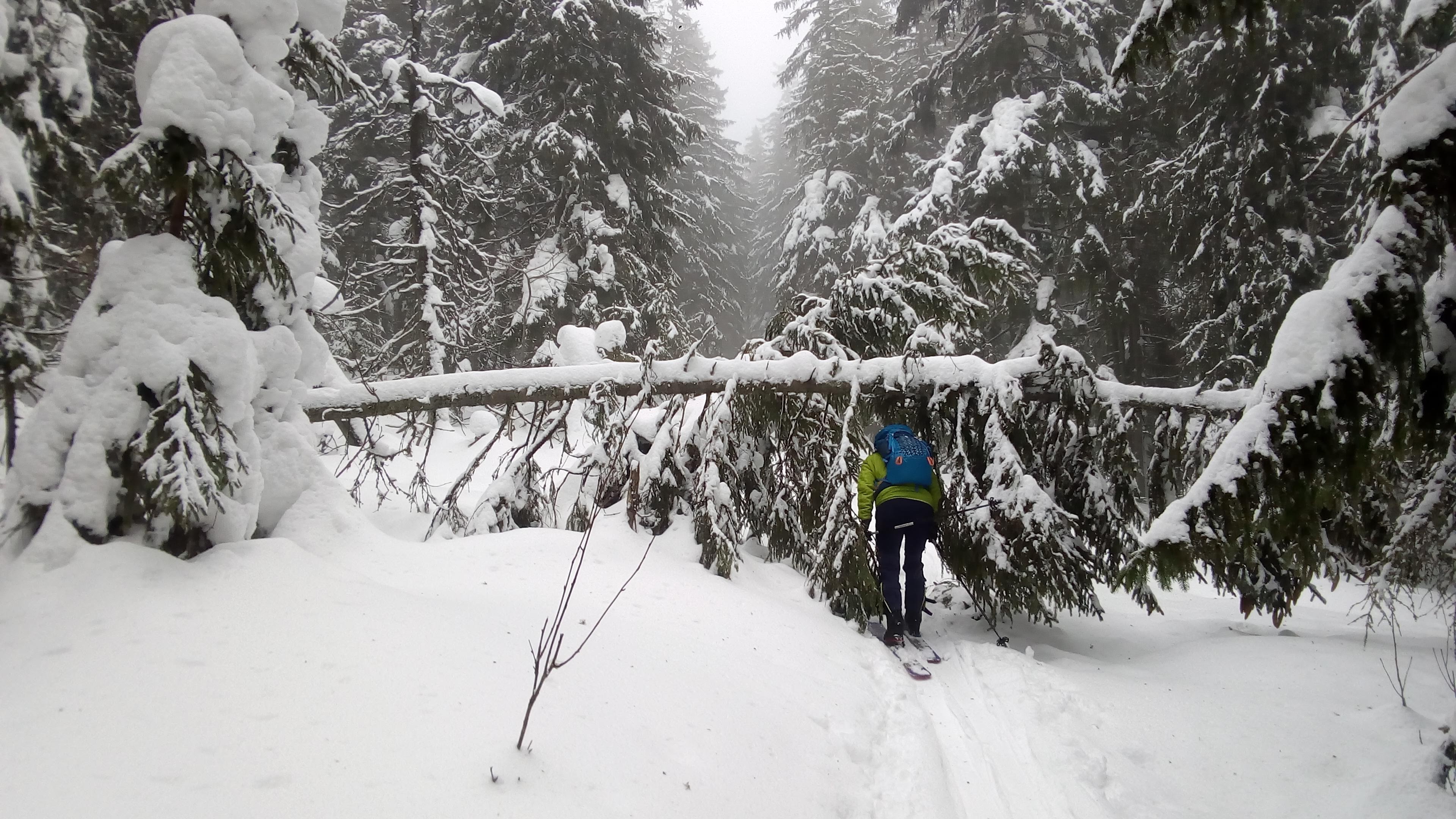 Začíname stúpať po zjazdovke skiareálu Vernár, na konci lana pokračujeme po červenej smer Kráľova hoľa. Úzke lesné koridory sa striedajú so širokými panenskými pláňami. Tadiaľ za pár hodín budeme svišťať dole! Všade ticho, ani lístok sa nepohne, samý ihličnan. Pár lyžiarov a snowbordistov kľučkuje oproti.