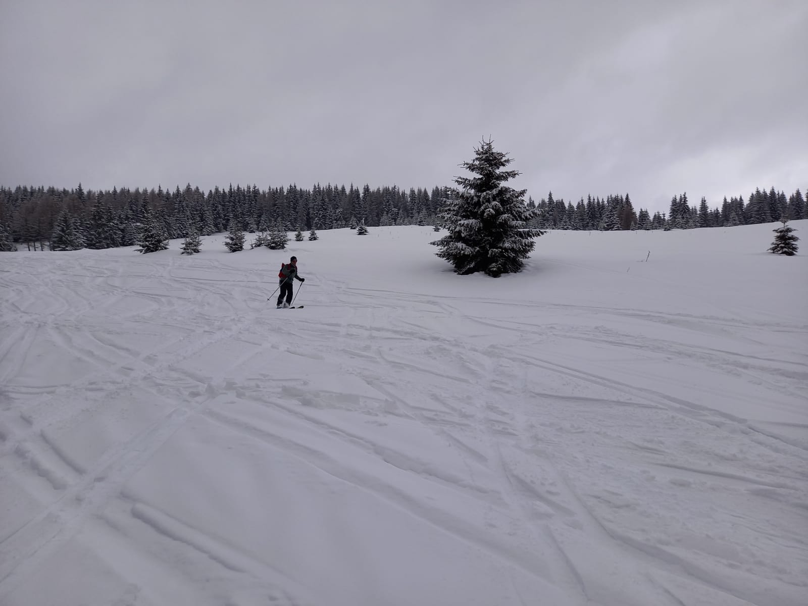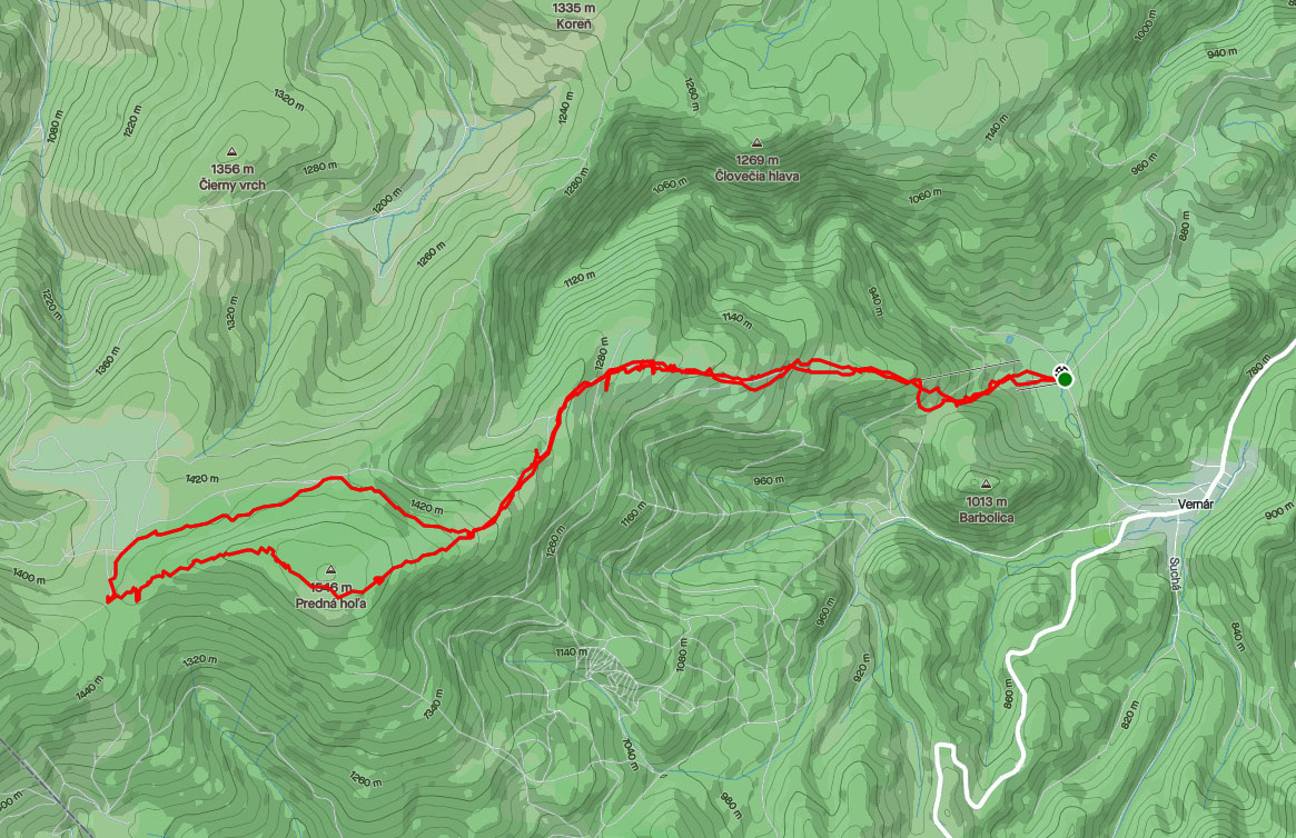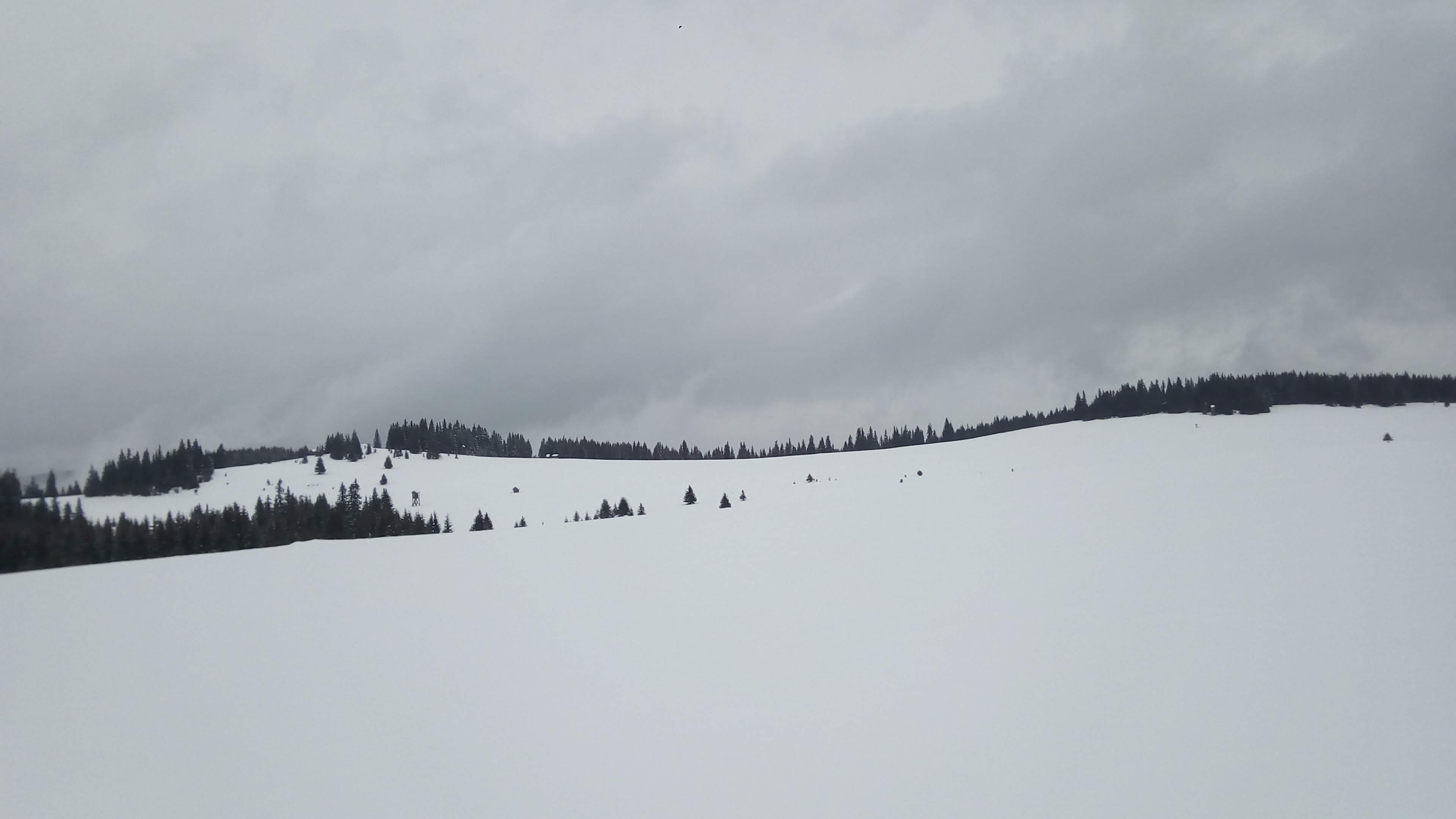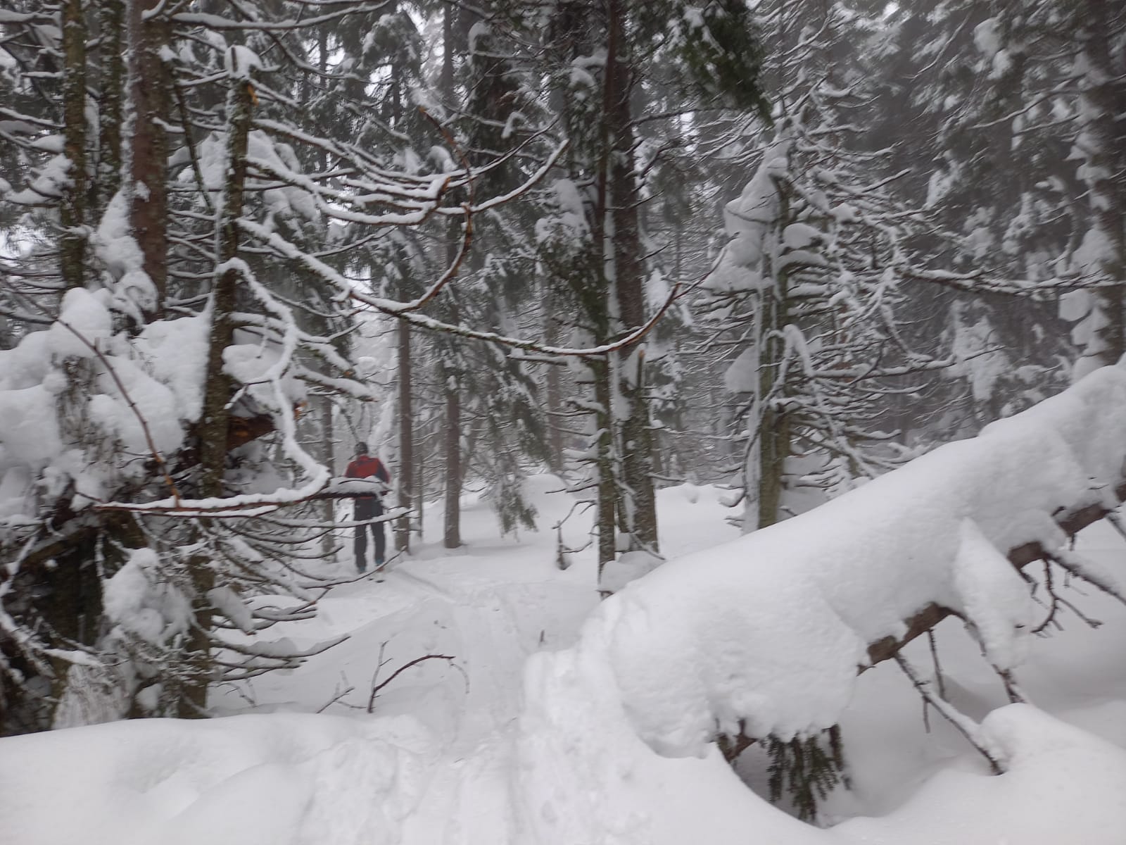 Začíname stúpať po zjazdovke skiareálu Vernár, na konci lana pokračujeme po červenej smer Kráľova hoľa. Úzke lesné koridory sa striedajú so širokými panenskými pláňami. Tadiaľ za pár hodín budeme svišťať dole! Všade ticho, ani lístok sa nepohne, samý ihličnan. Pár lyžiarov a snowbordistov kľučkuje oproti.