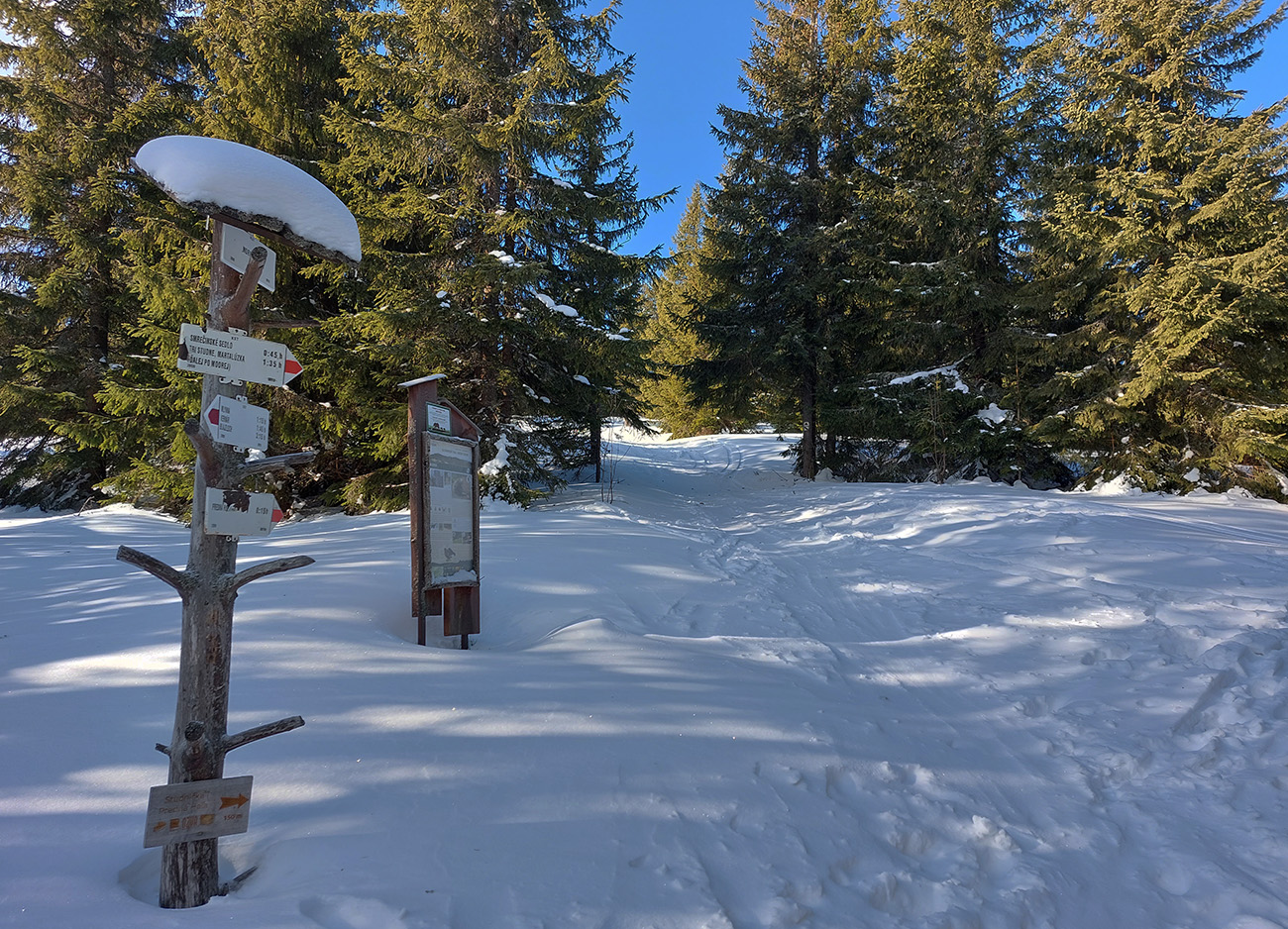Od Smrečinského sedla na rázcestie Morna sa vraciam čiastočne po svojej, čiastočne radšej ale po stope miestnych znalcov, aby som sa zase nezamotal. Ale aj tak sa mi to v tých rúbaniskách darí, nejaká iná stopa ma zlákala - lebo zrazu zisťujem, že som na „nižšom poschodí“. Tak krátka, prudká skratka nazad hore a potom už pohoda, lebo času dosť, ide sa aj hore na Prednú hoľu.