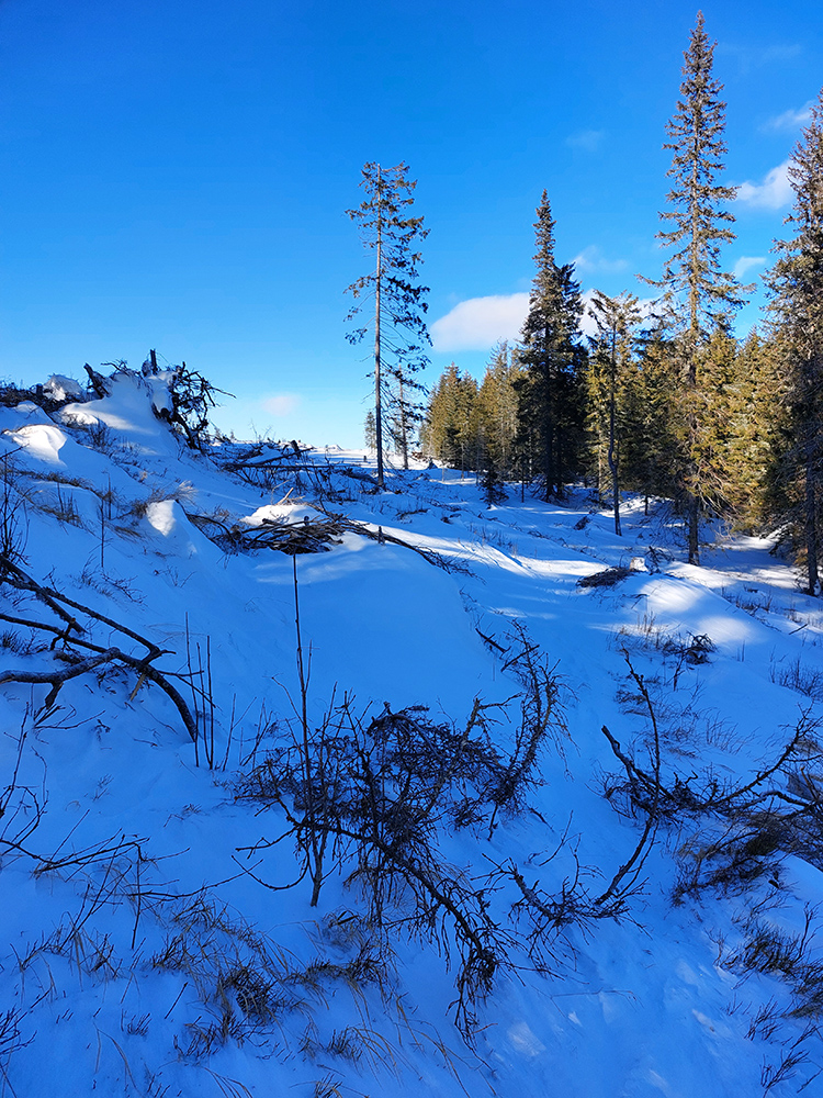Od Martalúzky k neznačenému traverzu (ktorý som smerom hore neznalo obišiel) už je stopa poriadne načatá pešiakmi, ale lyže z jamy sa mi vyniesť darí, moc sa neborím. A aj keď treba miestami trochu postromčekovať alebo potlačiť rukami, dá sa. Pásy lepím až v tých rúbaniach s výhľadom ku Kojšovke, potom ale nasleduje poriadne kľučkovanie a podliezanie vývratiskom. Miestami ani podliezť, ani obísť. Ale sranda, snehu zatiaľ jesto – len dokedy vydrží? Je to tu na juhovýchodnom svahu dosť otvorené.