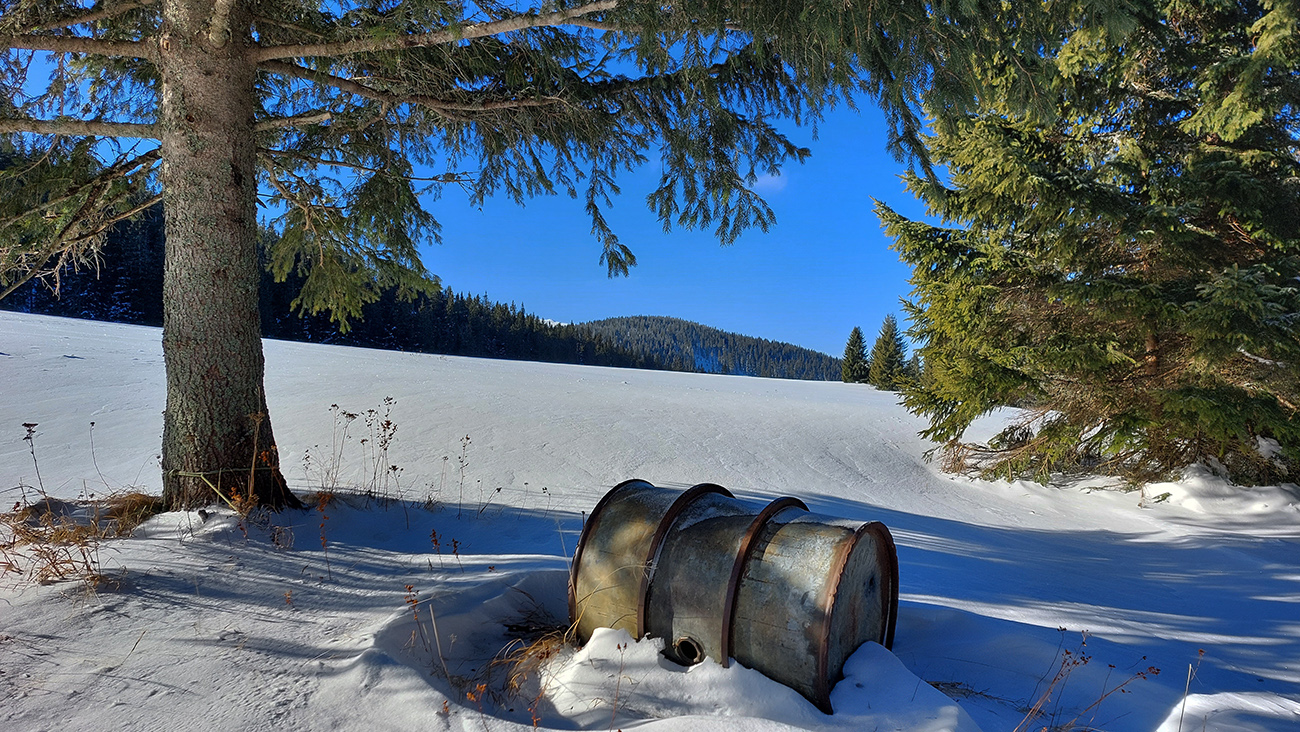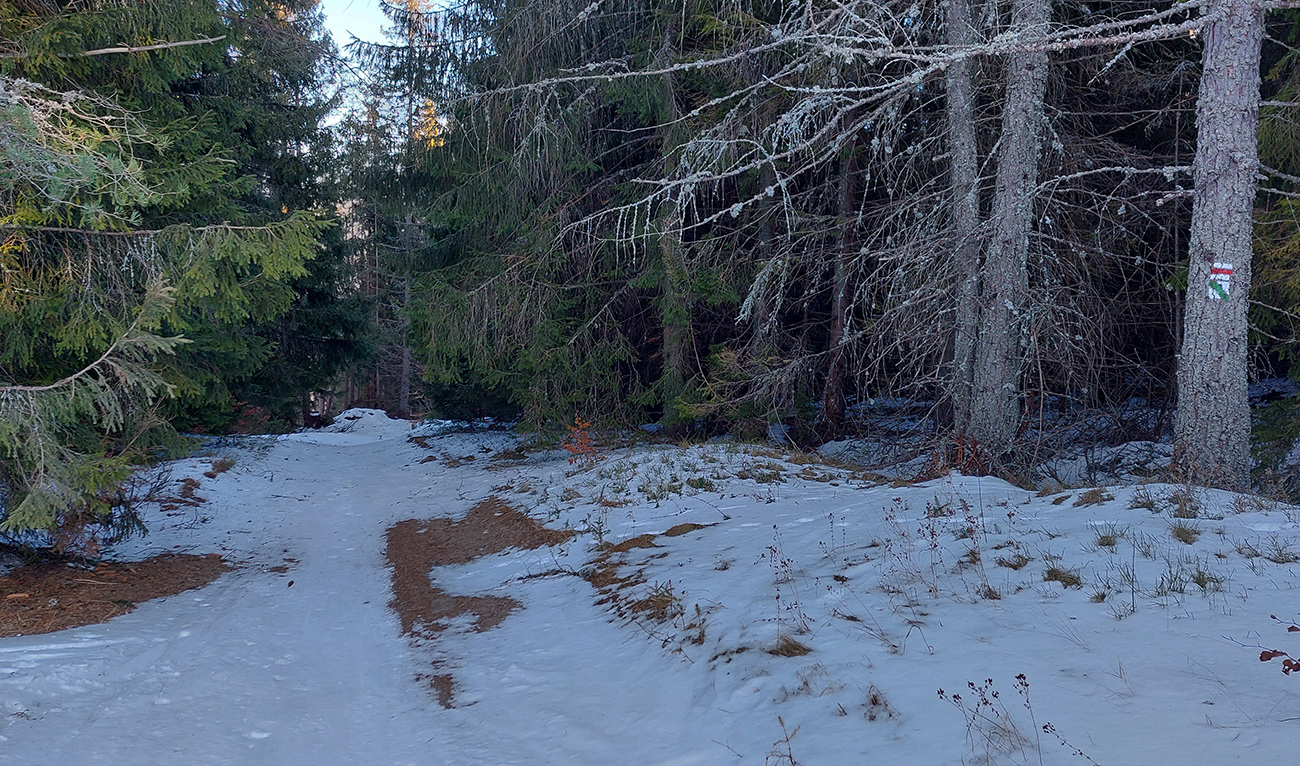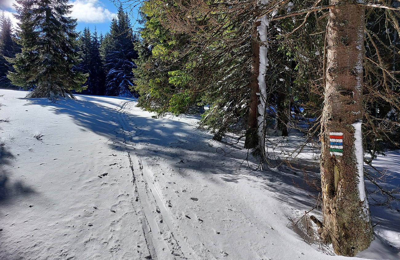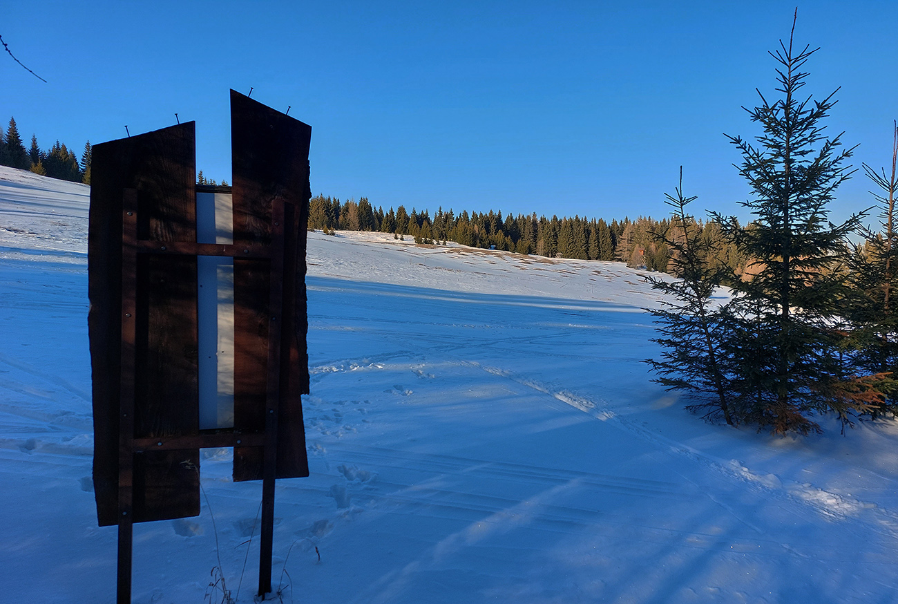Za smerovníkom Smrečinského sedla začína najväčšia sranda dňa: stopa síce preleštená, ale odbočuje od modrej značky kamsi doľava dole a na značke len súvislé lesné bielo. Neznalý miestnych pomerov si myslím, že to niekto predo mnou sa zamotával, tak prerážam stopu poslušne po modrej. Aj tu sa párkrát zamotávam, keď značky nevidieť, alebo keď ma zlákajú takéto betónové „kilometrovníky“: