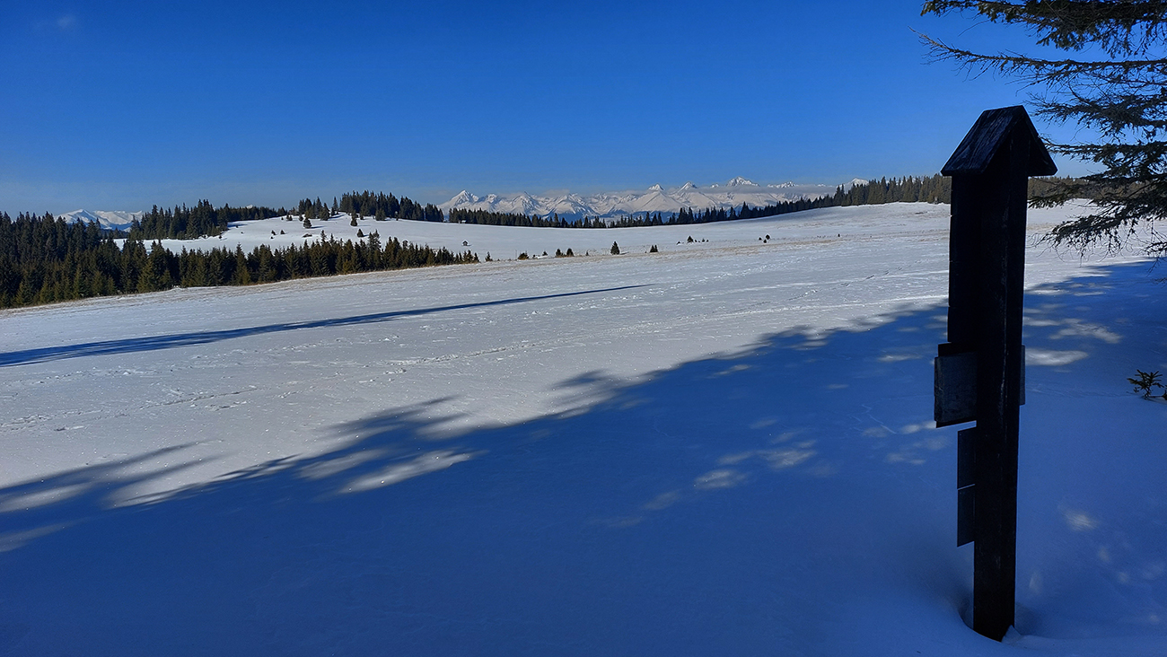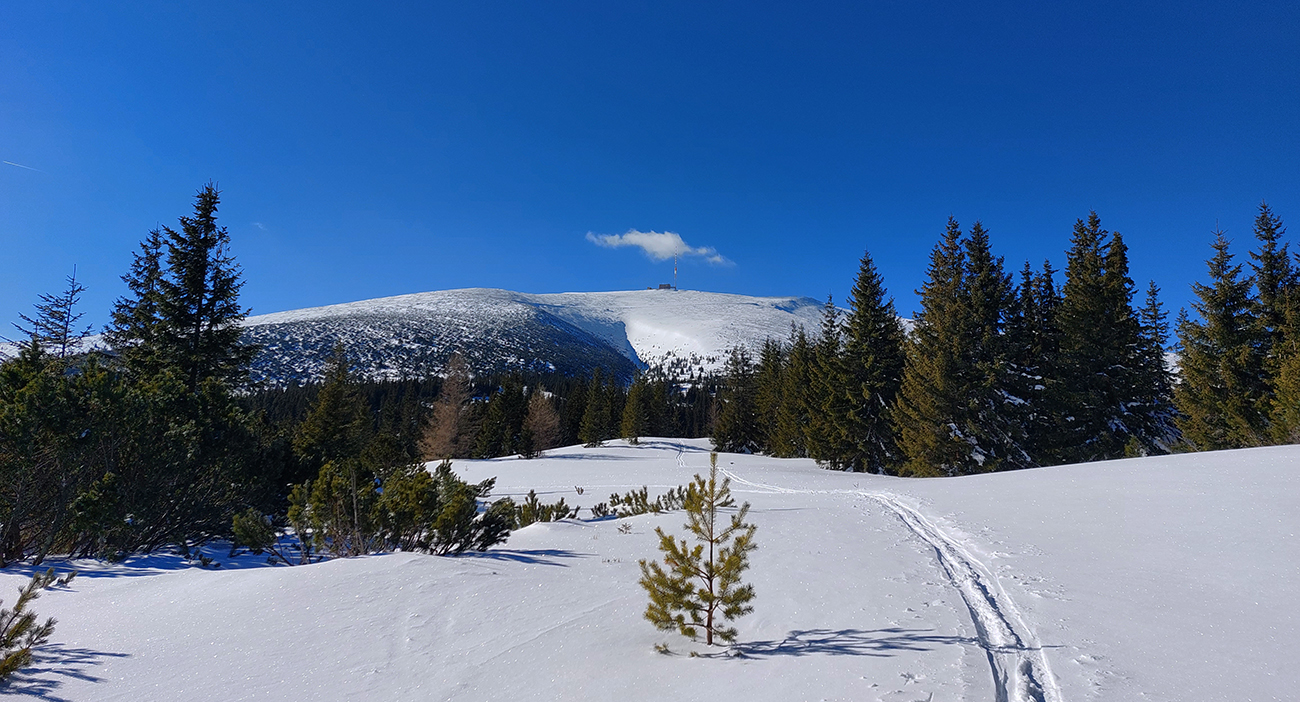 Po rozľahlých lúkach pred Smrečinským sedlom si ťahám za sebou čerstvú lajnu, len máličko sa prepadávam, kôrka je hrubá. Výhľady sa rozširujú aj na západ, niekam ku hrebeňu nízkotatranskému a možno až ku Fatrám? Vľavo vpredu nad tmavozelený les znovu vykukuje môj žiarivo biely cieľ. A už som znovu von na slnku, preč z mrazivého tieňa, vrhaného Prednou hoľou.