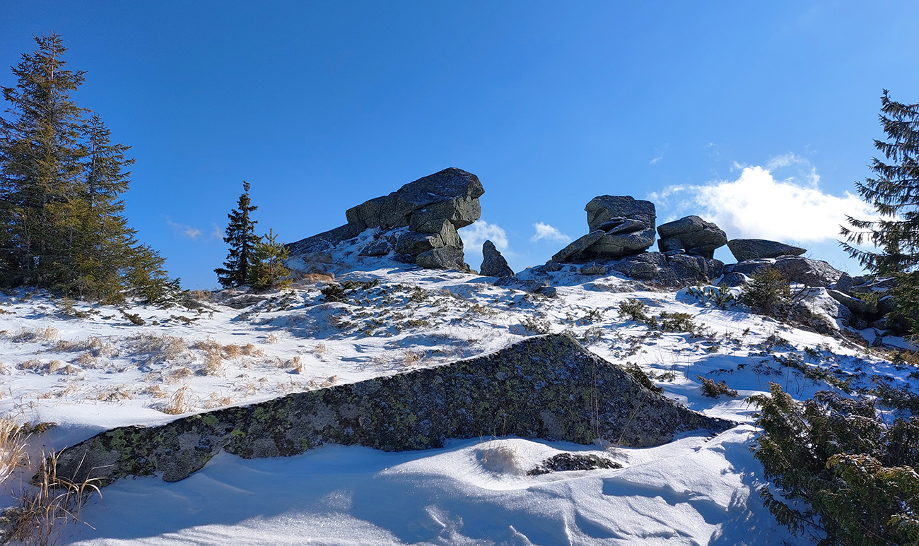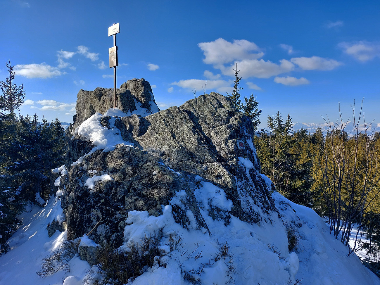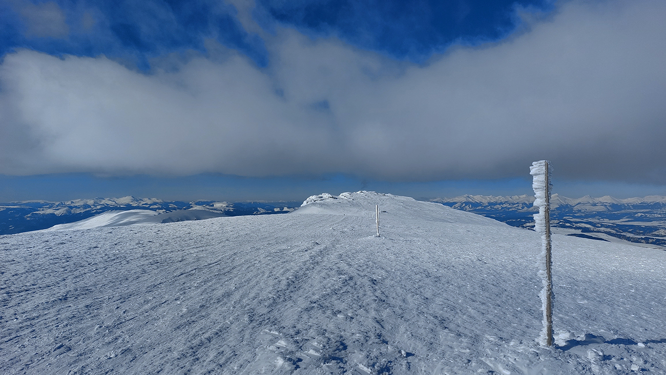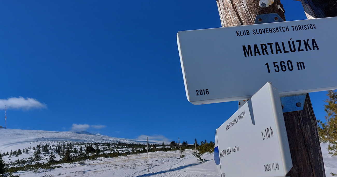 Okolo Martalúzky síce pribúda výhľadov, ale znovu rapídne ubúda snehu. Na výstup dosť, aj keď už miestami po brusniciach stúpam a na kamienky treba dať pozor. Oproti schádza od vysielača človek a hrôza ma chytá, lebo má lyže na chrbte. Príde ale bližšie a našťastie sú to bežky, ufff. Vraj prvý z masového prechodu Šumiac – Kubachy. Tak dúfam, že peší účastníci moc nerozbijú stopu v lese a kľučkujem ďalej v ústrety vrcholu. Miestami je to skoro na haršajzne, aké je to ľadové, aj povrch je tvarom „ľadových zubov“ podobný rašpli tam, kde nejaký súvislý ľad je. Ale to až vyššie, okolo zákruty cesty. Tak tadeto dole veru nie! Tých pár oprotizjazdujúcich aj odkláňam k hrane žľabu, nech sa netrápia popri tyčovom značení.