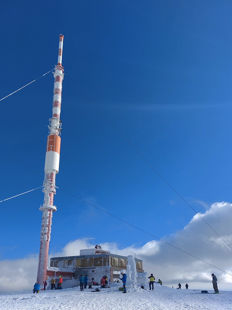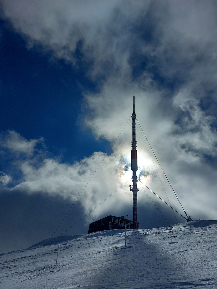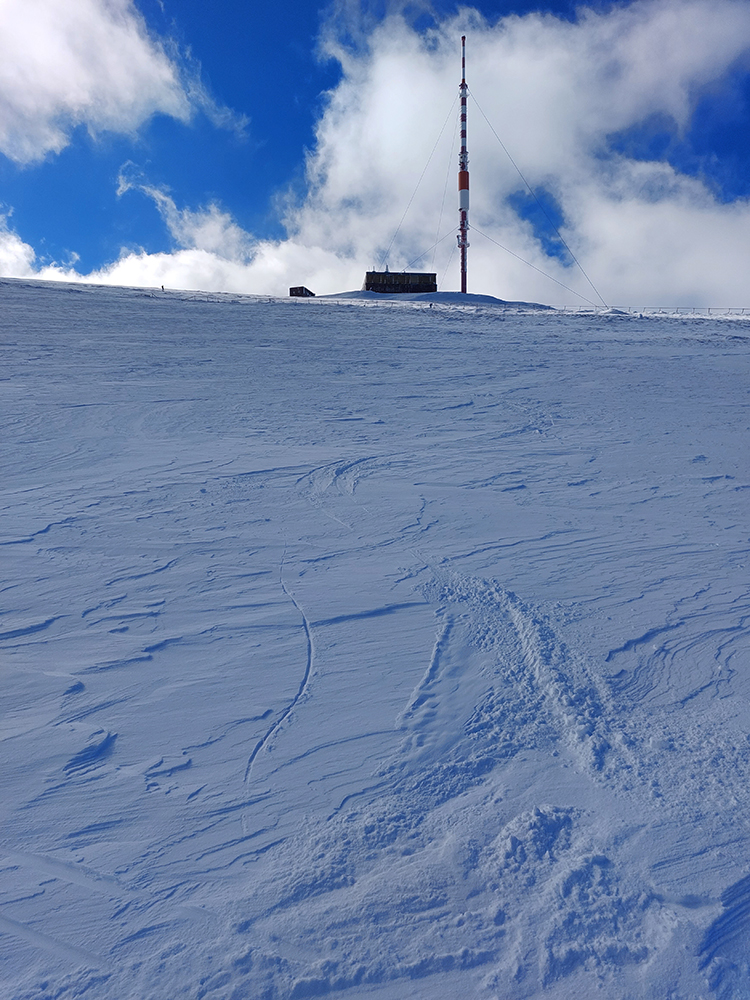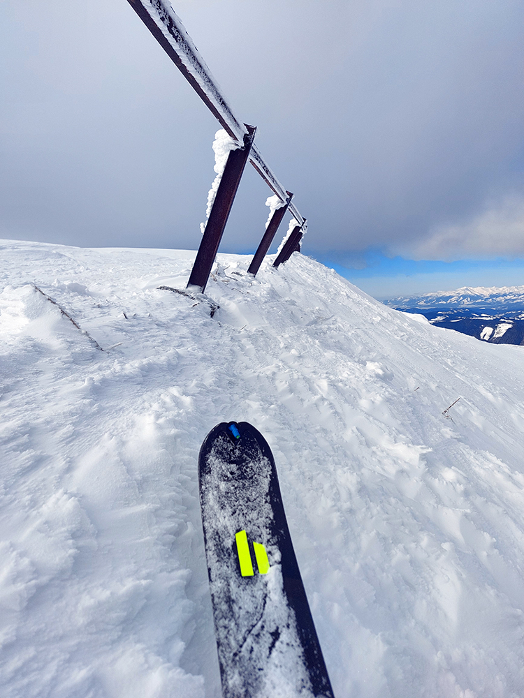 Hore davy: či už kvôli tomu prechodu, alebo že je poludnie, alebo len tak, že je konečne pekná sobota, dokonca skoro bez vetra. Moc sa nezdržujem, lebo na tomto hrebeňovom betóne niet veľmi s čím sa zabávať. Podstatná vec, ktorá mi napadá pri výhľadoch na sever do Liptova (a všimol som si ju už pri pohľade z lúk pri Smrečinskom sedle), že to kalamitné sneženie zo začiatku týždňa sa zastavilo akoby niekde na úrovni Štrby a Liptovskej Tepličky. Ďalej na východ sa nedostalo. Takže preč stadeto: obchádzam vysielač a púšťam sa ku sv žľabu, práve tade, kde je zábradlie pri ceste rozbité. Normálne dobrá lyžovačka, už takmer úplne zhora! Aj keď hore vyfúkané, šmykľavé dosky, ale čím nižšie, tým práškovejšie. Krátke, ale super!