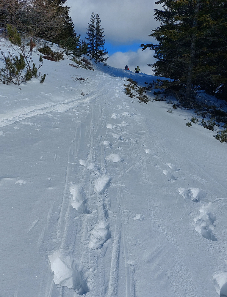 Potom už sa terén otvára a porast znižuje až do kosodreviny, pod pásmi konečne prašan, preto krátky sklz do malej jamky je pohodový aj na pásoch. Len pri návrate tu bude treba lyže do rúk vziať – jedného domáceho tak aj stretám, už sa vracia a dáva mi tip, ktorý odhadujem aj sám takto na diaľku, pri pohľade na Hoľu: nelyžovať nazad od vysielača po značke, ale bokom po hrane žľabu.