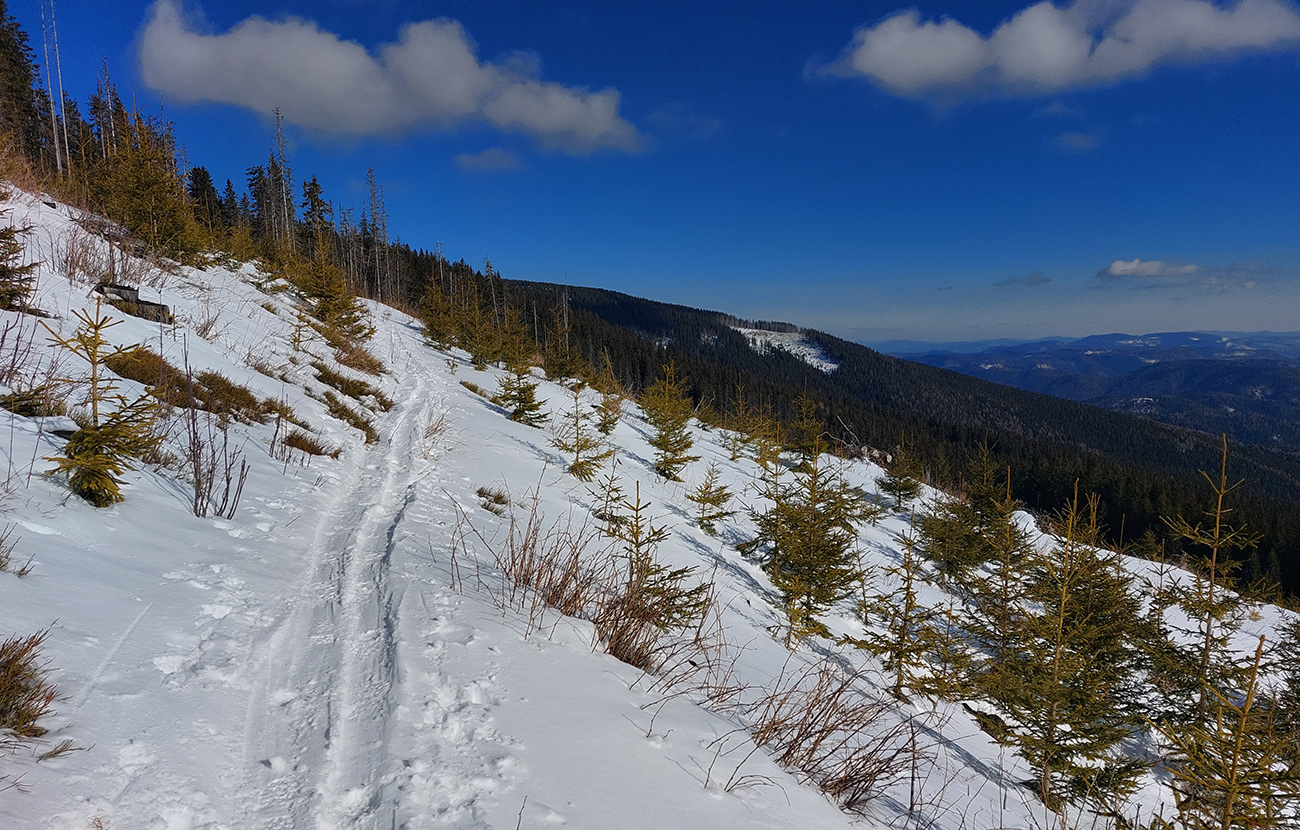 V strmšom zostupe z Úplazu potom neskôr síce stopu pod nohami miestami aj vidím, ale pešiu a poriadne zaviatu, kľučkuje pre lyže až neprijateľne. Na mape ale od začiatku tejto "srandy" registrujem neznačený traverzový chodník trochu nižšie vo svahu, tak sa napájam a to je tá preleštená stopa - tak mi dochádza, že miestni znalci v zime tento úsek traverzujú. Aj smer dobrý, vpredu zase cez rúbanisko svieti Hoľa. Doľava, na východ, vidno do diaľky Volovských vrchov, neviem, či správne identifikujem Kojšovskú hoľu. V poslednom strmšom, užšom prechode cez les aj stromy zrazu vyzerajú ako v zime, krásne olepené snehom.