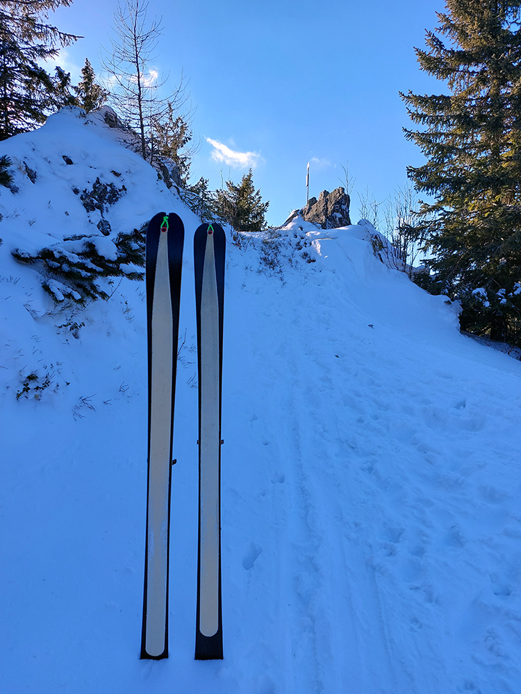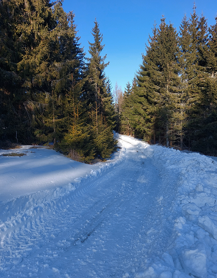 Našťastie až ku vlekom po ceste nemusím: malý mostík cez potok ku studničke a od nej už sa dá pomedzi krtince a trávu aj na pásoch, dokonca aj stopa je! Podklad: aprílový firn, hlboko zmrazený do tenkej kôrky na vrchu a sypkej plnky s bylinnou prímesou pod ňou. Dnes (sobota 12.2.) aspoň že teplota nemá vyliezť nad nulu, tak dúfam, že sem aj zlyžujem. Pod vlekmi ľadový menčester, v prudších pasážach zjazdovky musím poriadne potiahnuť rukami. Vstup do lesa: stopa široká, vyleštená brzdením, ale špinavá od konárikov a šišiek, občas hlinu vidno. Ešte sa pýtam vlekára, či prejdem bez vyzúvania. Nevie.