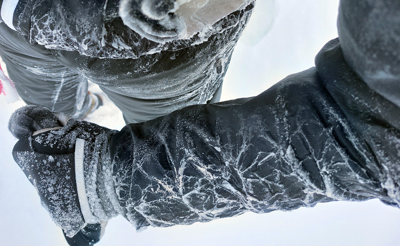 Ešte výšľap na hranu Kriváňa bol v pohode, síce dulo riadne, ale ľudkovia z lanovky sa korzovali jedna radosť a chodník udupaný. Na lyžiach už by však bolo treba poriadne hľadať cestu. Zato za hranou peklo – pod nohami (šutre) aj v ľufte (ten uragán). Netuším, kde sa tam vzal, jedine asi vďaka dýzovému efektu medzi oboma Kriváňmi.