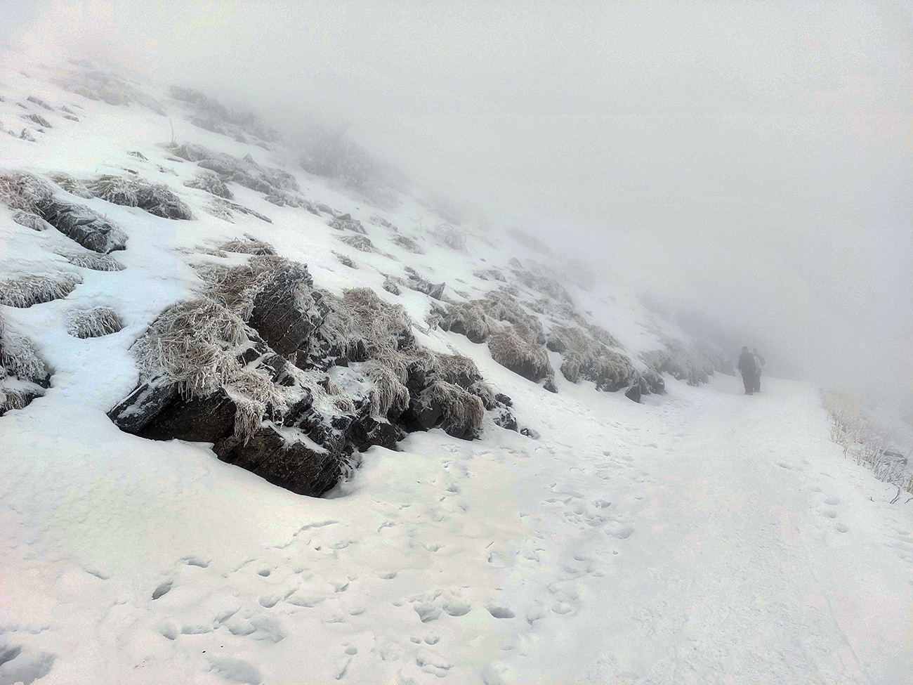 Neviditeľnosť gradovala aj vďaka slzám v očiach, ale dopotkýnal som sa až za Koniarky, do závetria. Opáčiť, či nebude lepšie cez Hole do Bránice zbehnúť. Ale tam chodník nie veľmi prechodený. Červená hrebeňovka tiež zaviata, prepadavá a neviditeľná. Tak nazad do sedla Bublen a davááj dole na Chrapáky, či je priechodný aspoň modrý traverz k lanovke. Samozrejme, že nebol.