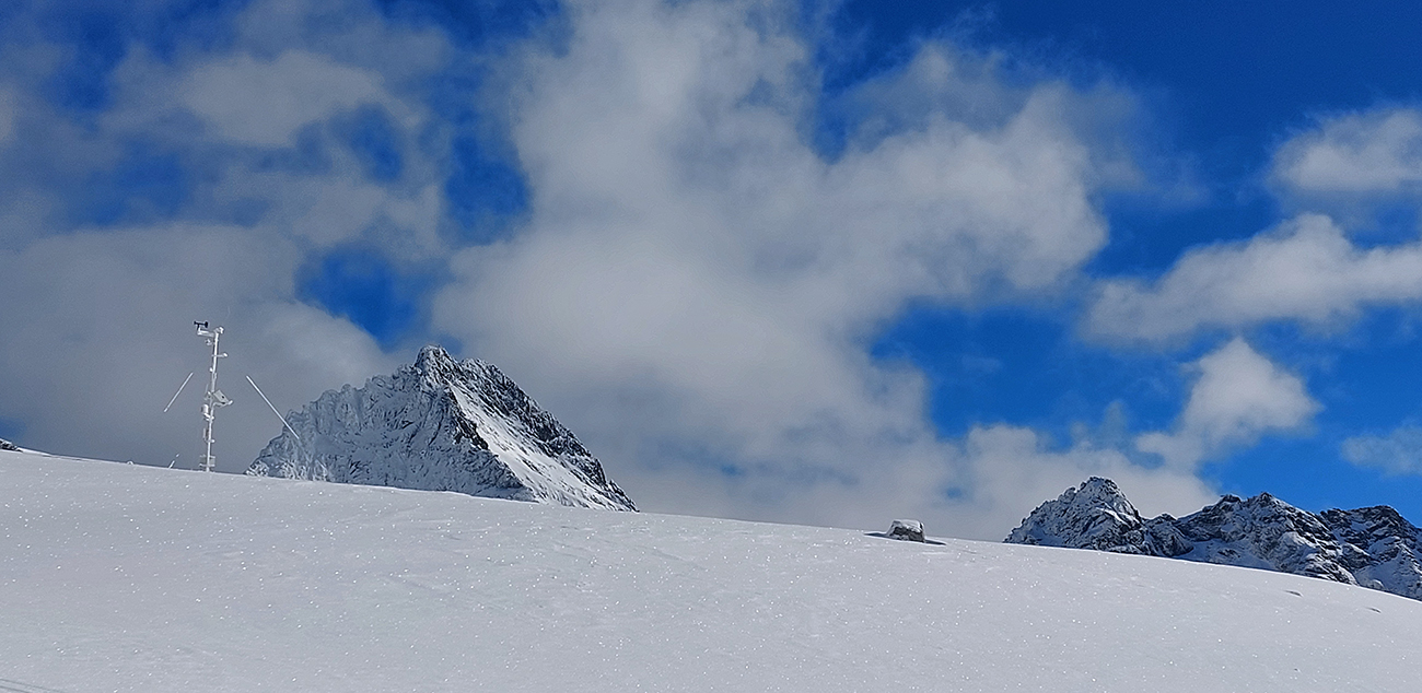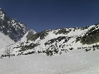 To už sme sa cez strmšie hangy a popri meteostanici prepracovali do Volej kotliny a išlo a do finále. Dno vyzeralo byť bezpečne vysnežené, tak sme sa aj poobzerať mohli – doprava dozadu na Ťažký štít napríklad: