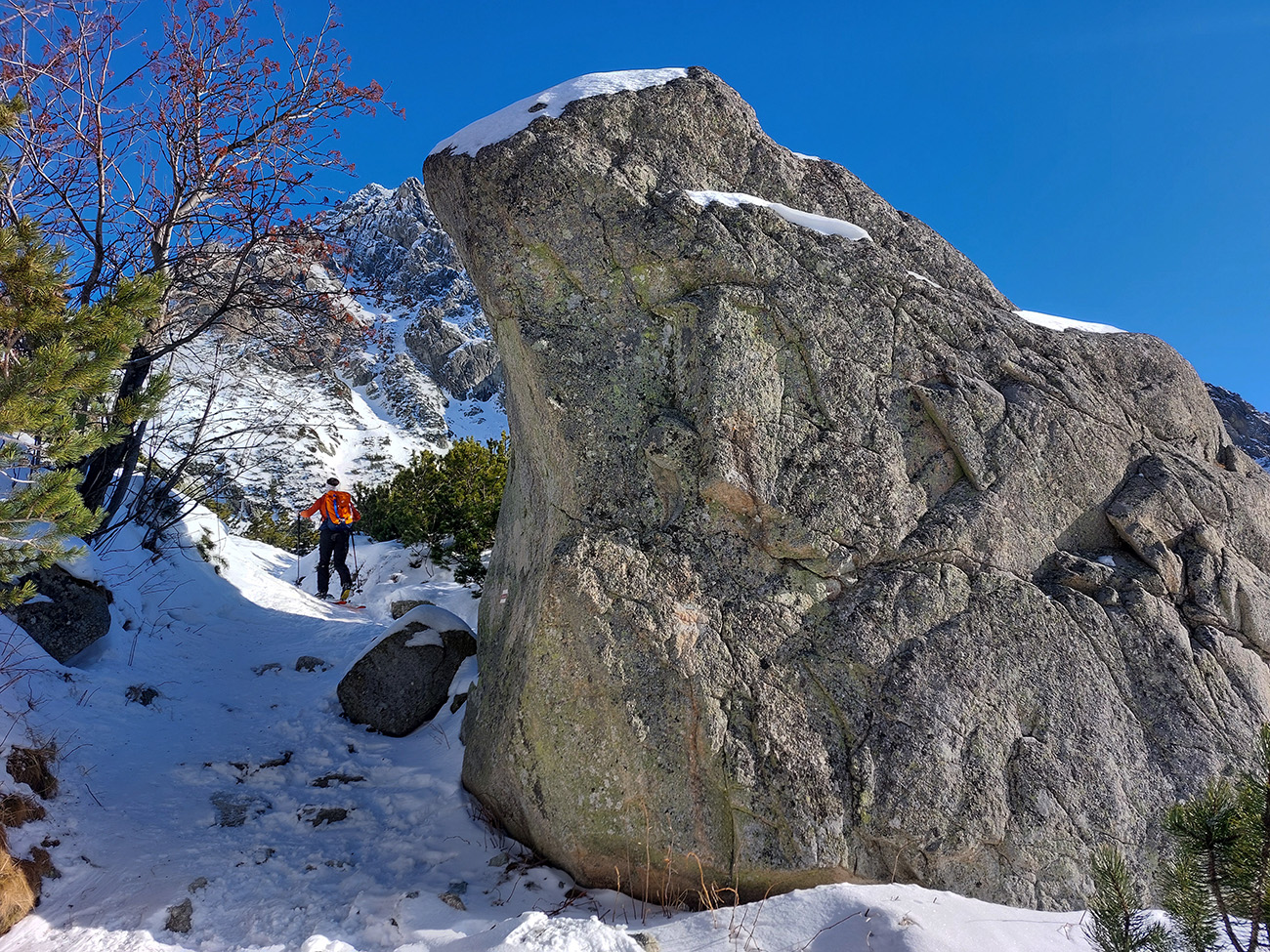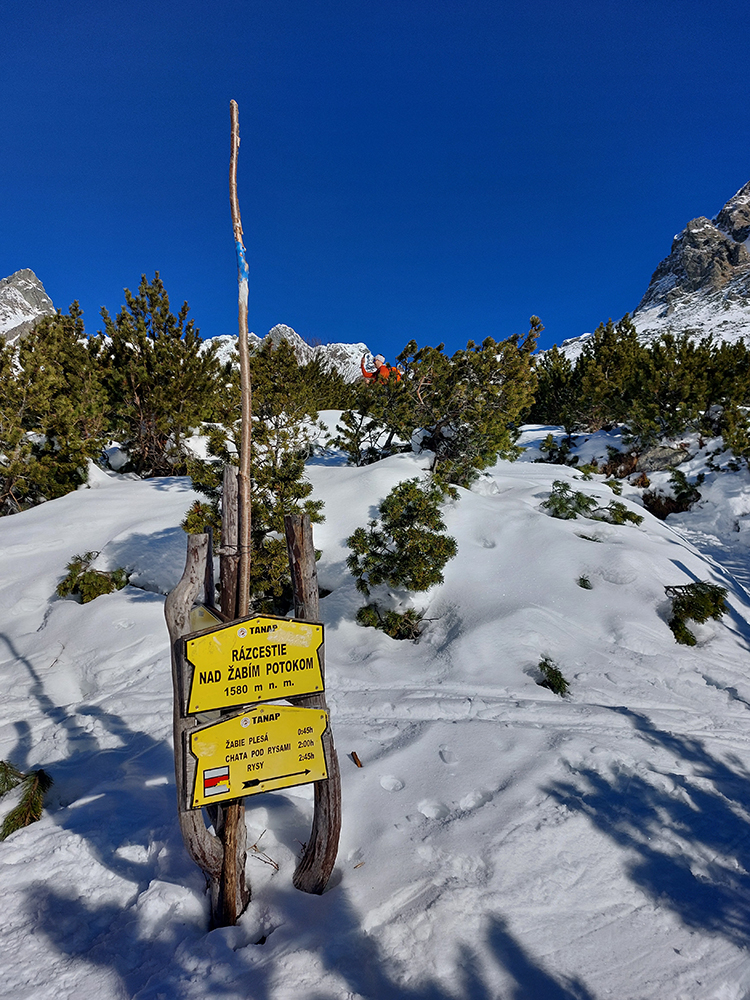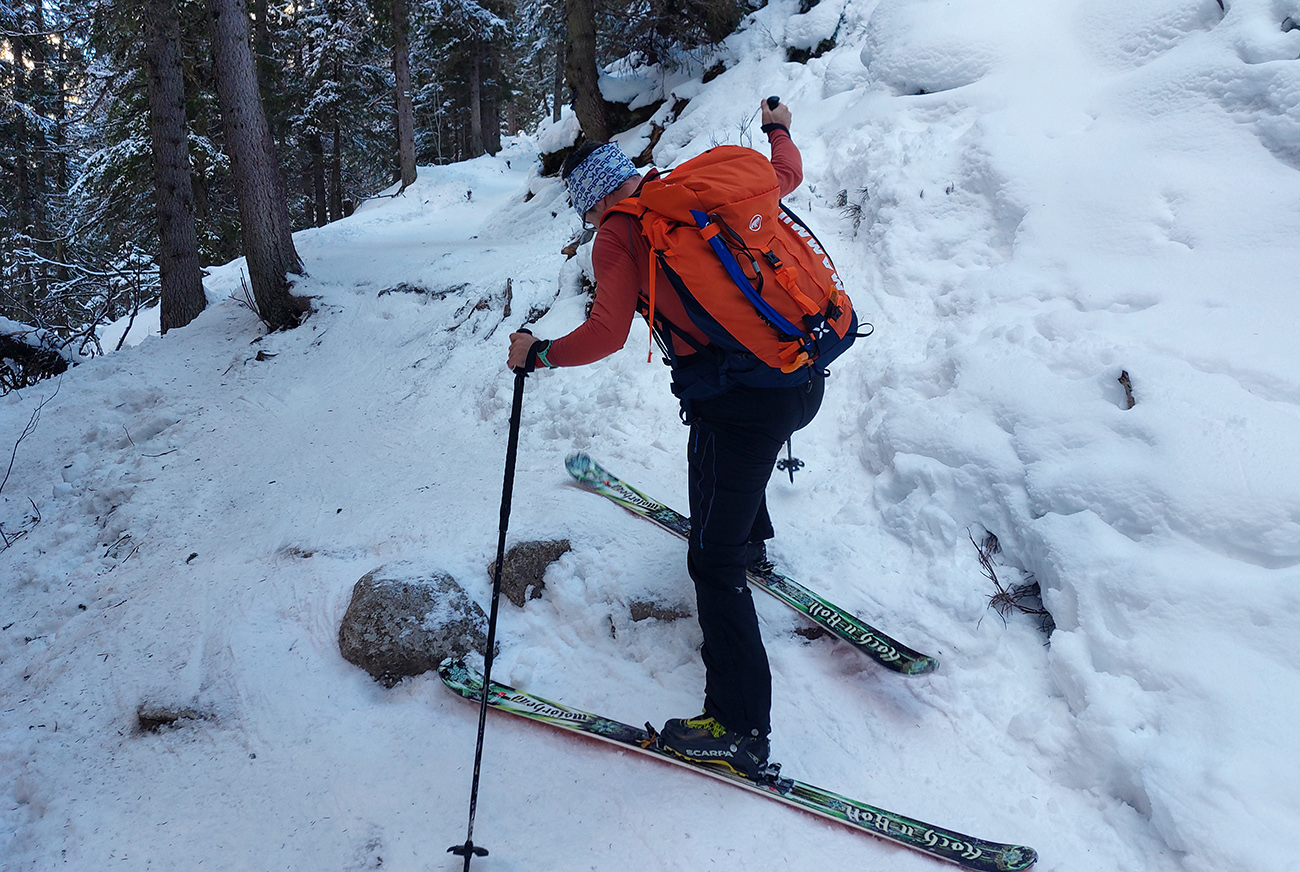 Takže úvod popri potoku vyšmýkaný, zopár skalných schodíkov síce vydretých alebo nezasnežených, ale aj v tejto biede snehovej sa to dalo bez prenášania. Smerom dole by sa to samozrejme nedalo, na to je cesta. Aj za mostíkom cez Hincov potok pár háklivých miest, ale nič hrozné: