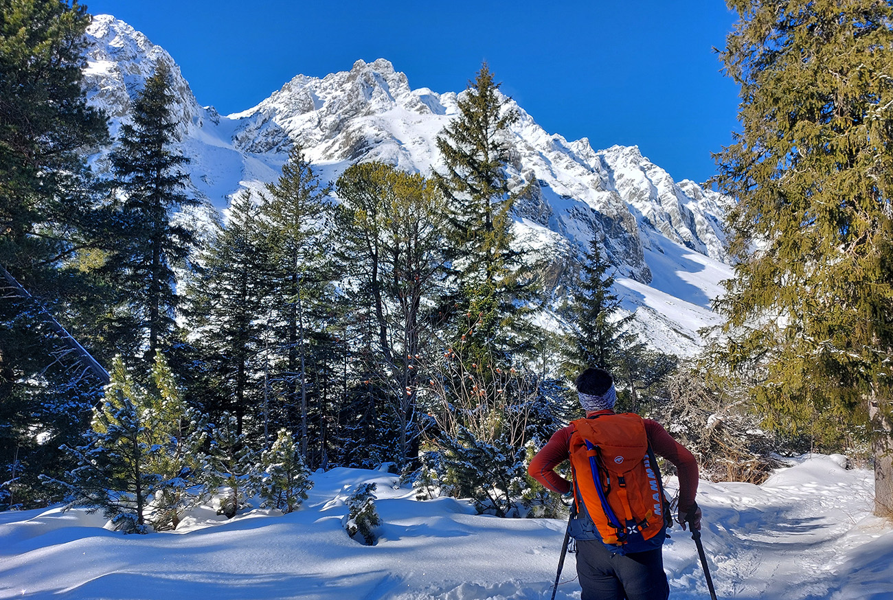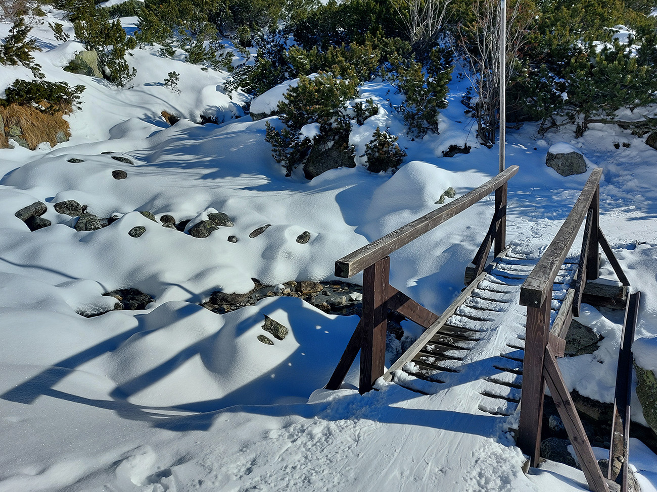 V kosovke potom hadovitý chodník, takmer už bez kameňov. Len raz či dvakrát užšie miesto na potoku a ako inak - slabo vysnežený mostík. Vpredu sa začal vystrkovať Mengusovský Volovec:
