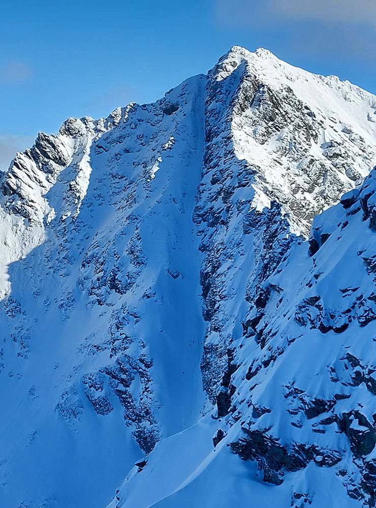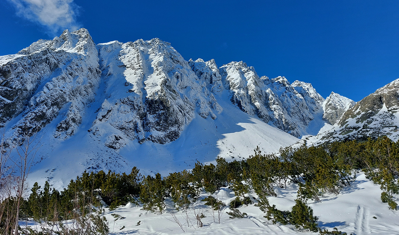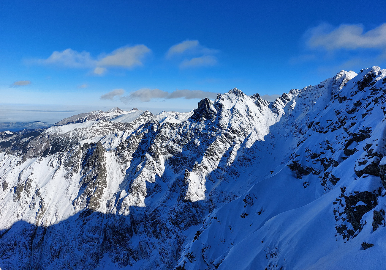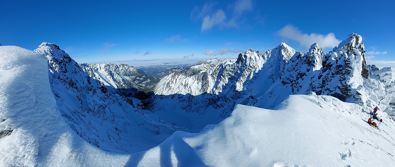 Vstup do Mengusovskej tiež snehová tragédia (zvykáme si, čo už), ale po ujazdenom a primrznutom to hore nevadilo a potom dole sa to tiež dalo risknúť a aj ubrzdiť alebo obísť, kde bolo treba. No hlavne – začali sa otvárať výhľady, ako tento na hrebeň Bášt: