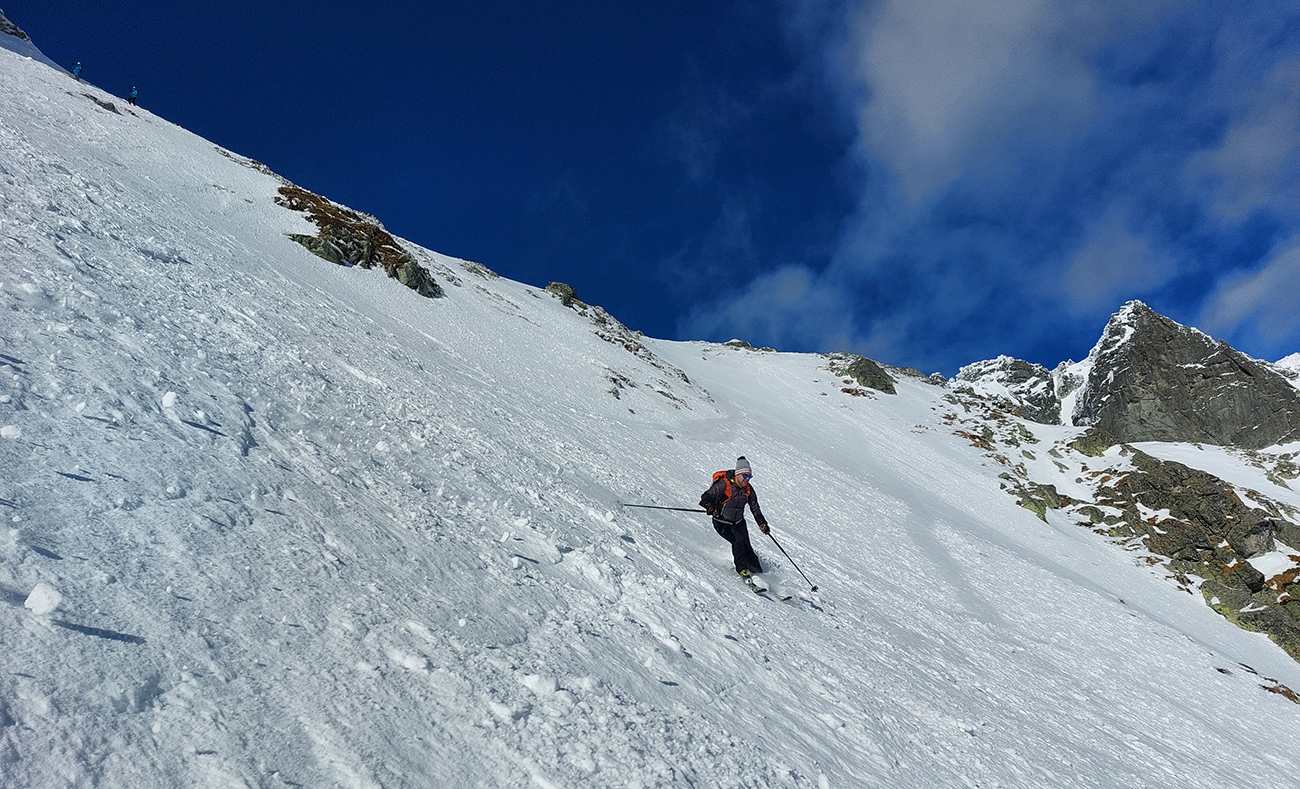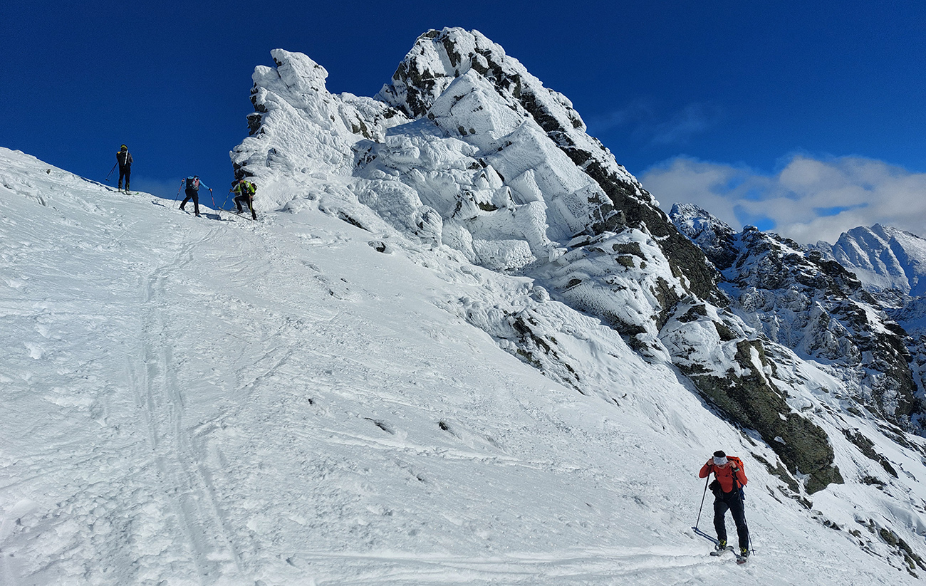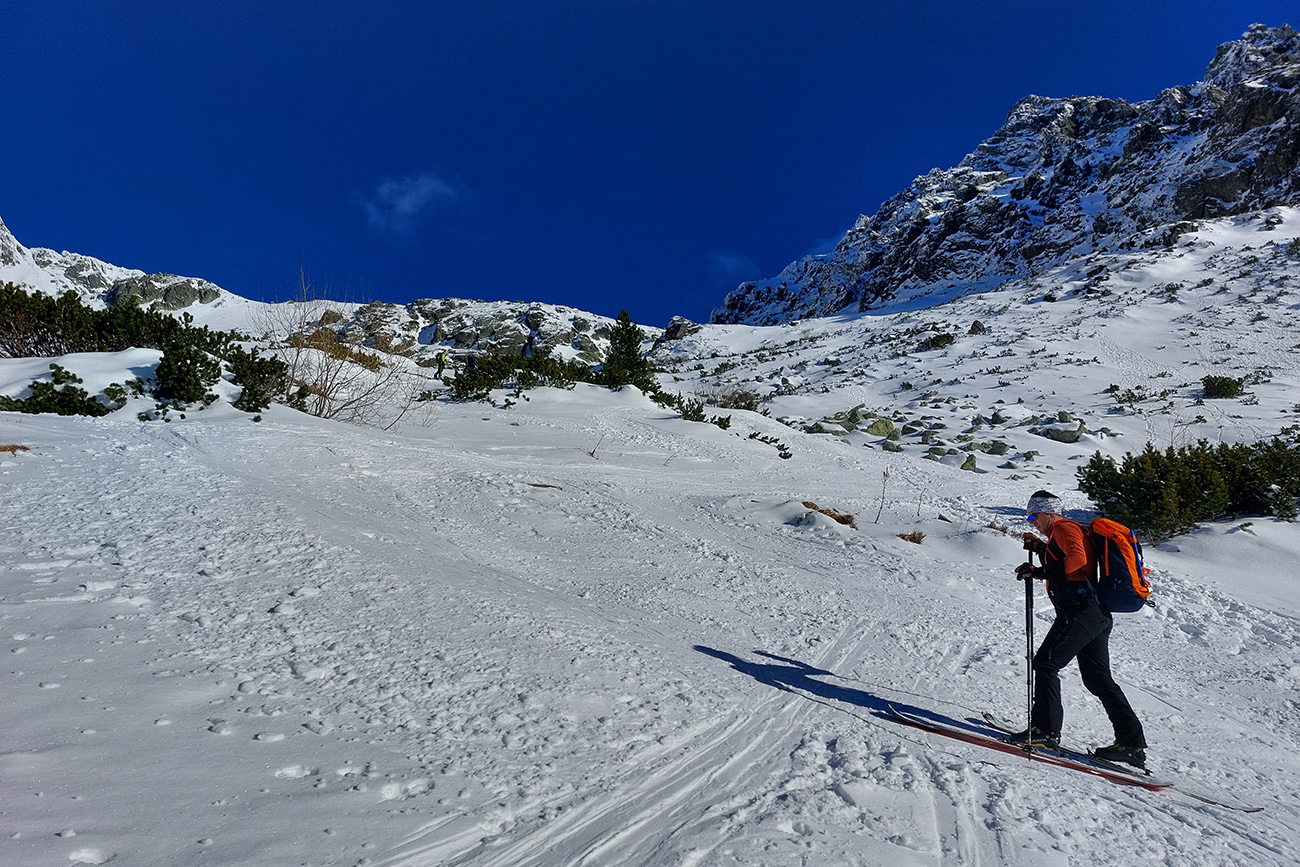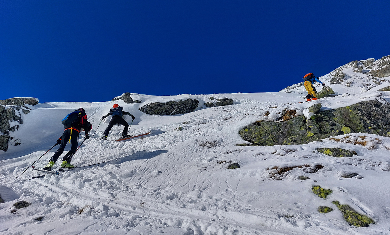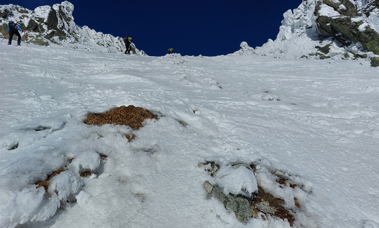Rozhodli sme sa pre Nižnú Hincovu priehybu, teda vľavo od Západného Volieho rohu. No stopy naťahané všade a aj mravce sa všade mrvili. Niektoré už od radosti ujúkali dole kopcom. Lenže občas sa ozvalo aj nepríjemné zaškrípanie. Každopádne nám o lyžbu nešlo, tak sme sa vrhli do finálneho výšvihu po komfortnej stope. Srdečná vďaka predlezcom.
