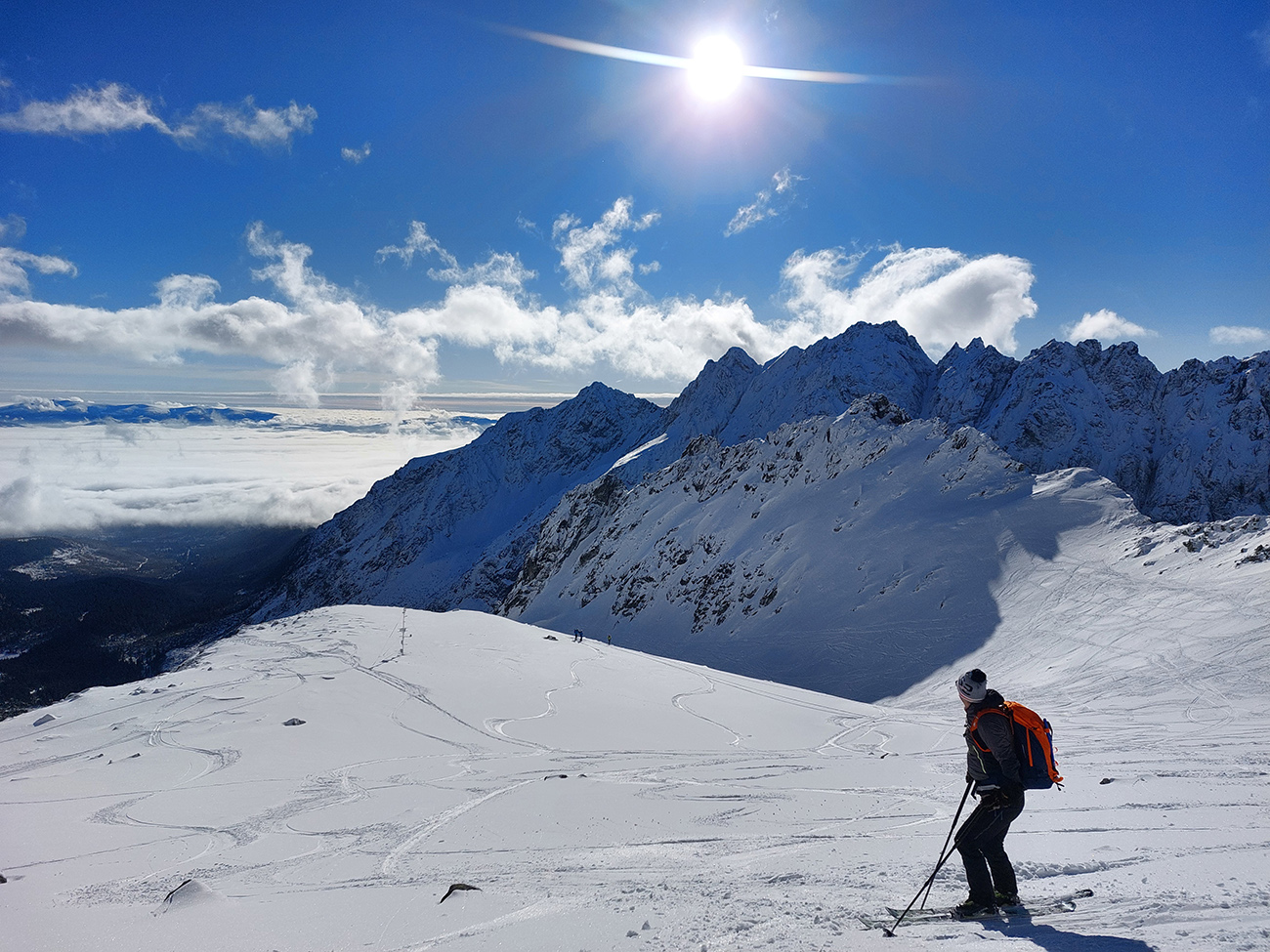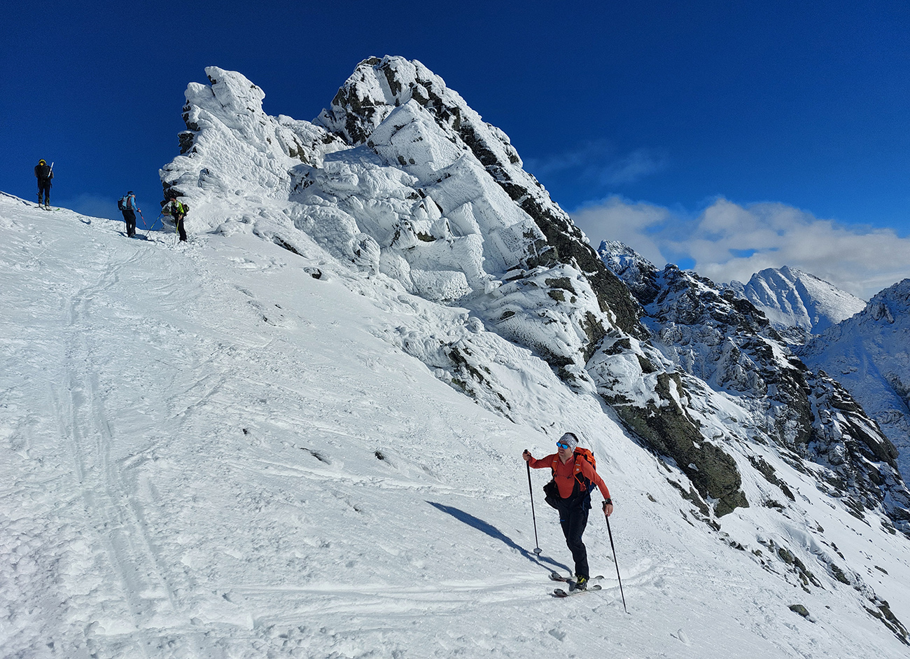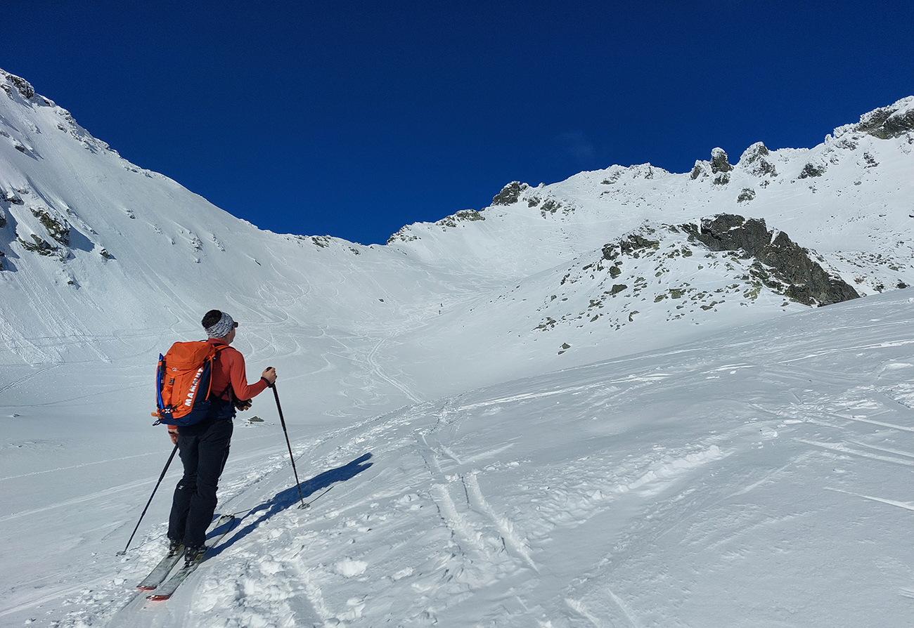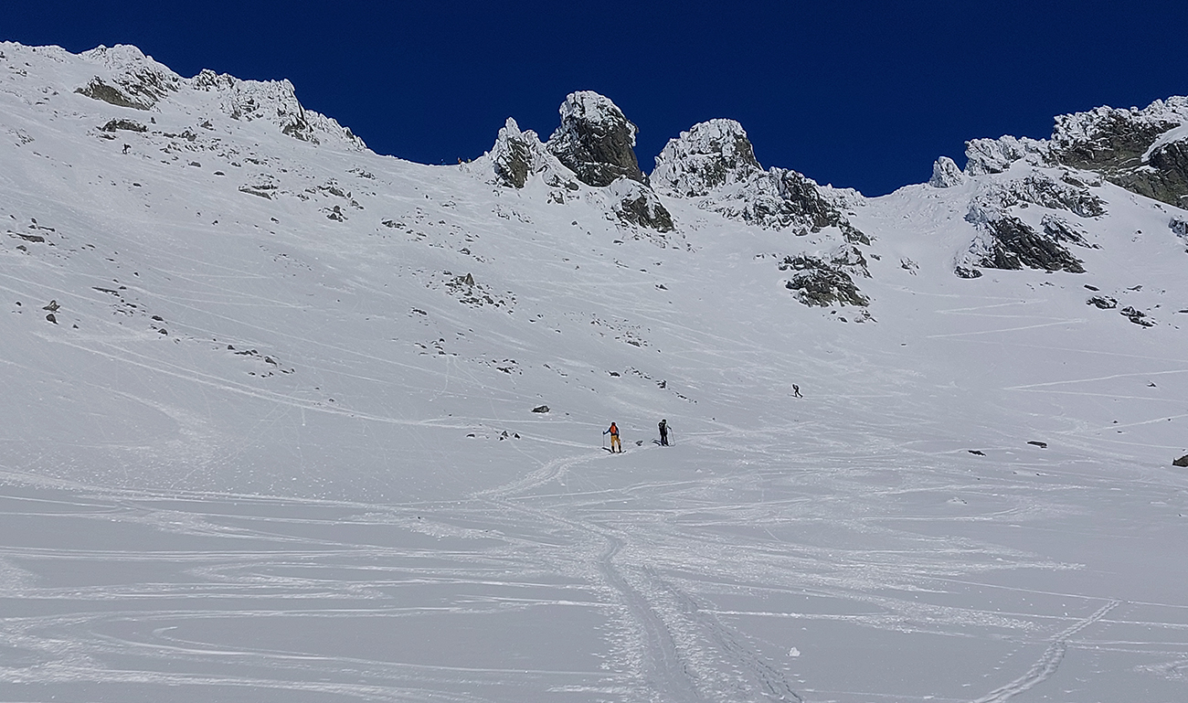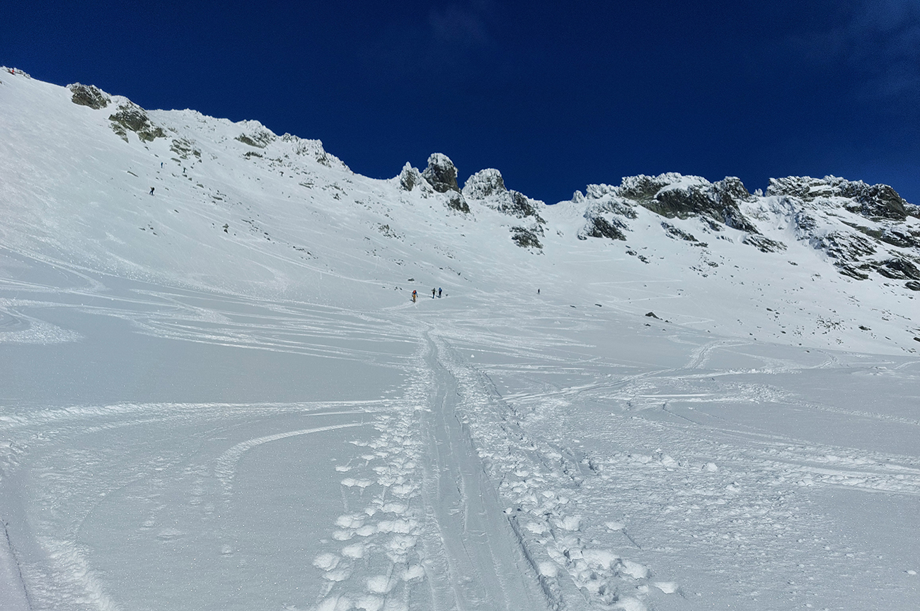 Rozhodli sme sa pre Nižnú Hincovu priehybu, teda vľavo od Západného Volieho rohu. No stopy naťahané všade a aj mravce sa všade mrvili. Niektoré už od radosti ujúkali dole kopcom. Lenže občas sa ozvalo aj nepríjemné zaškrípanie. Každopádne nám o lyžbu nešlo, tak sme sa vrhli do finálneho výšvihu po komfortnej stope. Srdečná vďaka predlezcom.