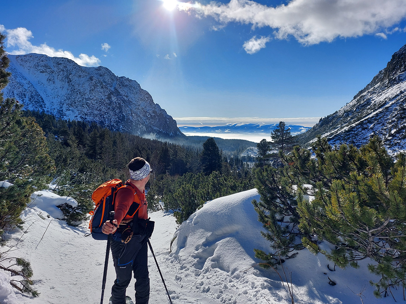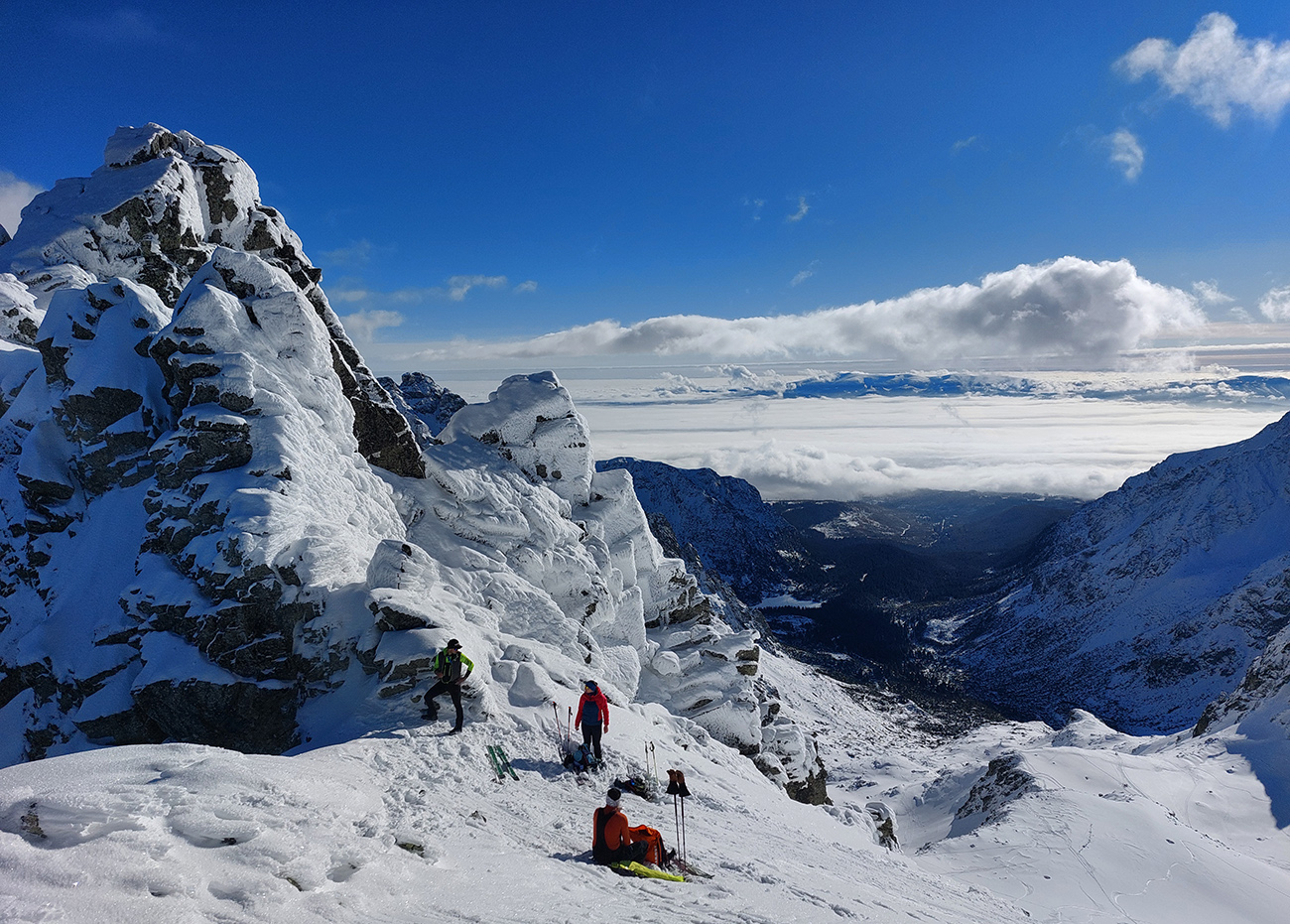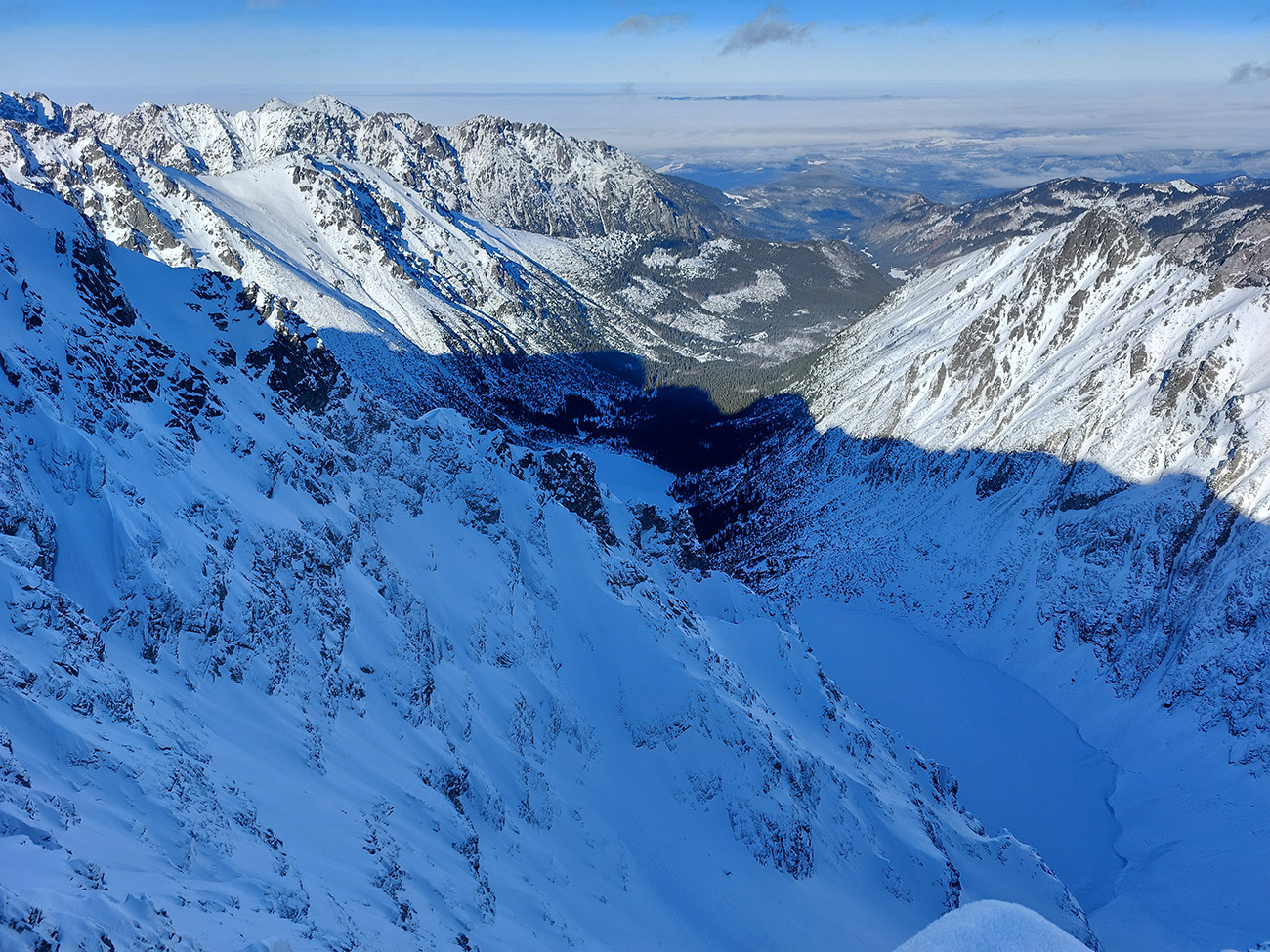 Podľa mnohých zdrojov vraj jedna z najkrajších tatranských skialpových túr. Navyše v takom počasí, aké sa tu koncom januára často nevyskytuje: jasno, bez vetra, s teplotou jemne pod nulou. Dole v kotline vysoko nastlaná inverzná perina, vyliezli sme nad ňu až nad Štrbou - Lieskovcom. Jednoducho v posledný deň januára sa spravilo také okno v sivote, že ažžžž. Takže nebolo čo váhať a neboli sme samozrejme sami: od zastávky Popradské pleso hore lesom od vodárne, cez potok a len kúsoček po ceste. Mengusovskou dolinou po Rázcestie nad Žabím potokom a odtiaľ doprava po pláňach, popri meteostanici pri Vyšnom Žabom plese do Volej kotliny a do finále hore na hrebeň. Otočka na „granici państwa“ v Nižnej Hincovej priehybe, pod dohľadom Západného Volieho rohu. Koniec miestopisného úvodu, dole rovnako, akurát od PP po ceste, samozrejme. GPX je hore, takto sme ťapkali:
