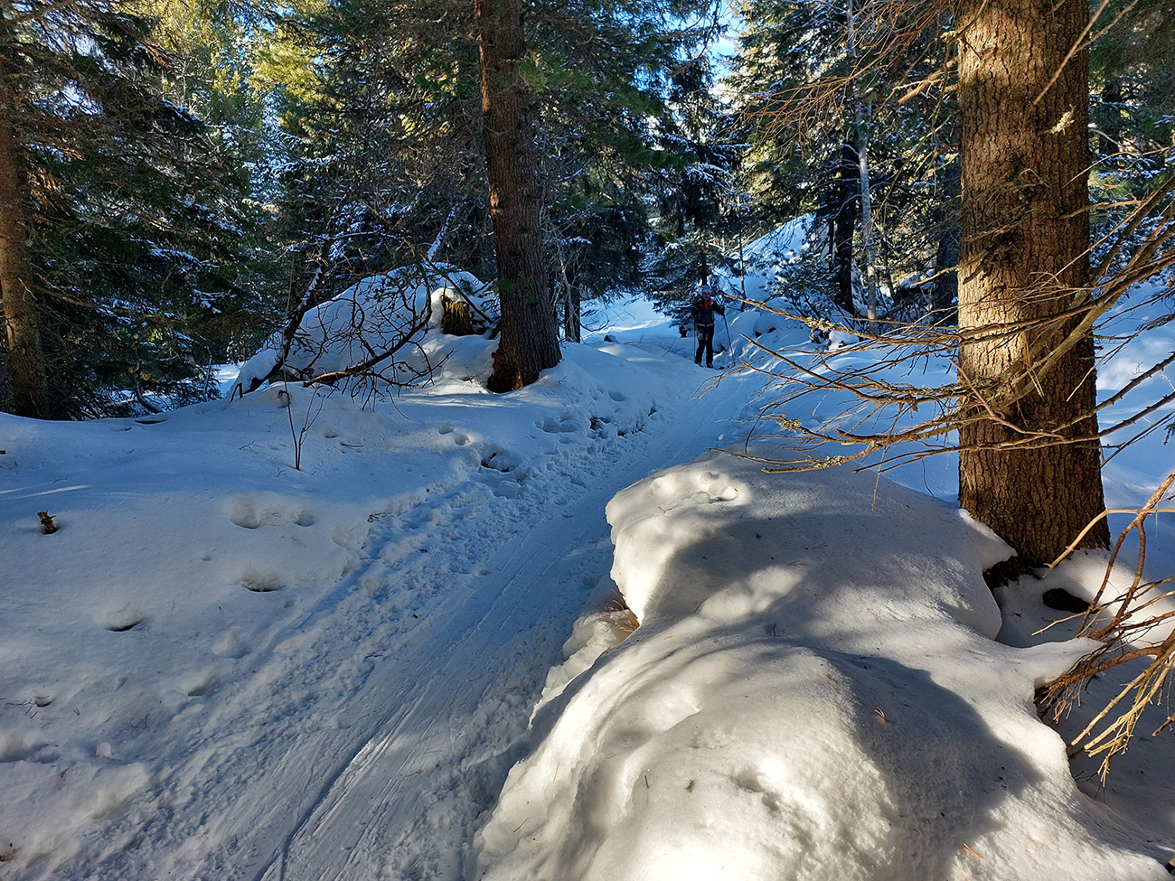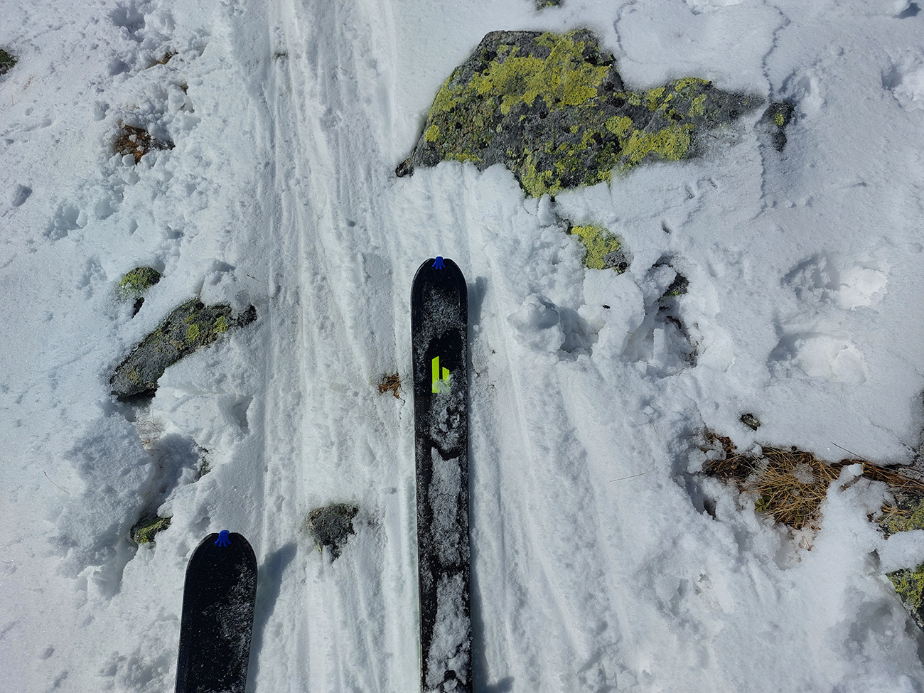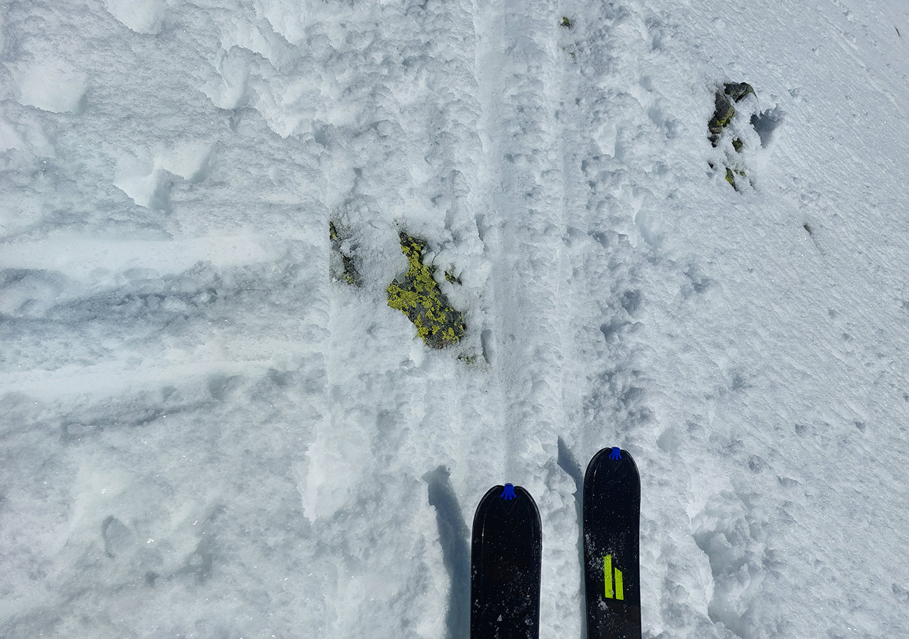 Nebolo sa kam náhliť, pohodička akurát taká poludňajšia, ale zas aby nohy nestuhli, začali sme sa tiež po chvíli dole spúšťať. Napriek opatrnosti v úvodnom strmom svahu nejaké tie škrtance zazneli, ale nič tragické. Potom už lepšie a dole v kosovke už zákruty preleštené, čiže zákernosti viditeľné.