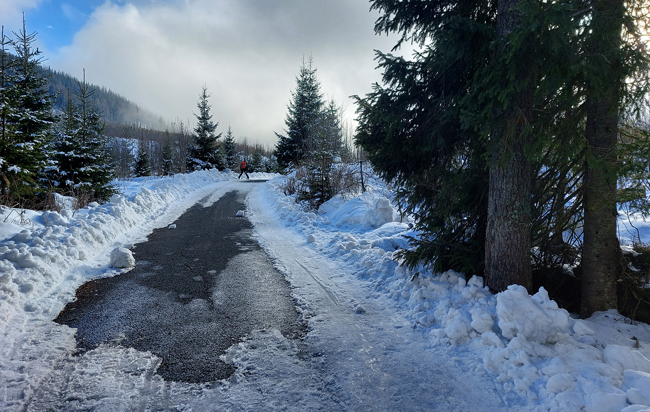 A to je skoro všetko, lebo k Popradskému už to išlo samo, a lepšie ako sme čakali cestou hore. Dalo sa všetko ubrzdiť alebo obísť. Aj cesta v pohode, až na záver, obrátený proti slnku, kvalitne odpluhovaný (snehové hrče na okrajoch) a vytopený na asfalt. Niekde ledva pásik na sklz po jednej lyži. Viacerí radšej vyzúvali, ale aj to sa dalo obkľučkovať cez kríky povedľa.