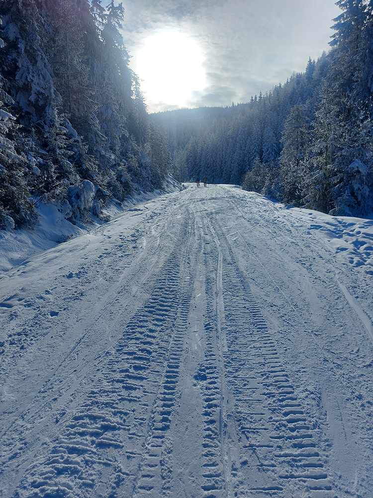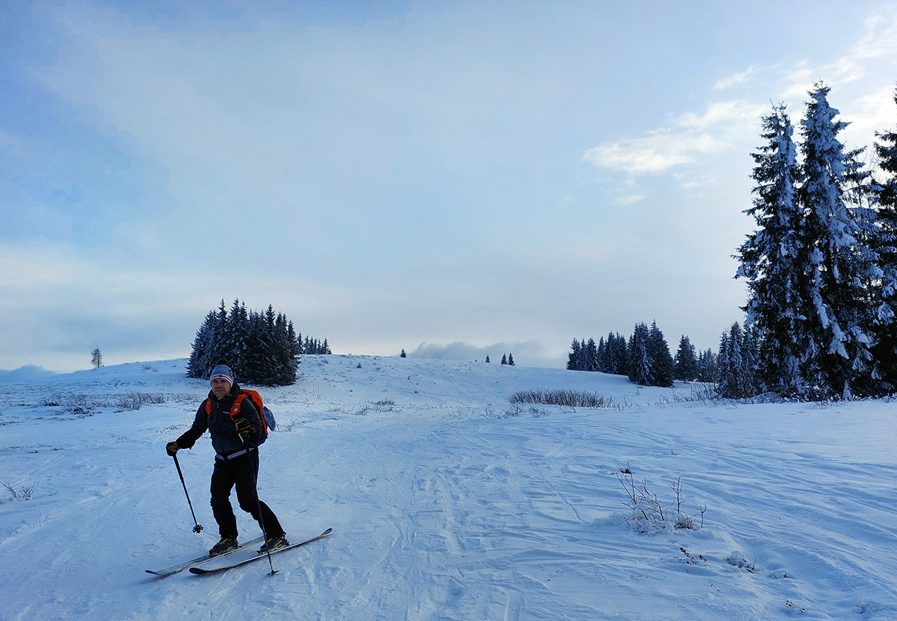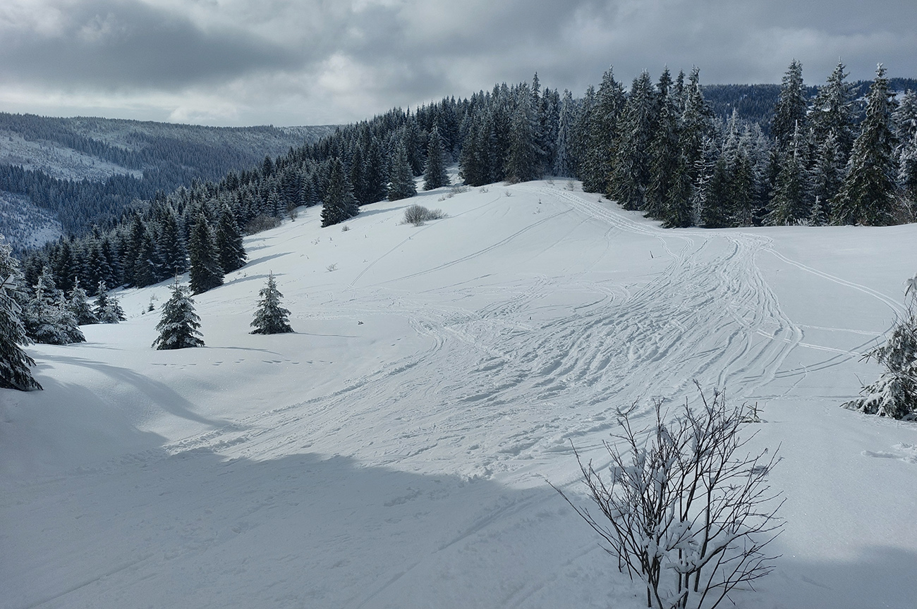 Potom už pohodlná šúchačka, skoro po vrstevnici. Zvyšky lesa obielené, počas takejto zimy to tam vyzerá stokrát lepšie ako v lete.