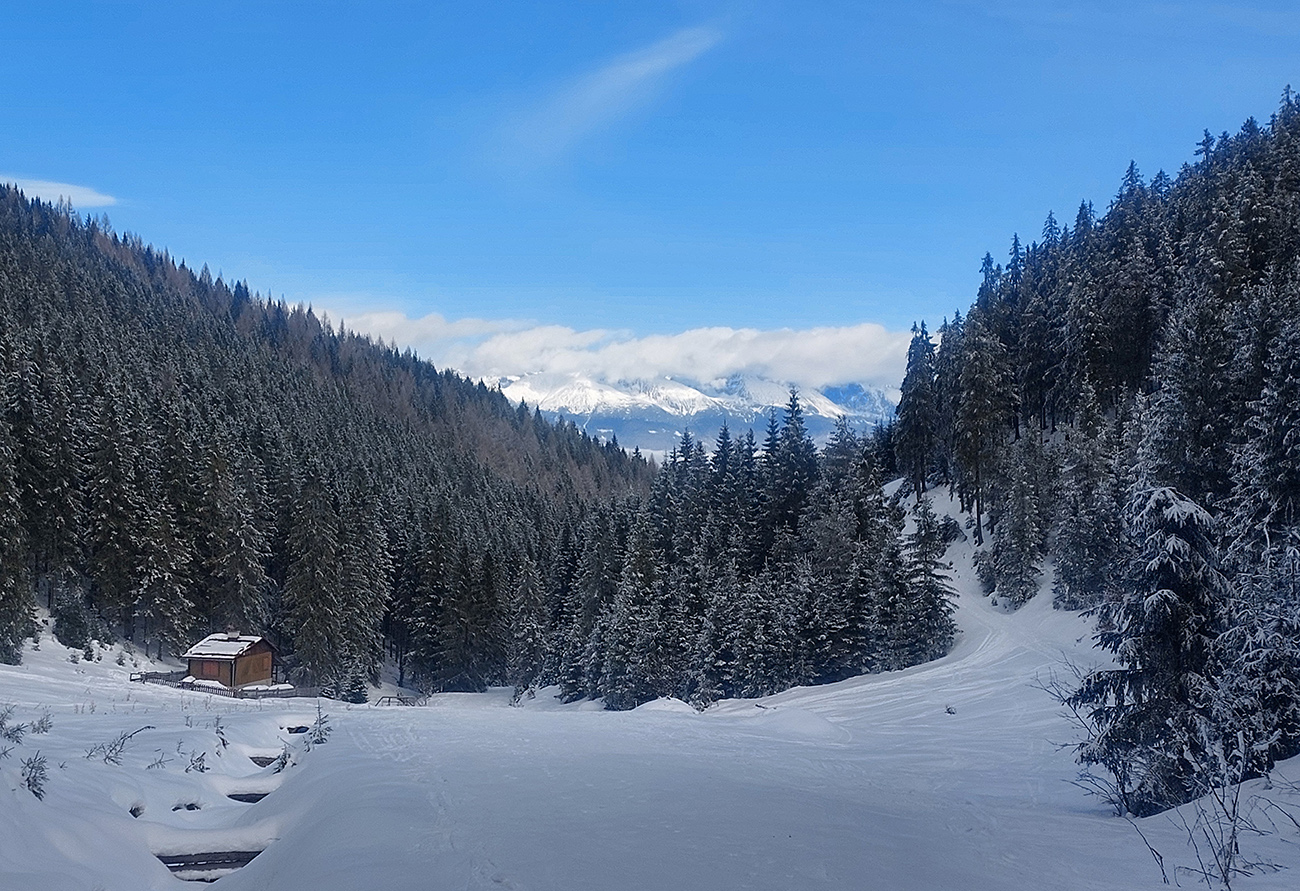 Prvý februárový pondelok bolo hlásené posledné okno ako – tak pekného počasia, aj to len vo väčších výškach. Na väčšine územia sa váľali nízke mraky a hmly. Lenže namlsaní nedeľnou Mengusovskou dolinou ( TU ), nechcelo sa nám v mlieku plávať. Skituristicky populárne kopce nad Liptovskou Tepličkou sa síce zdali dosť vysoké, ale rozhodli sme sa až cestou a dobre sme spravili. V Tatroch už podľa výhľadov z auta nebolo také ažúro ako v nedeľu. Aj cestou sa po kotlinách váľali kadejaké sivoty, našťastie už v podhorí Kozích chrbtov nič, nad hlavou modro, okolo cesty bielo, žiarivo. Mala to byť viac socializácia ako skitúra, tak sme ani poriadne nevedeli kam dôjdeme a kde to otočíme, že podľa počasia, podmienok a nálady. Výhoda začiatku poza vleky na Smrečinách ale taká, že známa cesta dolinou smerom pod Panskú hoľu umožňuje šliapať aj trom vedľa seba. A sklon mierny, takže je to na vykecávanie. Tak sme aj začali:
