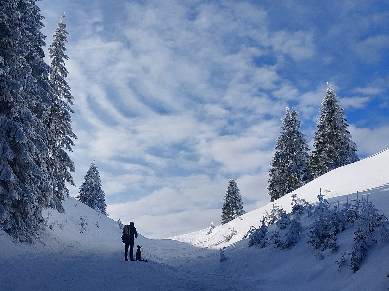 Ozaj parádna „zjazdovka“ to bola, aj nejaké stopy po menčestri na nej, takže ju isto aj mašinou prebehli. Poriadne nesnežilo už dlho, tak aj do viacerých domorodých odbočiek stopy naťahané a vyleštené - preskúmame nabudúce. Mrzlo fajne v doline, ale na slnku sme sa rýchlo pozohrievali, joj paráda!