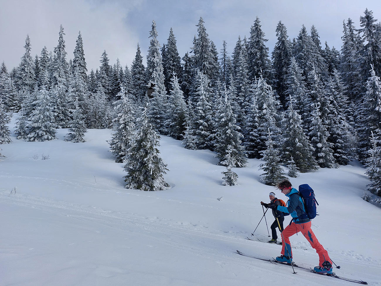 A vôbec to po odmäkoch nebolo ľadové, na starom firne ľahký, premrznutý poprašok, pohodlné! Takže super aj neskôr, pri zjazdoch na pásoch – netrpeli chlpy na ľade a ticho bolo. Hore nad lesom pekný spätný výhľad na Tatry, kde sa ozaj na hrebeňoch dáke chuchvalce držali, zdalo sa:
