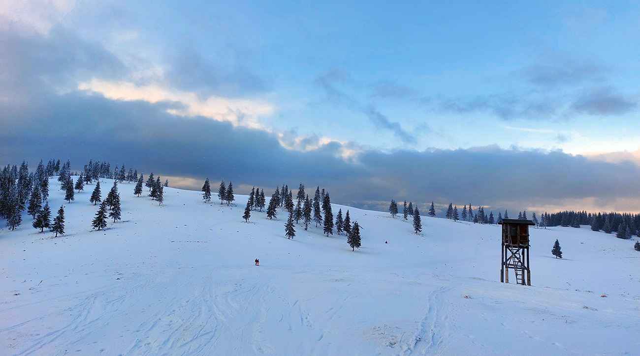 A z Panskej hole samozrejme ďalej na pásoch: po pláňach popod Smrečiny až nad vlek, nech je zmena. Tam už sa viac ľudí korzovalo. Slnko sa definitívne sklonilo a skrylo za sivú hradbu, tak aj okolie trochu stmavlo, ale severy stále ožiarené.
