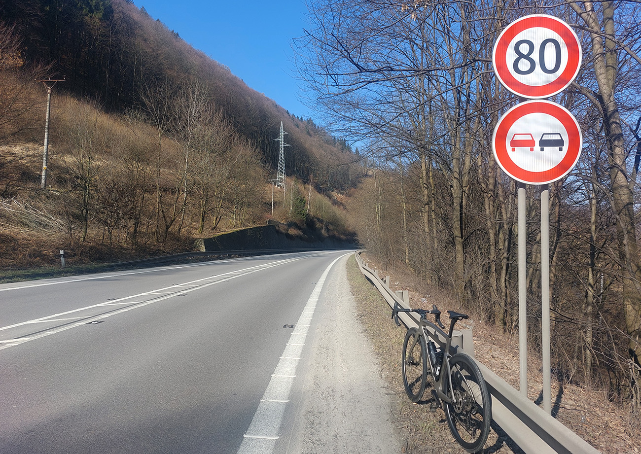 Špinavá krajnica (hádam len dočasne), vrúbkovaná biela čiara a odrazky v asfalte (furt) síce nepridávajú na komforte jazdy a na možnostiach prípadného uhýbania, ale aj tak miesta dosť, autá ani nemusia smerovkami blikať, obídu cyklistu vo svojom pruhu. Samozrejme, že jeden trúbiaci bezmozog sa našiel, ale na to už som zvyknutý.