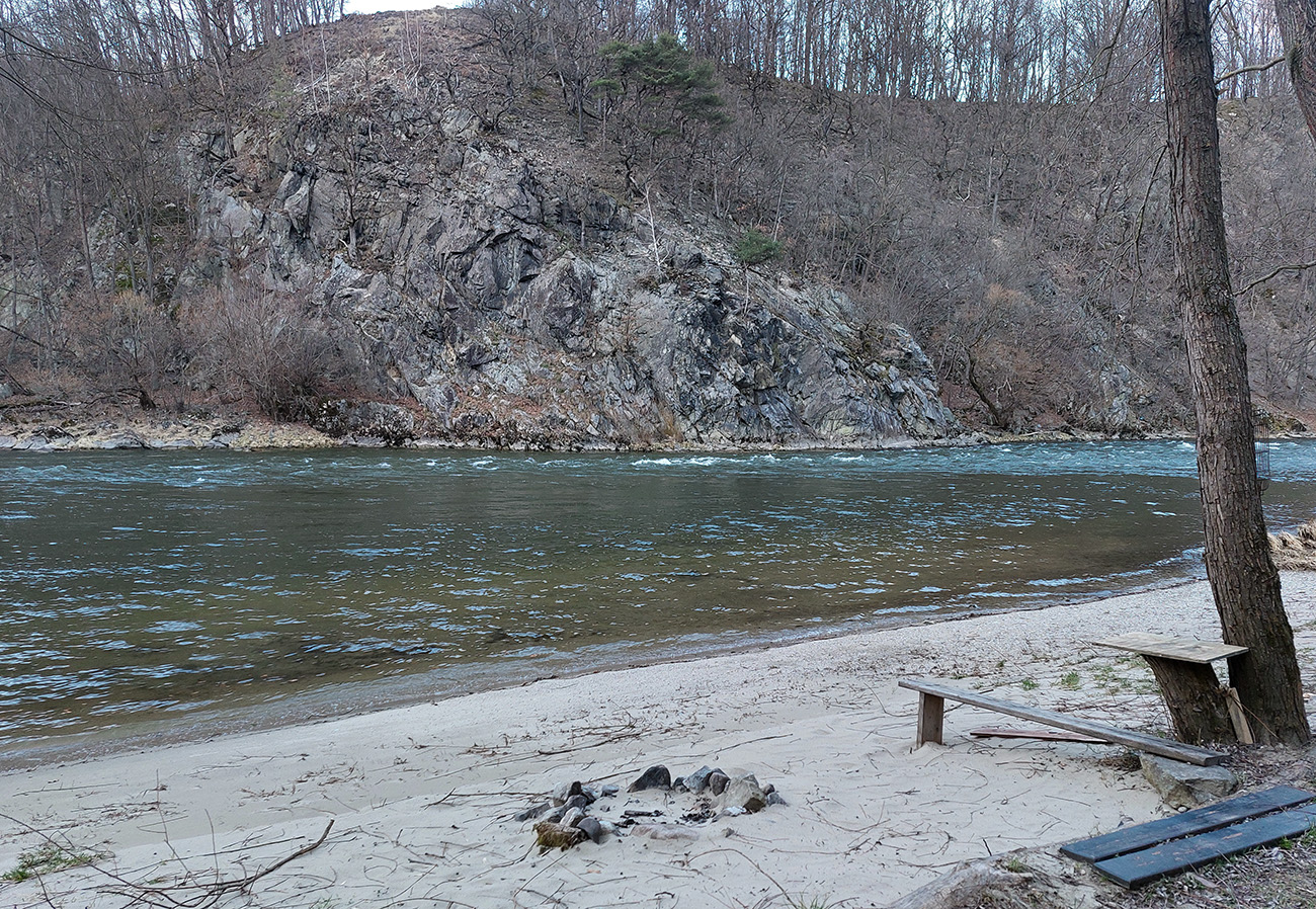 Hneď za niekoľkými prvými zákrutami sa na pravom, opačnom brehu začínajú ukazovať bralá rezervácie Krivé, ktoré padajú až pod hladinu. To najznámejšie bralo odstrelili koncom 19. storočia, keď už takmer žiadnym pltníkom nehrozilo rozbiť sa na ňom. Besná skala je prvá z dvojice, známej aj z miestnej legendy o žiarlivej vdove a jej krásnej chovankyni. Práve od Besnej začína Váh obtáčať prvý, menší meander – Krivé. Inak priamo oproti skale je na ľavom brehu príjemná piesková pláž, keby niekto chcel: