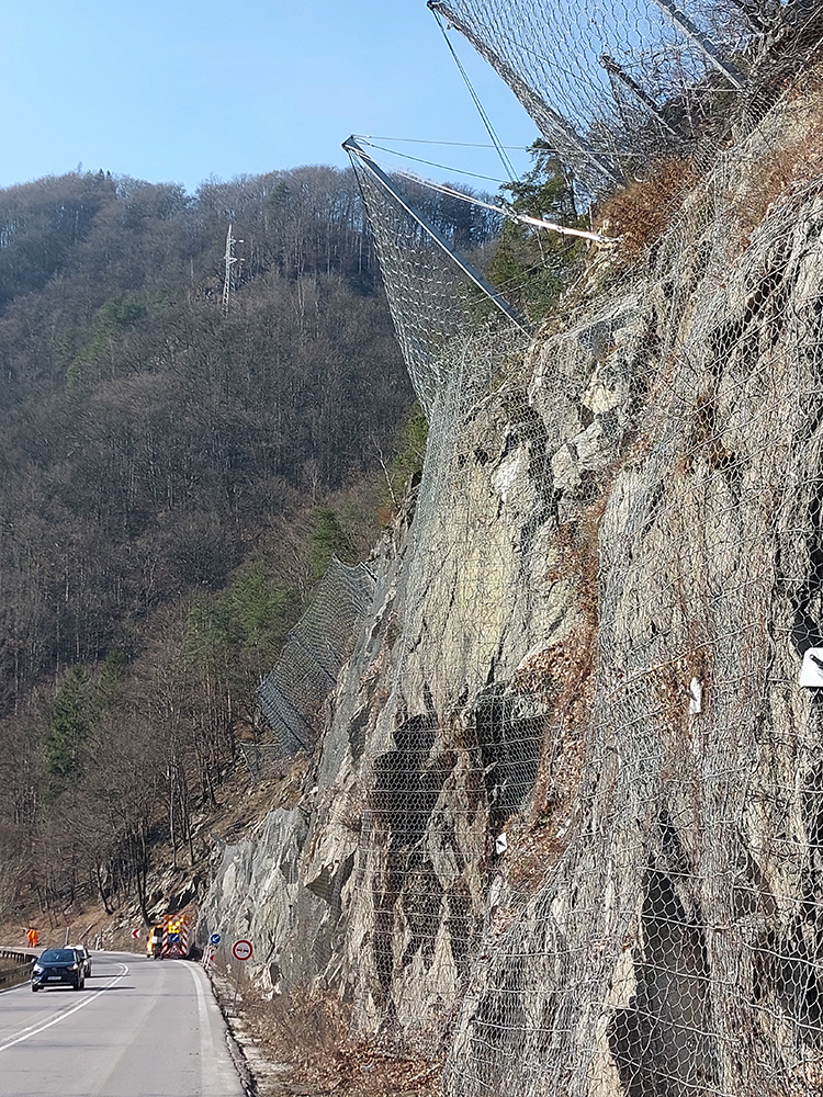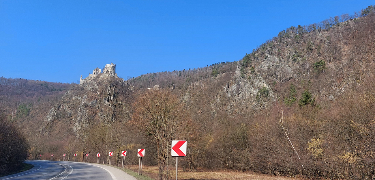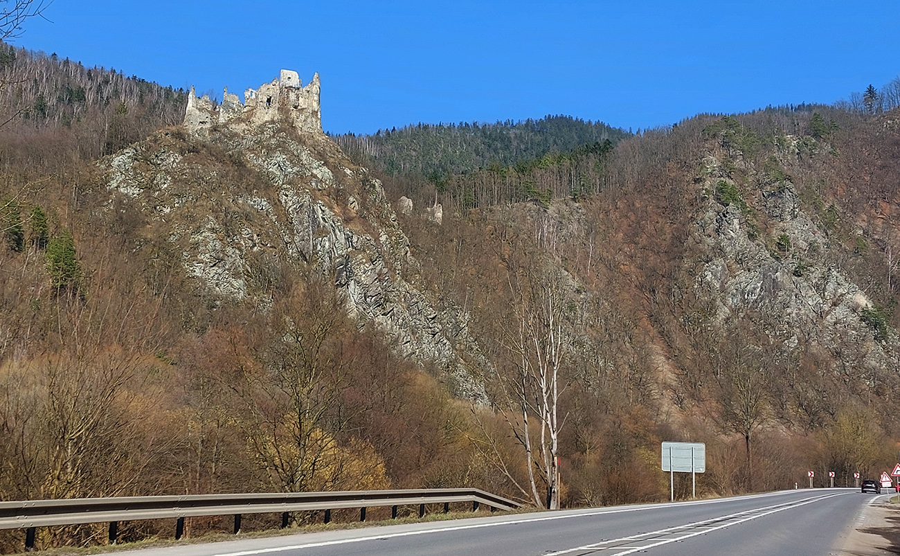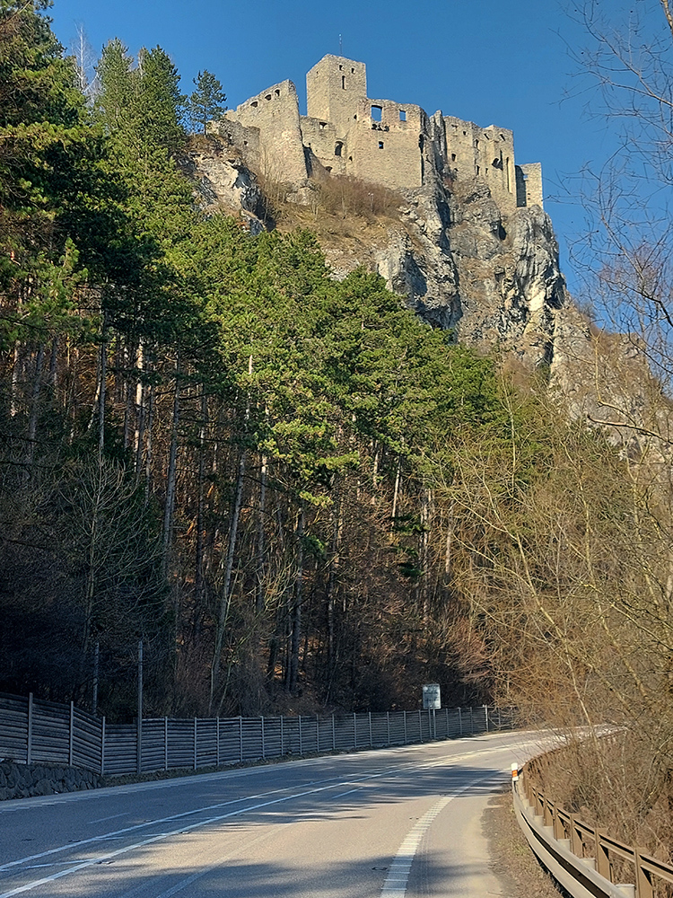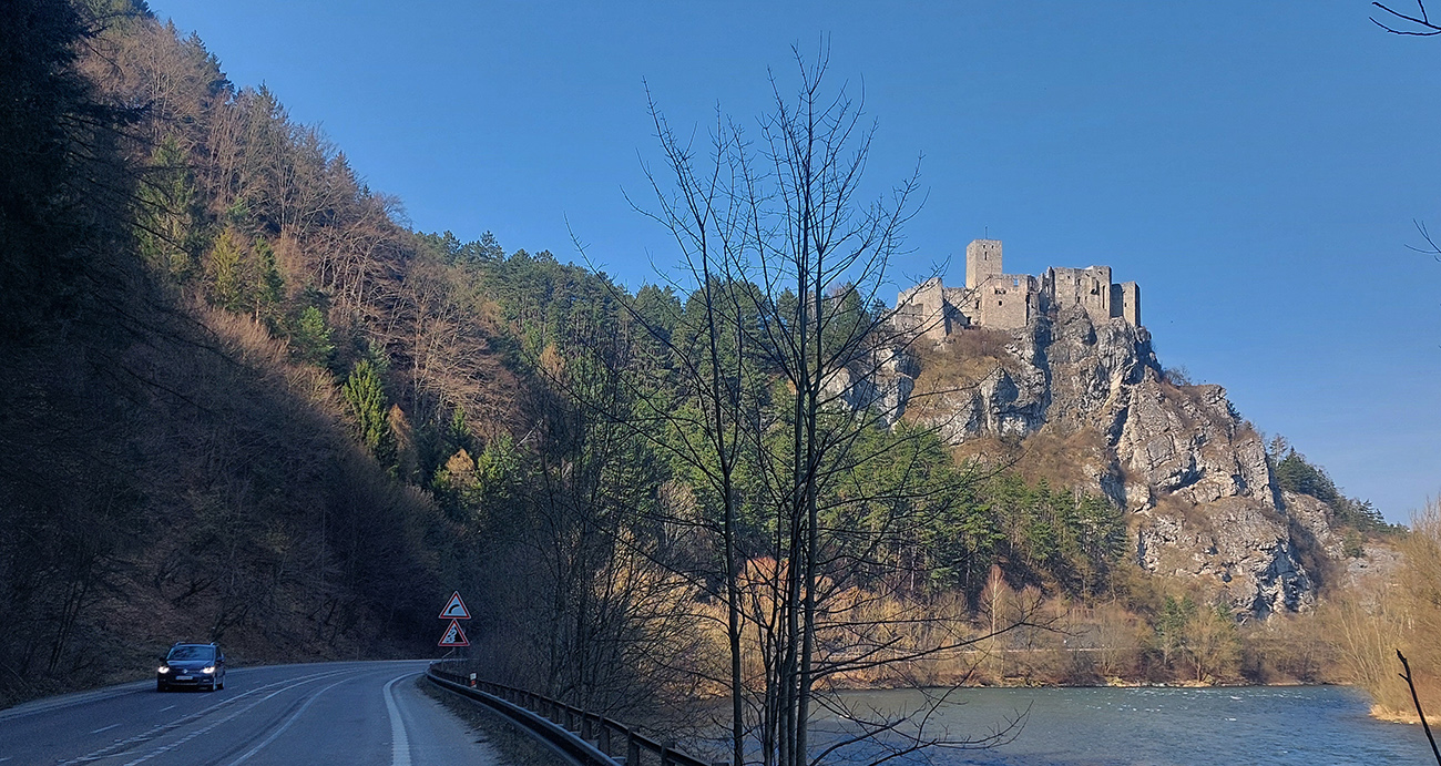 No a samozrejme, Starhrad ani nestihne zmiznúť vzadu a vpredu už sa na brale nad cestou vyníma navštevovanejší a zachovalejší hrad Strečno alebo nový hrad. Aj keď má len o pár desiatok rokov menej ako starý. Cesta k nemu je poriadne „osieťovaná“ a pod (dúfajme) dostatočne zabezpečeným bralom je koniec strečnianskeho prielomu – točím cez parkovisko do podjazdu, idem si dať ten okruh okolo vodného diela.